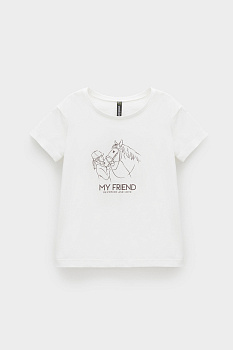 Футболка для девочки из высококачественного трикотажного полотна. Оригинальный принт выполнен из стойких текстильных гипоаллергенных красителей. Для удобства предусмотрена застежка на 2 кнопки в размерах 92 и 98.