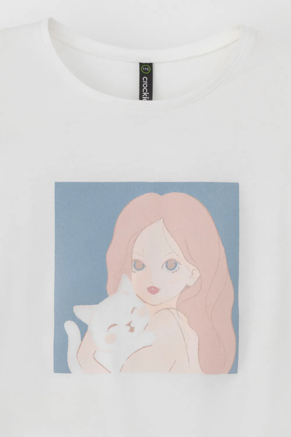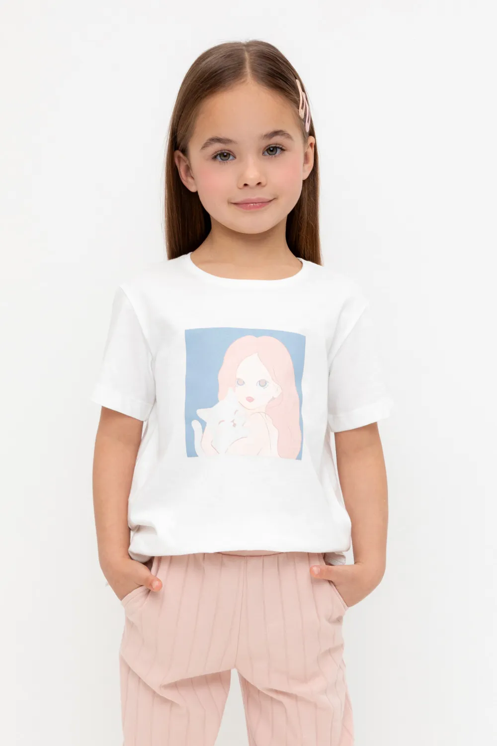 Футболка для девочки из высококачественного трикотажного полотна. Для удобства одевания имеется застежка на кнопки в размерах 92 и 98. Оригинальный принт выполнен из стойких текстильных гипоаллергенных красителей.