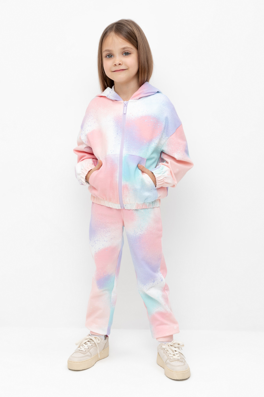 Трикотажные брюки для девочки из мягкого петельчатого футера. Эластичный пояс на резинке, по бокам два удобных кармана, внизу эластичные манжеты.