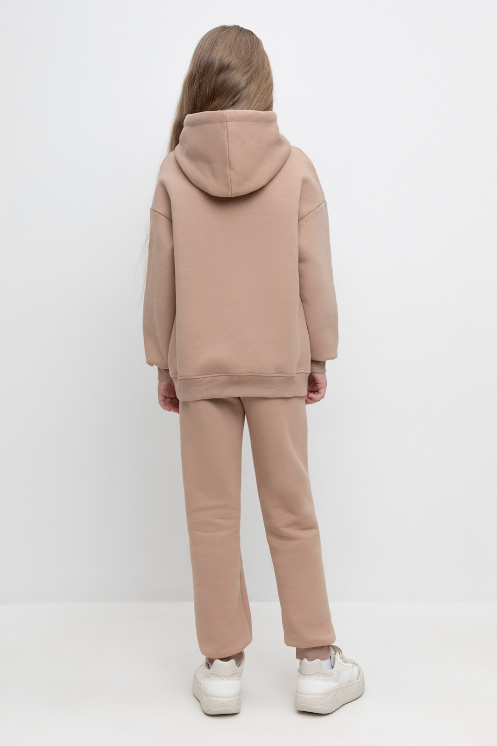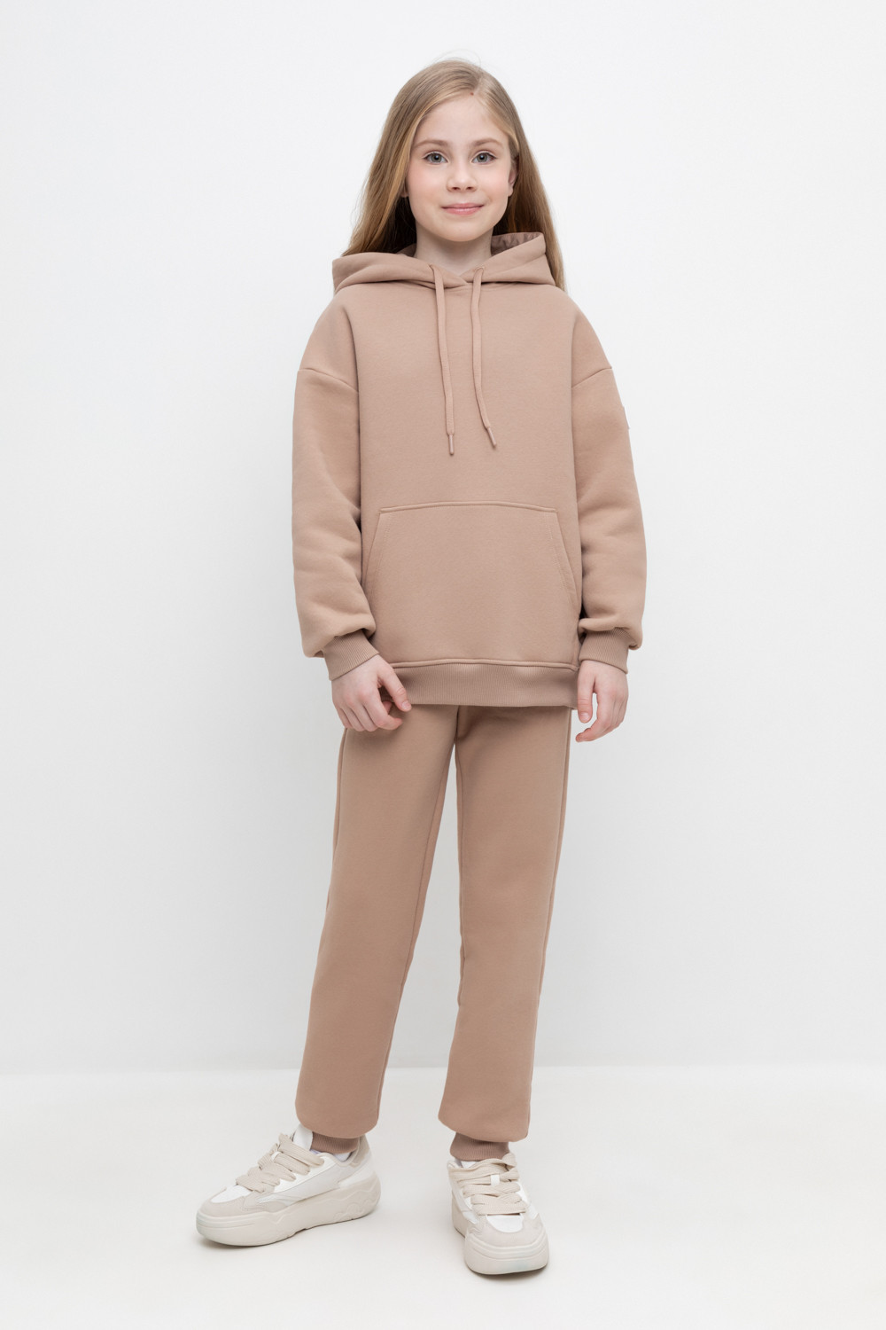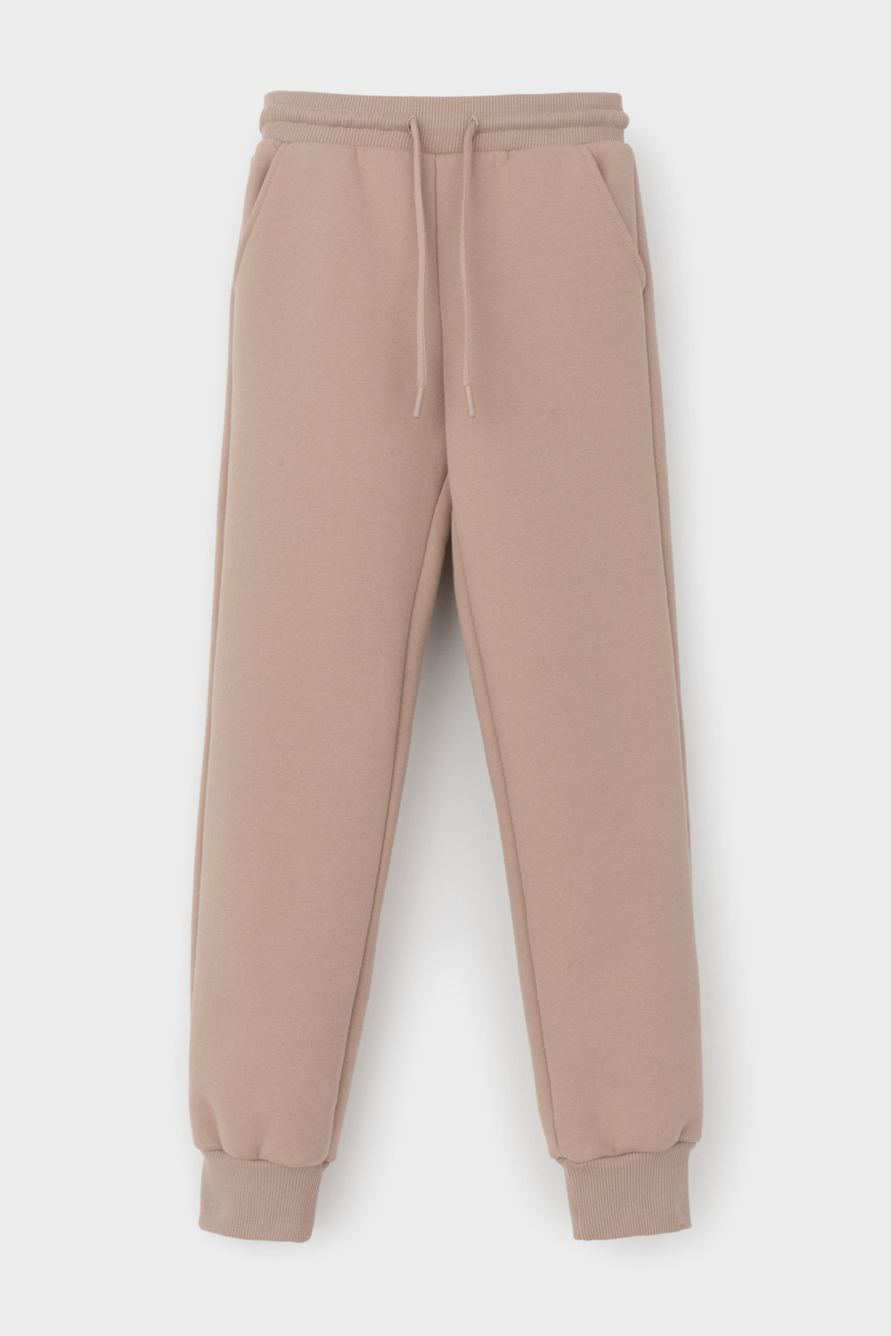 Трикотажные брюки для девочки из футера трехнитки с начесом. Эластичный пояс на резинке регулируется по ширине с помощью шнурка, внизу манжеты из эластичного кашкорсе.