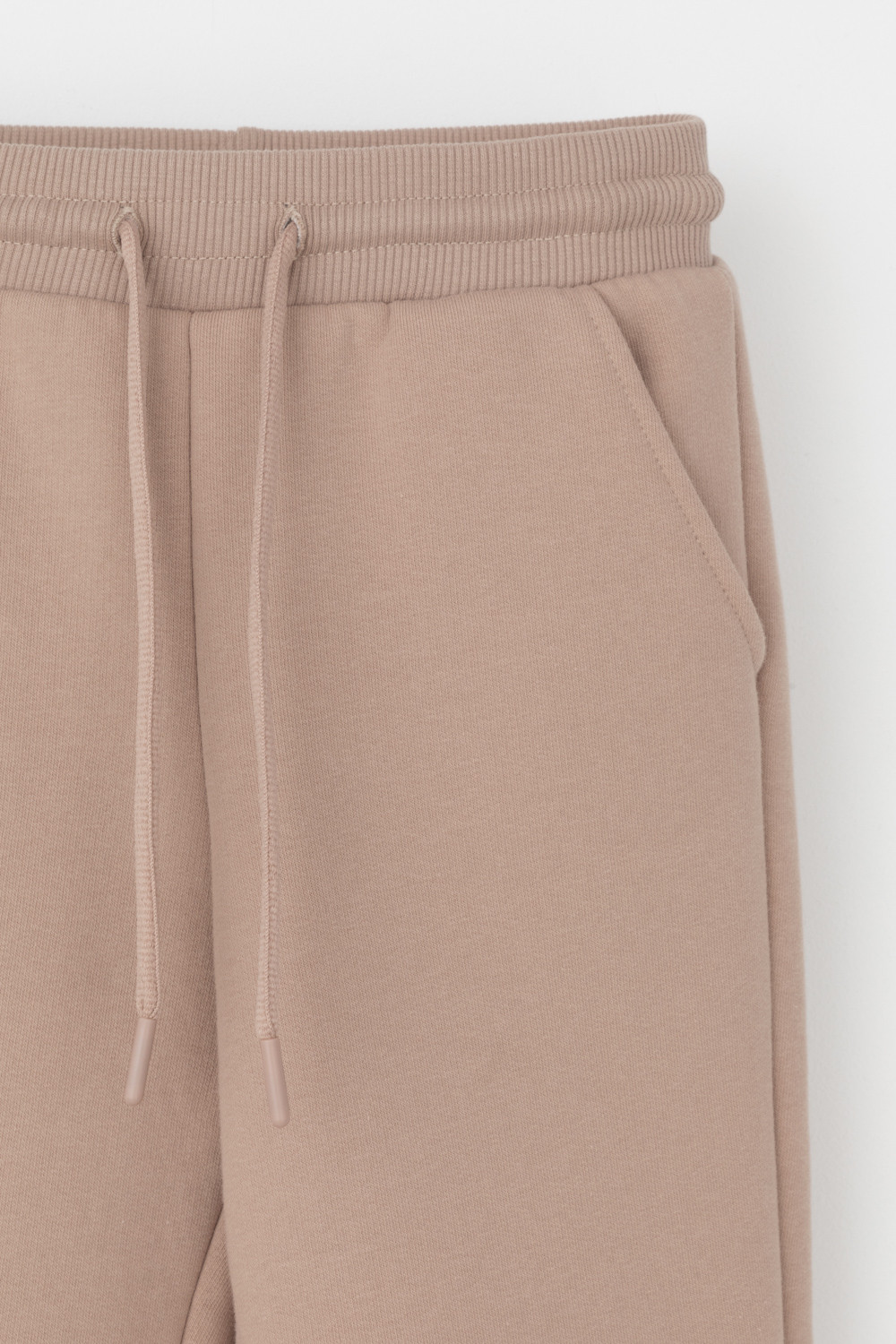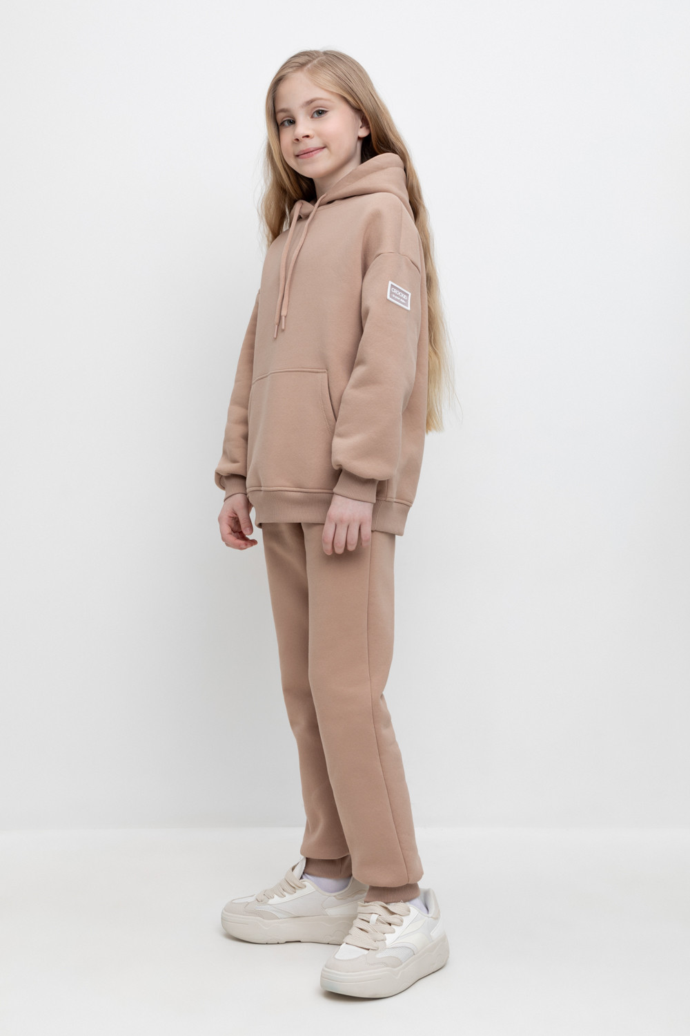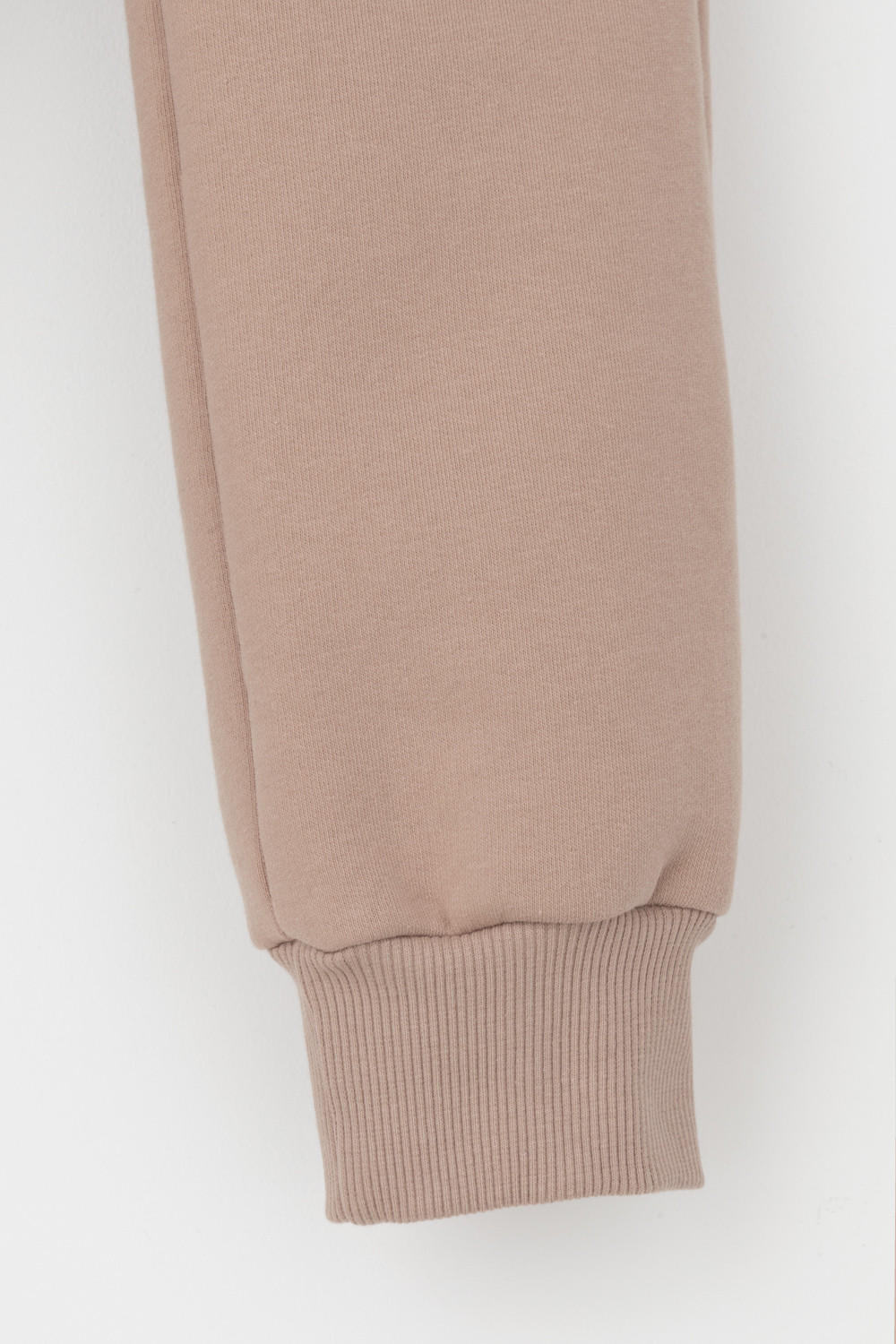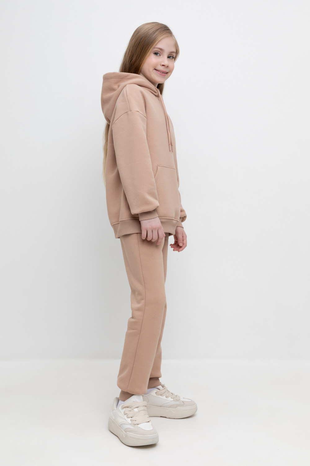 Трикотажные брюки для девочки из футера трехнитки с начесом. Эластичный пояс на резинке регулируется по ширине с помощью шнурка, внизу манжеты из эластичного кашкорсе.