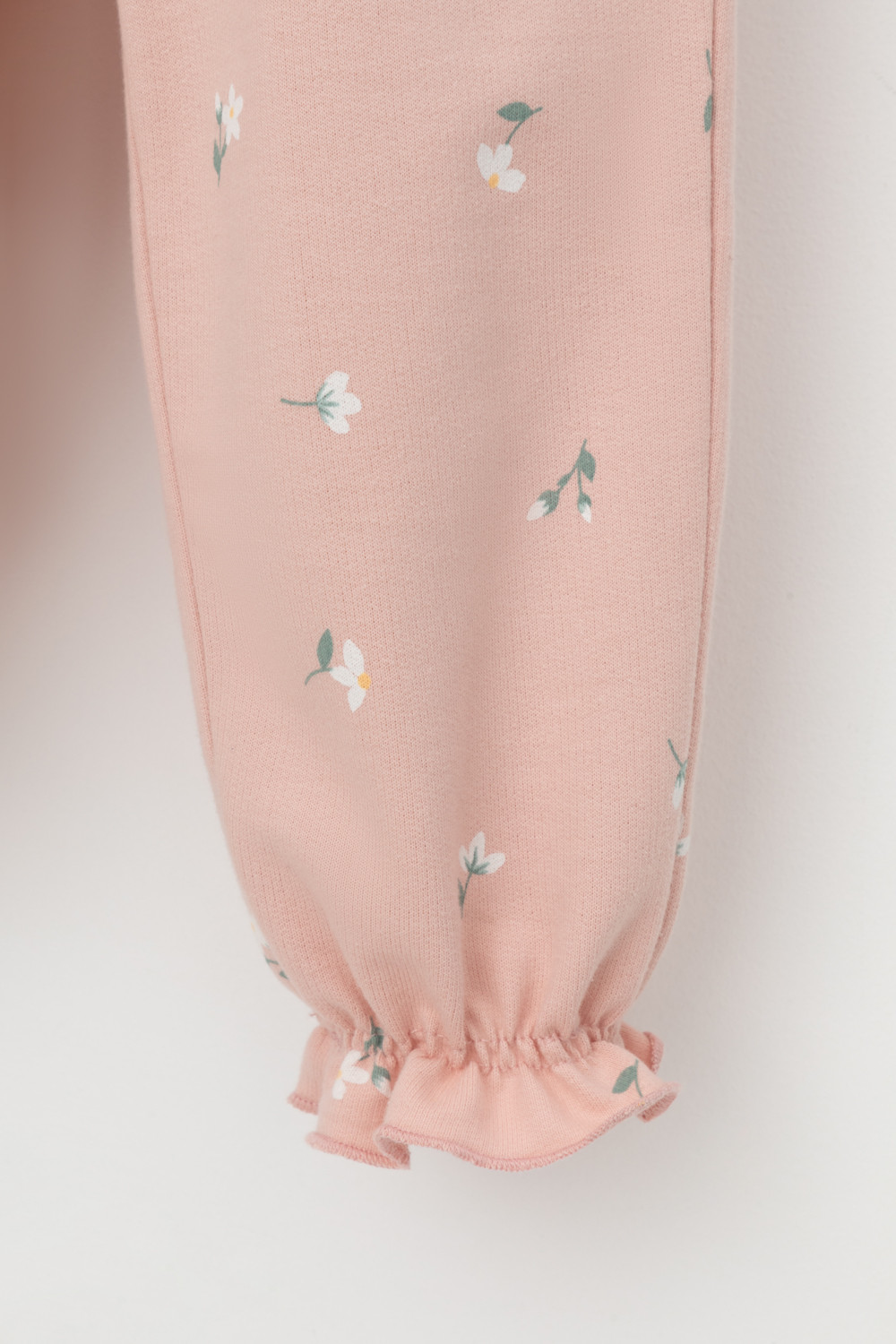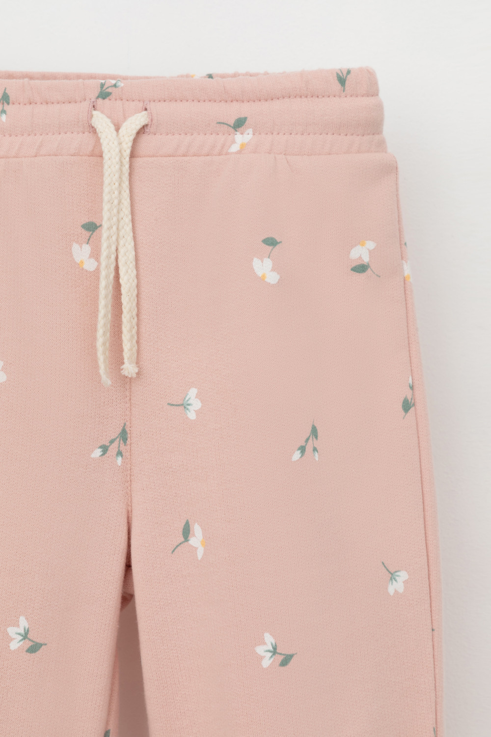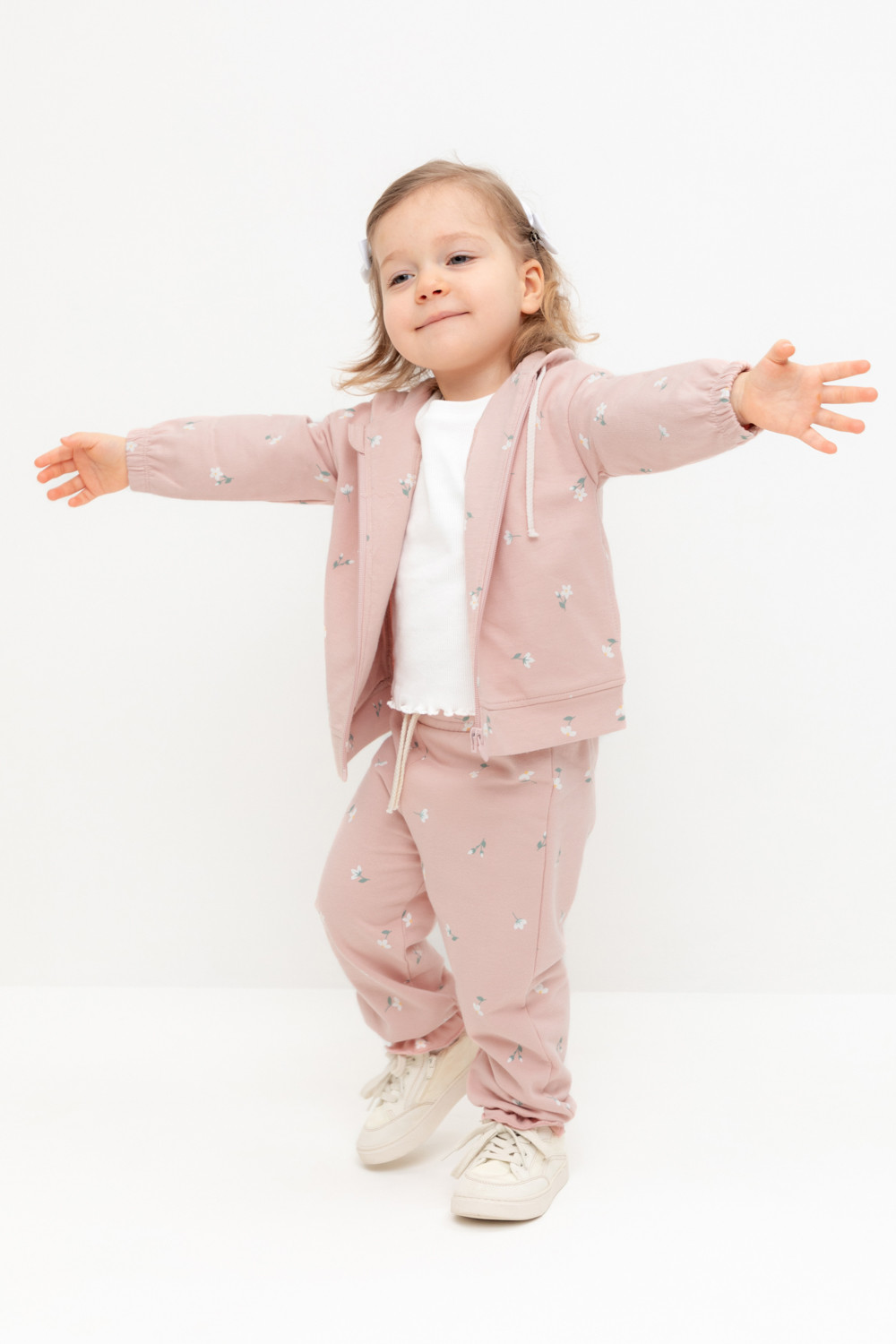 Трикотажные брюки для девочки из мягкого петельчатого футера. Пояс регулируется по ширине при помощи шнурка. Низ собран на резинку. Оригинальная набивка выполнена из стойких текстильных гипоаллергенных красителей. Изделие сохраняет цвет и форму после многократных стирок.