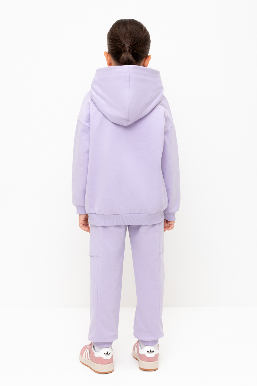 Брюки для девочки из мягкого петельчатого трикотажа. Эластичный пояс на резинке регулируется по ширине с помощью шнурка, по бокам два удобных кармана, внизу эластичные манжеты.