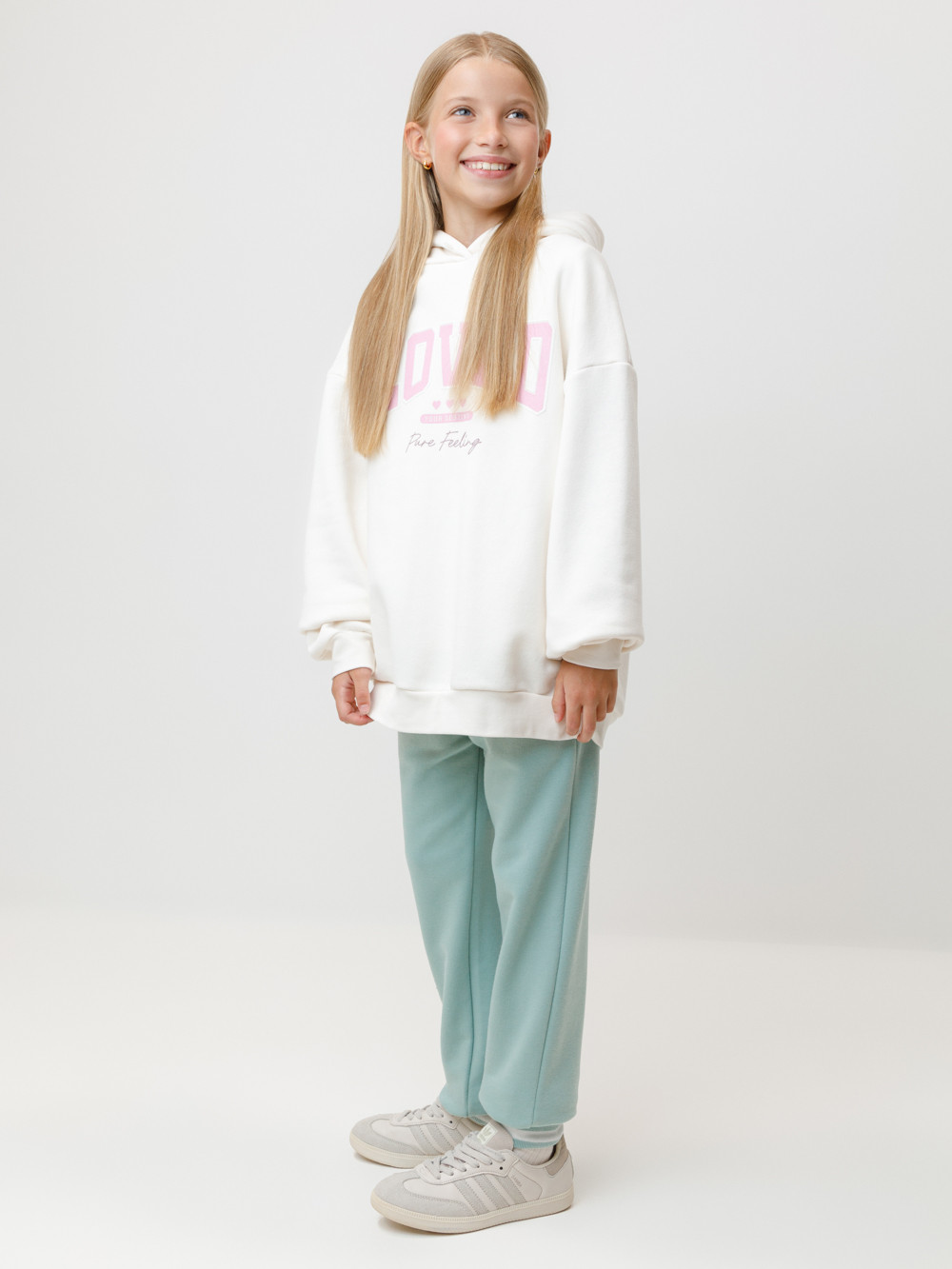 Брюки для девочки из мягкого петельчатого трикотажа. В составе 80% натурального хлопка и 20% полиэстера, при этом полиэстер ввязан внутрь по особой технологии и не соприкасается с кожей. Эластичный пояс на резинке регулируется по ширине с помощью шнурка, по бокам два удобных кармана, внизу эластичные манжеты.