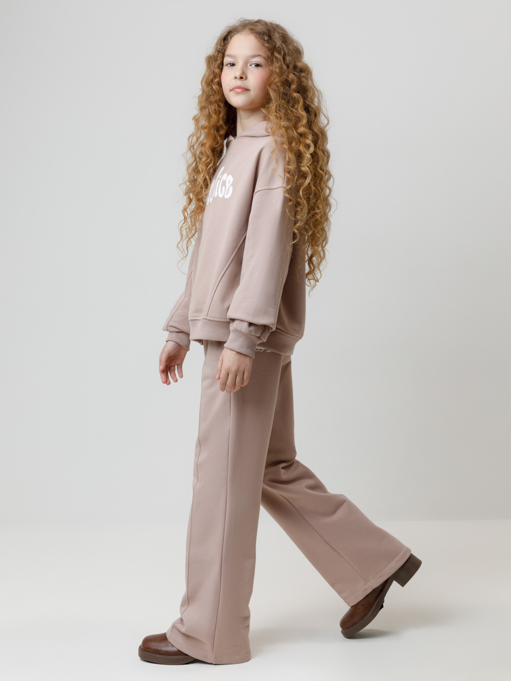 Прямые брюки со стрелками для девочки из мягкого петельчатого трикотажа. Эластичный пояс на резинке регулируется по ширине с помощью шнурка. По бокам два удобных кармана. Спереди застроченные стрелки. Изделие сохраняет цвет и форму после многократных стирок. Все трикотажные полотна производятся в соответствии с нормами швейцарского сертификата ЭкоТекс.