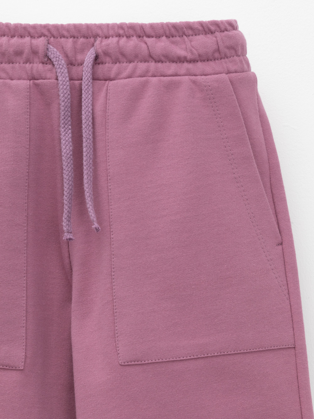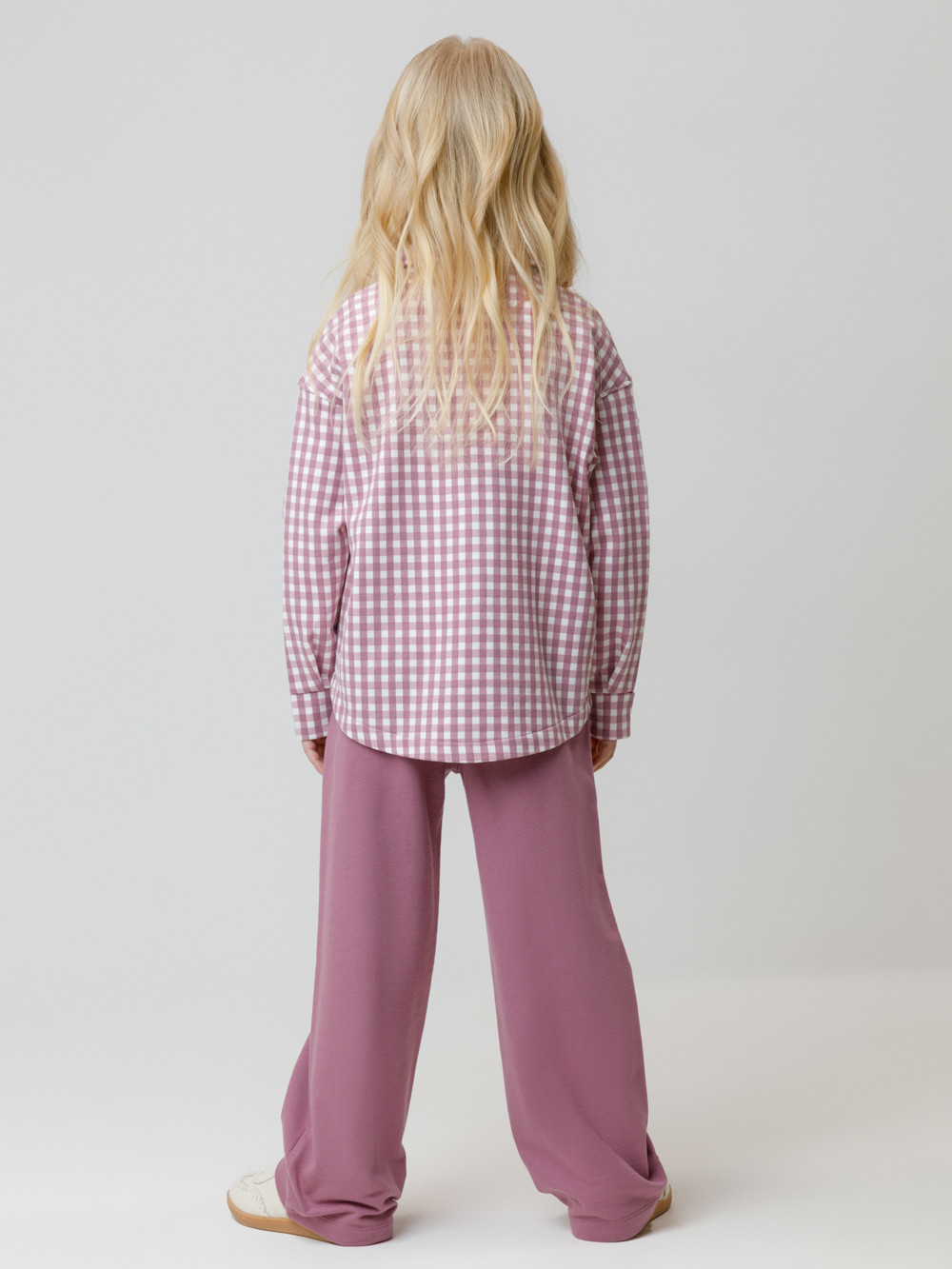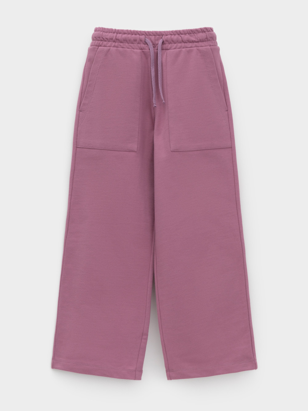 Прямые брюки для девочки из мягкого петельчатого трикотажа. Эластичный пояс на резинке регулируется по ширине с помощью шнурка. По бокам два удобных накладных кармана. Изделие сохраняет цвет и форму после многократных стирок. Все трикотажные полотна производятся в соответствии с нормами швейцарского сертификата ЭкоТекс.