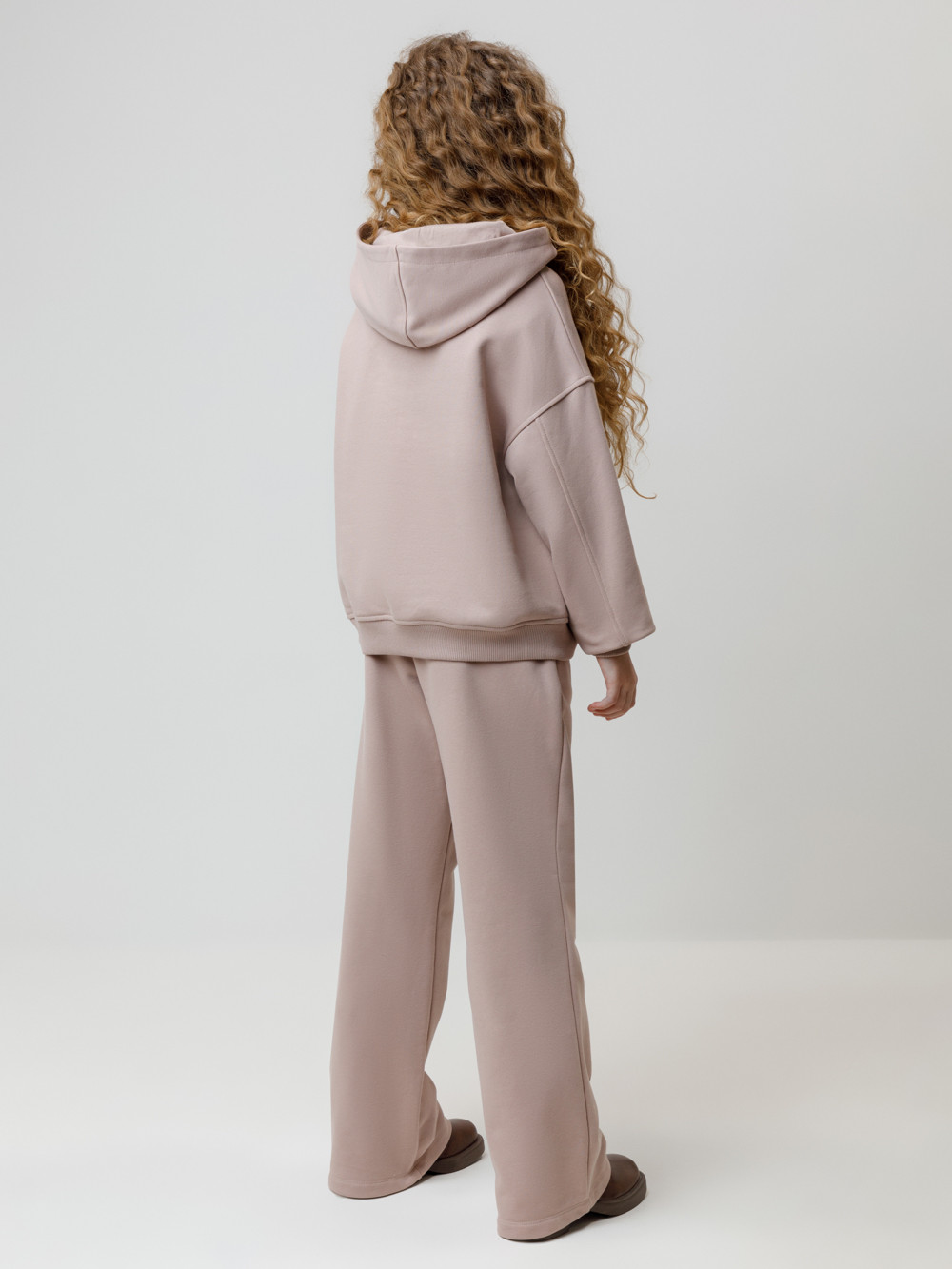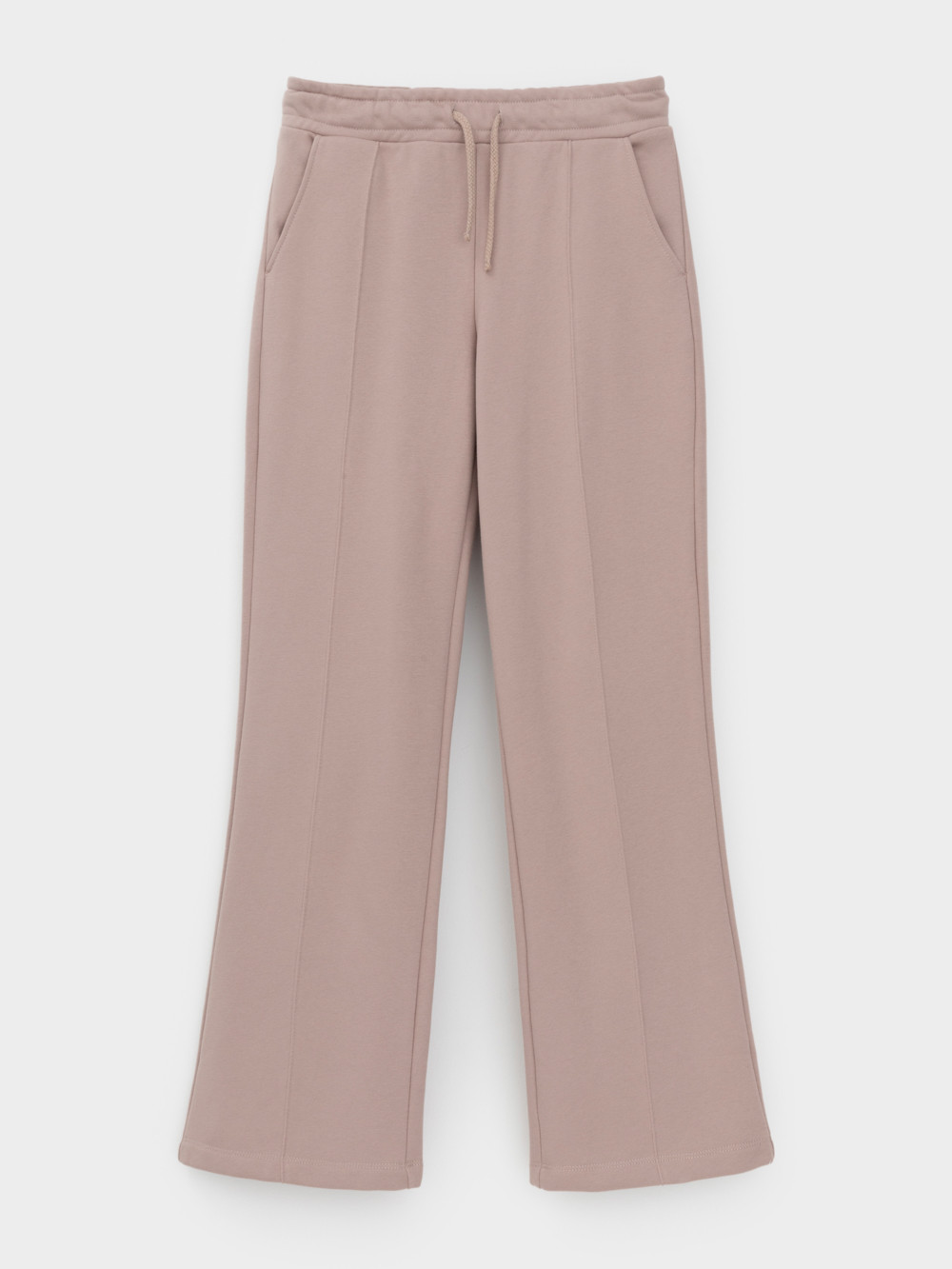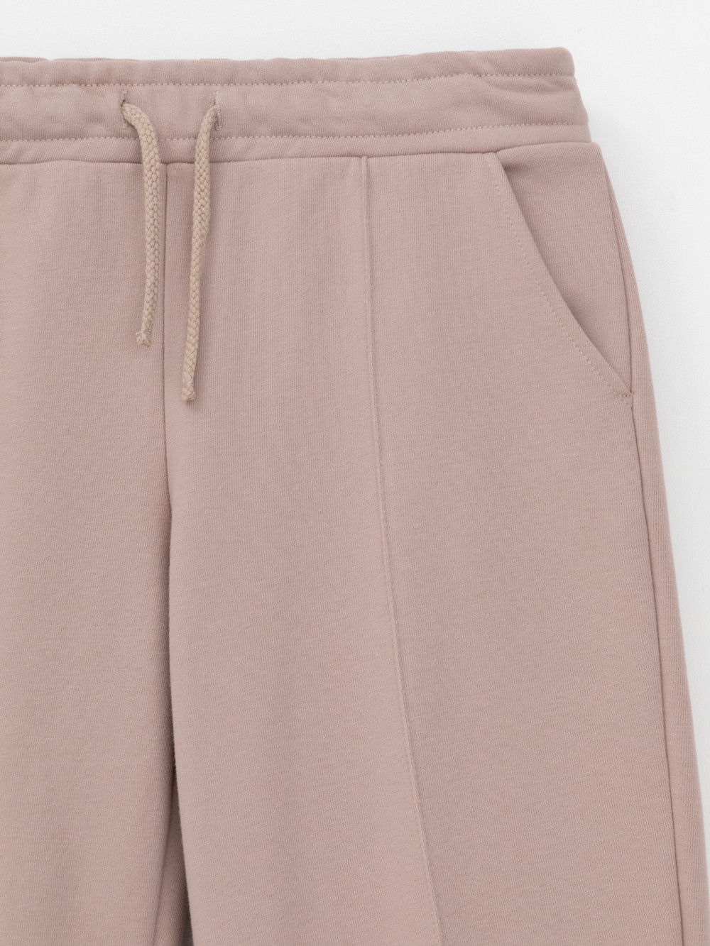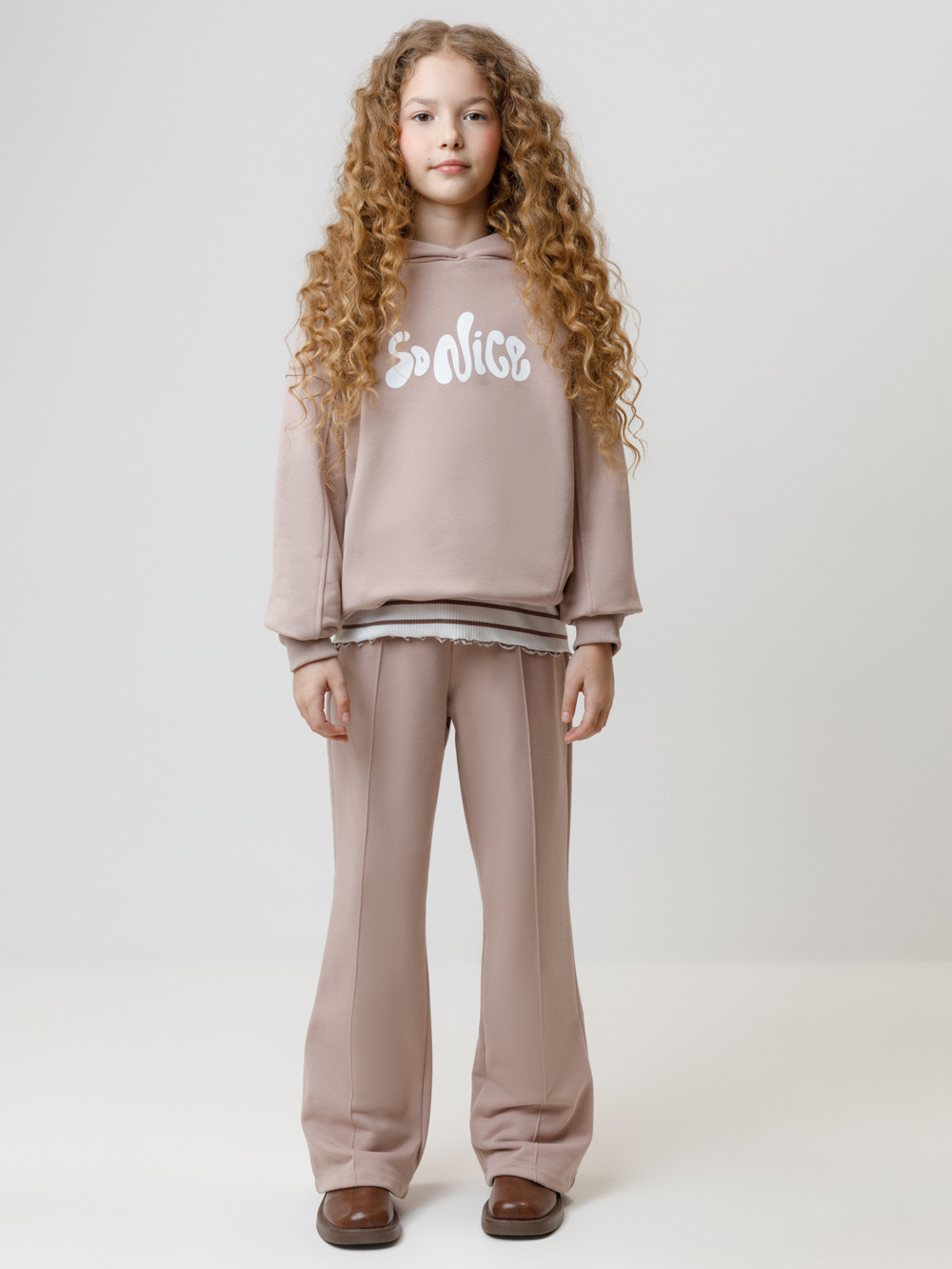 Прямые брюки со стрелками для девочки из мягкого петельчатого трикотажа. Эластичный пояс на резинке регулируется по ширине с помощью шнурка. По бокам два удобных кармана. Спереди застроченные стрелки. Изделие сохраняет цвет и форму после многократных стирок. Все трикотажные полотна производятся в соответствии с нормами швейцарского сертификата ЭкоТекс.