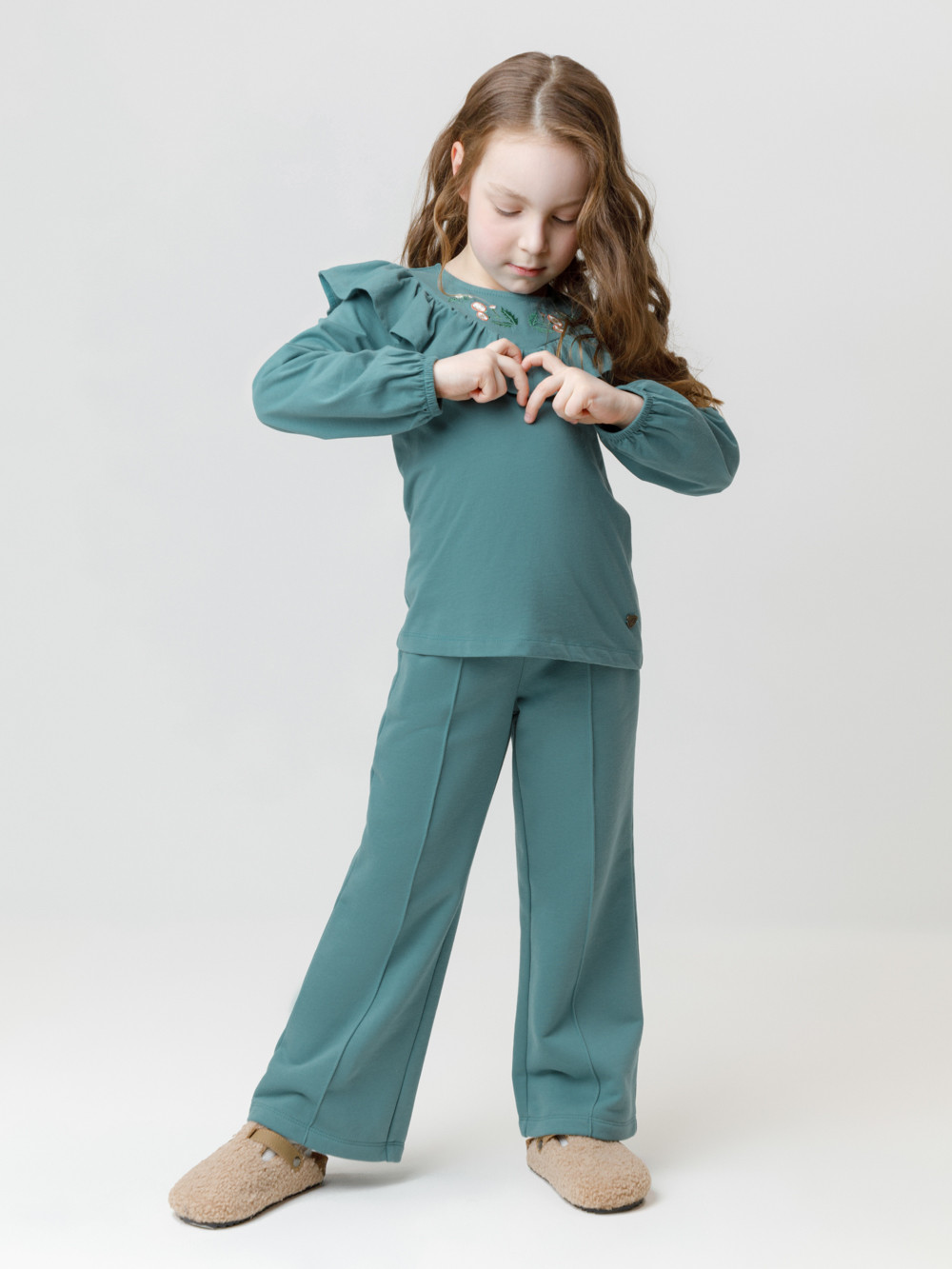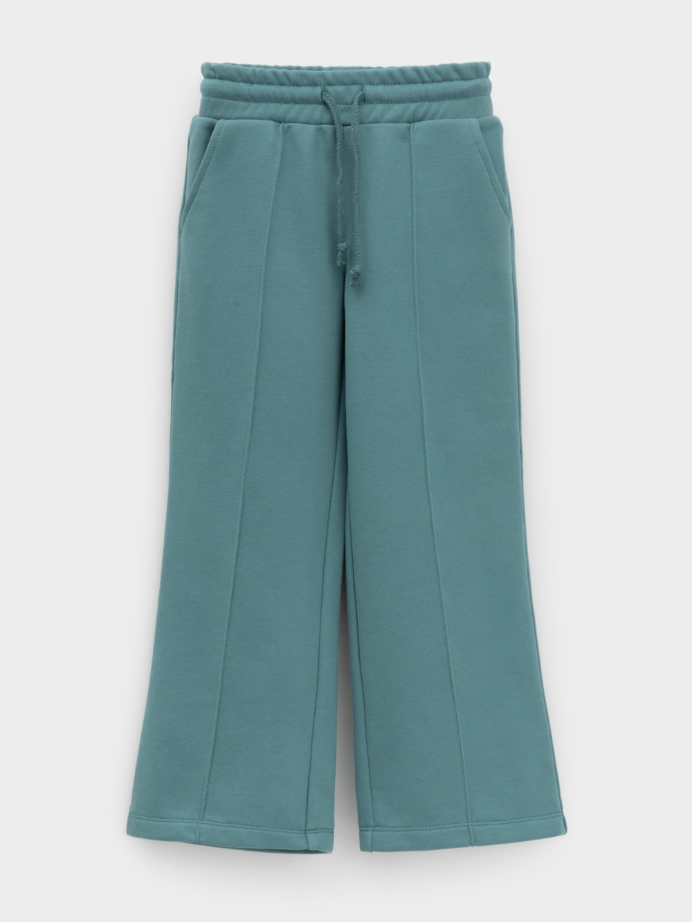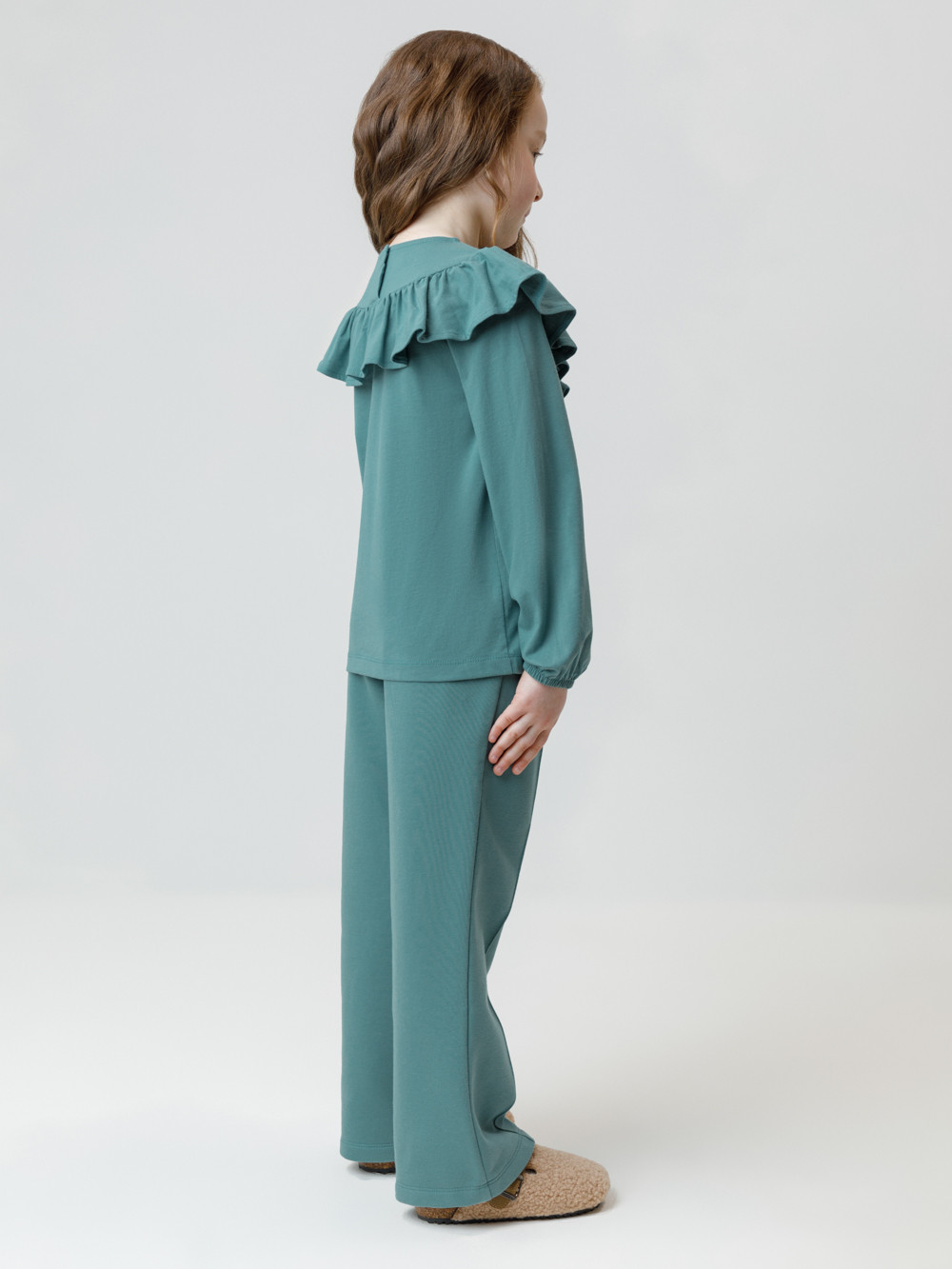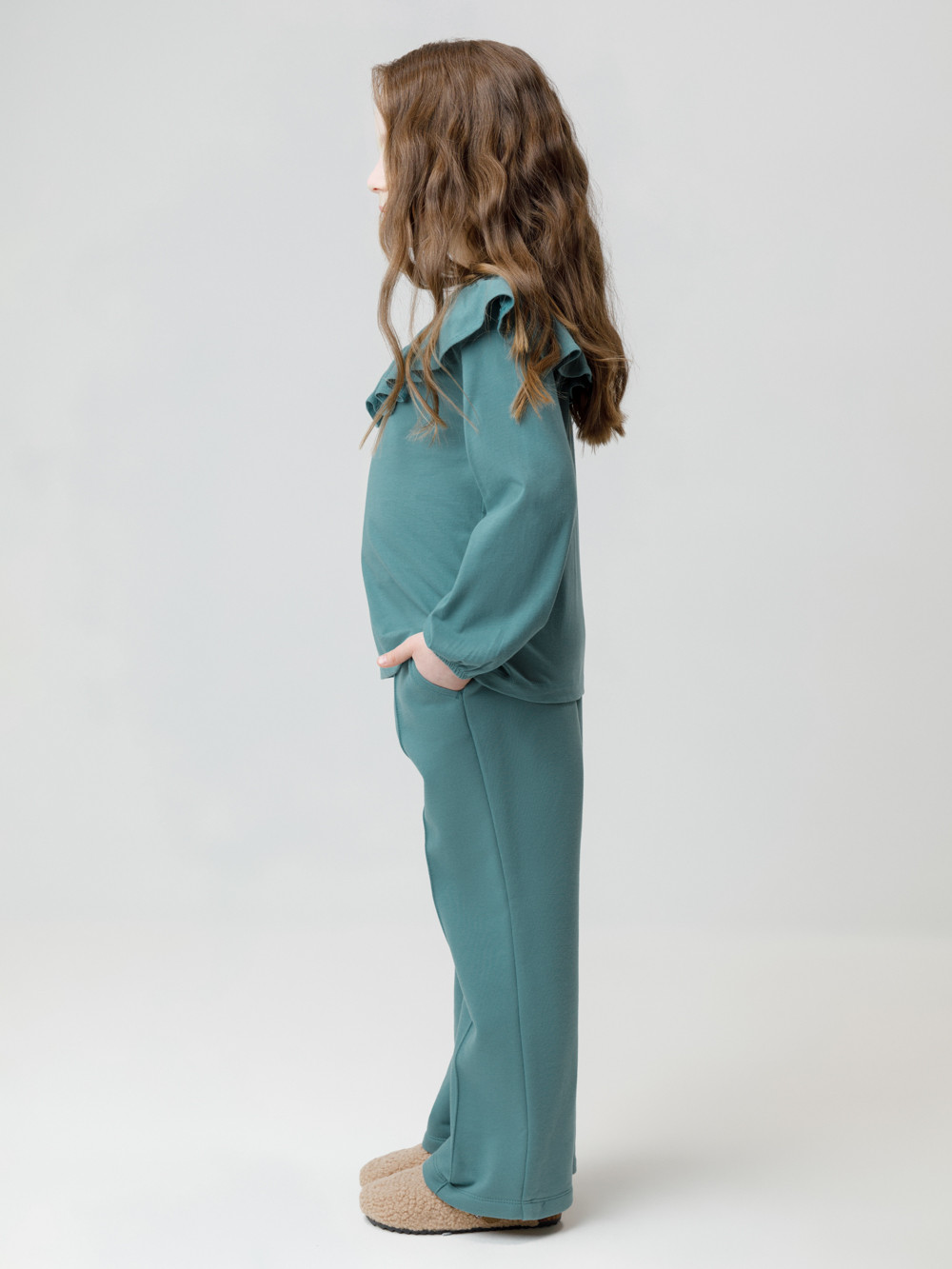 Прямые брюки со стрелками для девочки из мягкого петельчатого трикотажа. Эластичный пояс на резинке регулируется по ширине с помощью шнурка. По бокам два удобных кармана. Спереди застроченные стрелки. Изделие сохраняет цвет и форму после многократных стирок. Все трикотажные полотна производятся в соответствии с нормами швейцарского сертификата ЭкоТекс.