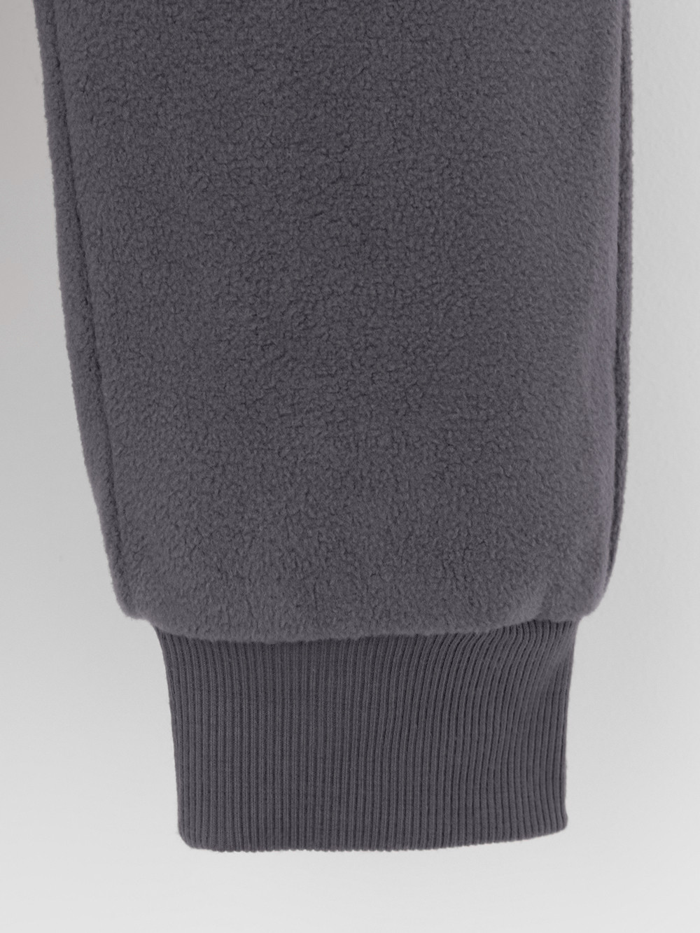 Однотонные детские брюки из флиса с поясом на резинке. Низ изделия на манжетах из эластичного трикотажа в рубчик. Брюки сохраняют цвет и форму после многократных стирок.