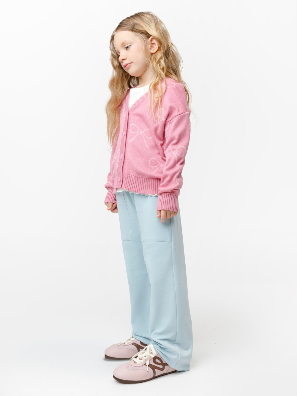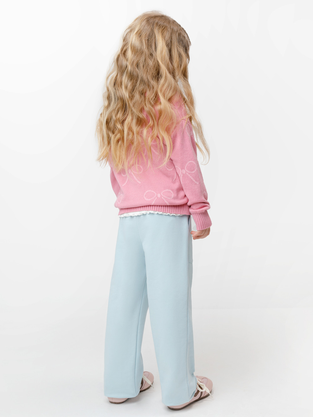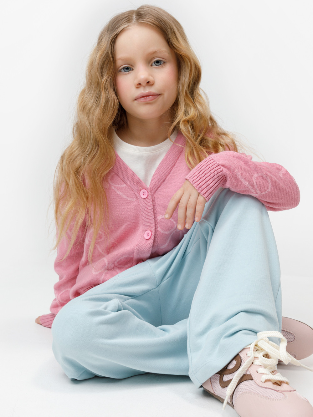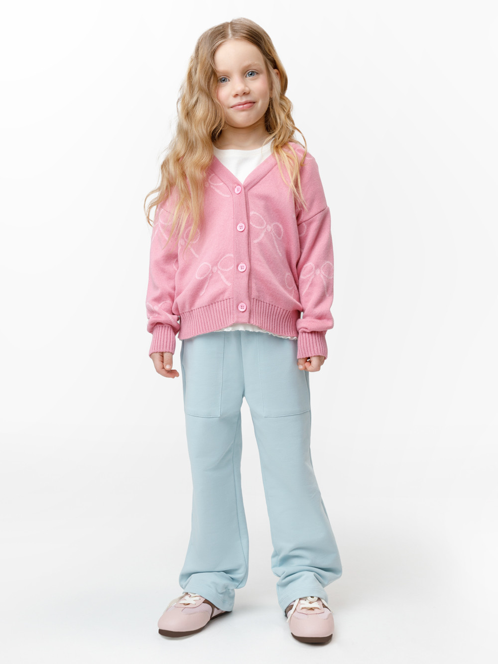 Брюки из мягкого петельчатого футера для девочки. Модель с эластичным поясом на резинке и регулировкой по талии с помощью шнурка. Изделие сохраняет цвет и форму после многократных стирок. Все трикотажные полотна производятся в соответствии с нормами швейцарского сертификата ЭкоТекс.