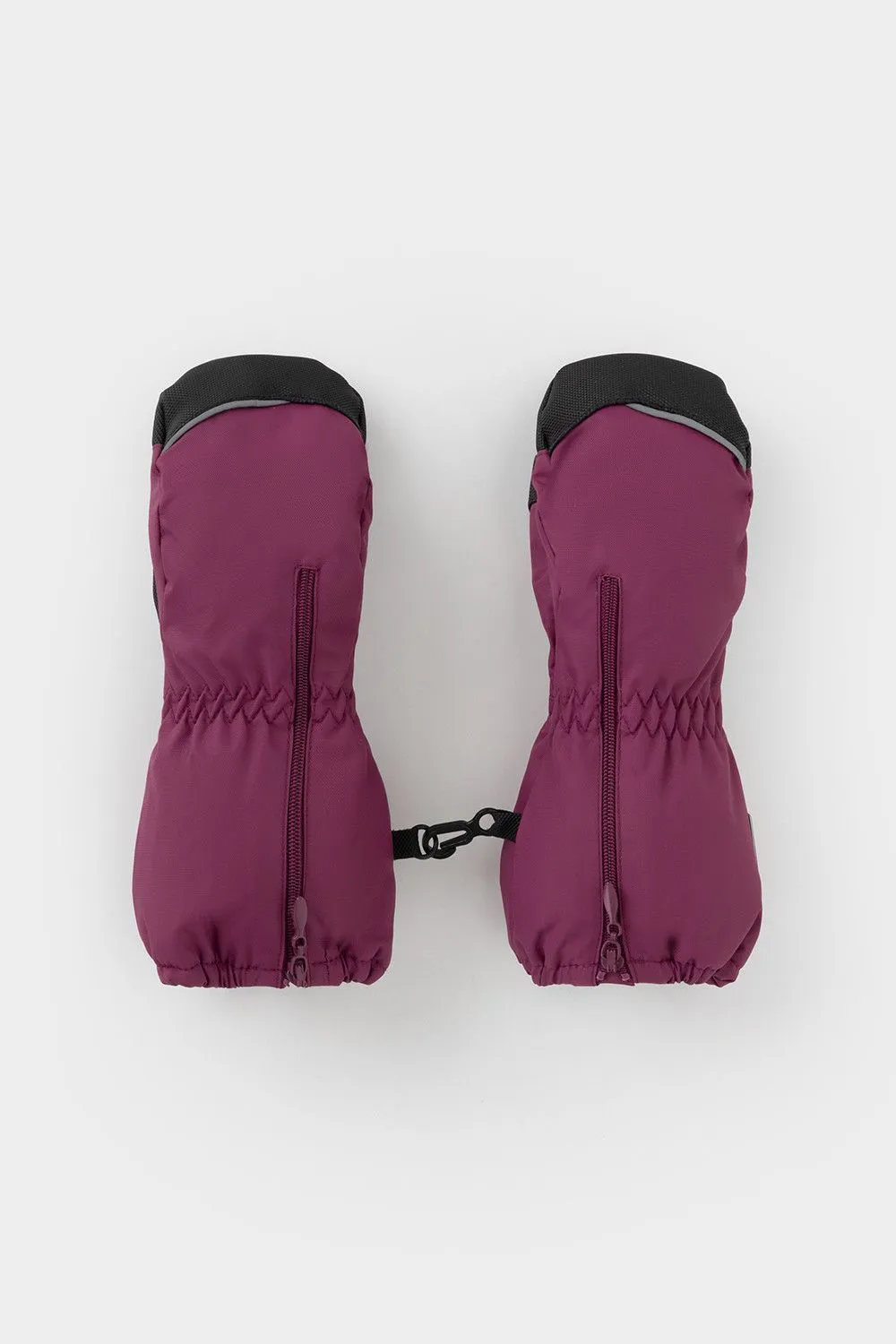 Детские утеплённые рукавицы из однотонной мембранной ткани со вставками из искусственной кожи. Удлинённые манжеты на молнии. Мягкий подклад из флиса. Пластиковый карабин для скрепления рукавиц между собой. Светоотражающие элементы.