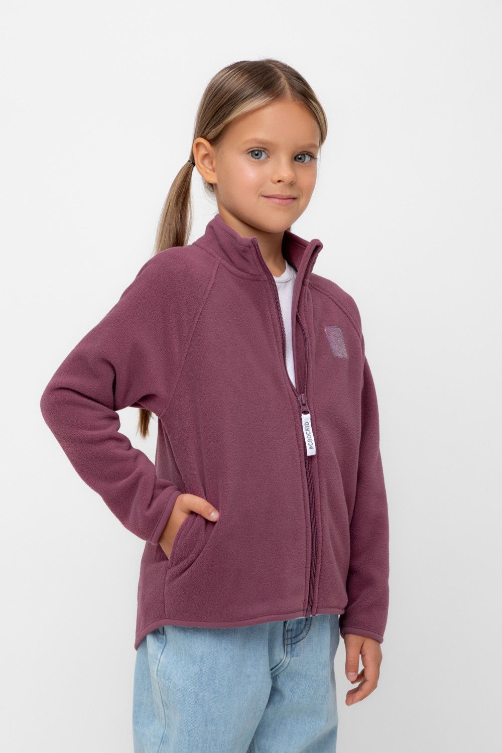 Флисовая куртка для девочки. У изделия удлинённая спинка, высокий воротник, предусмотрена защита шеи и подбородка. Рукава-реглан и низ изделия обработаны эластичным кантом для лучшего прилегания к телу, по бокам два кармана. Куртка сохраняет цвет и форму после многократных стирок.