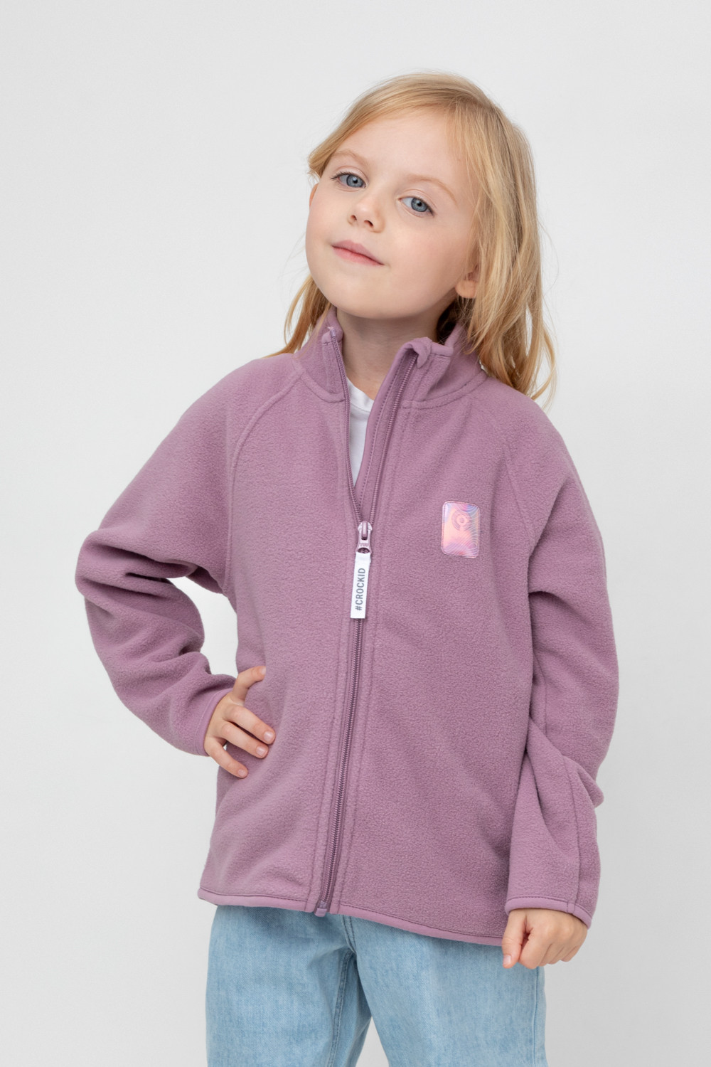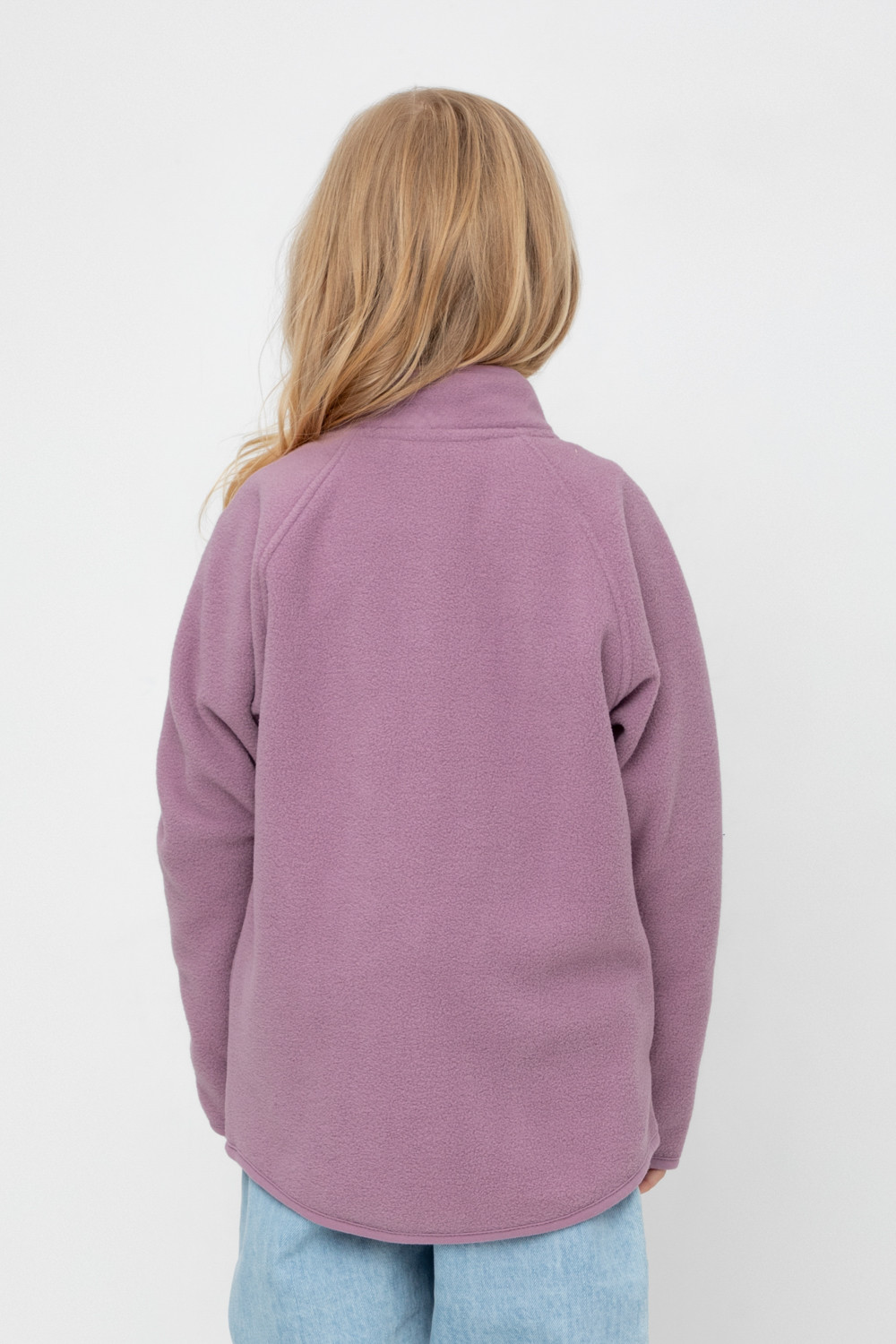 Флисовая куртка для девочки. У изделия удлинённая спинка, высокий воротник, предусмотрена защита шеи и подбородка. Рукава-реглан и низ изделия обработаны эластичным кантом для лучшего прилегания к телу, по бокам два кармана. Куртка сохраняет цвет и форму после многократных стирок.