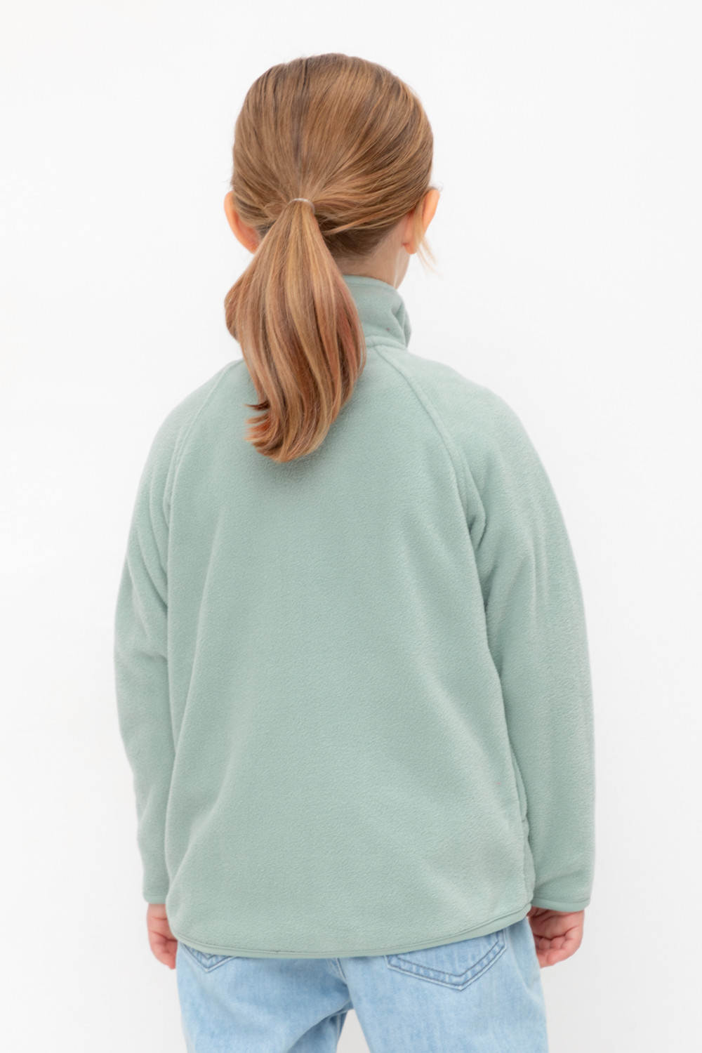 Флисовая куртка для девочки. У изделия удлинённая спинка, высокий воротник, предусмотрена защита шеи и подбородка. Рукава-реглан и низ изделия обработаны эластичным кантом для лучшего прилегания к телу, по бокам два кармана. Куртка сохраняет цвет и форму после многократных стирок.
