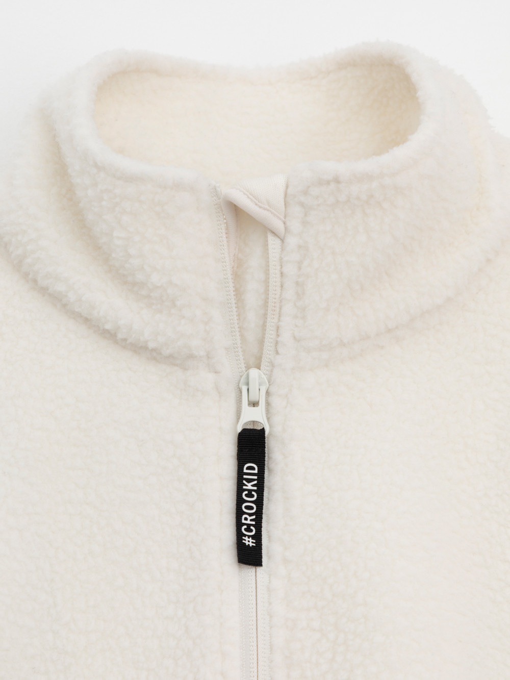 Флисовая куртка детская. У изделия высокий воротник и застёжка на молнию с мягкой защитой шеи и подбородка. По бокам два кармана. Рукава собраны на резинку. Низ изделия регулируется по ширине с помощью эластичной утяжки со стопперами. Куртка сохраняет цвет и форму после многократных стирок.