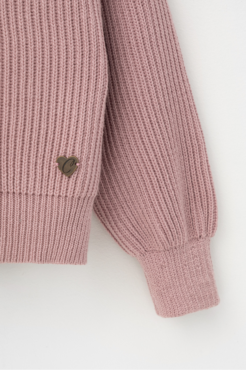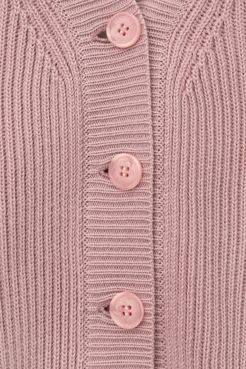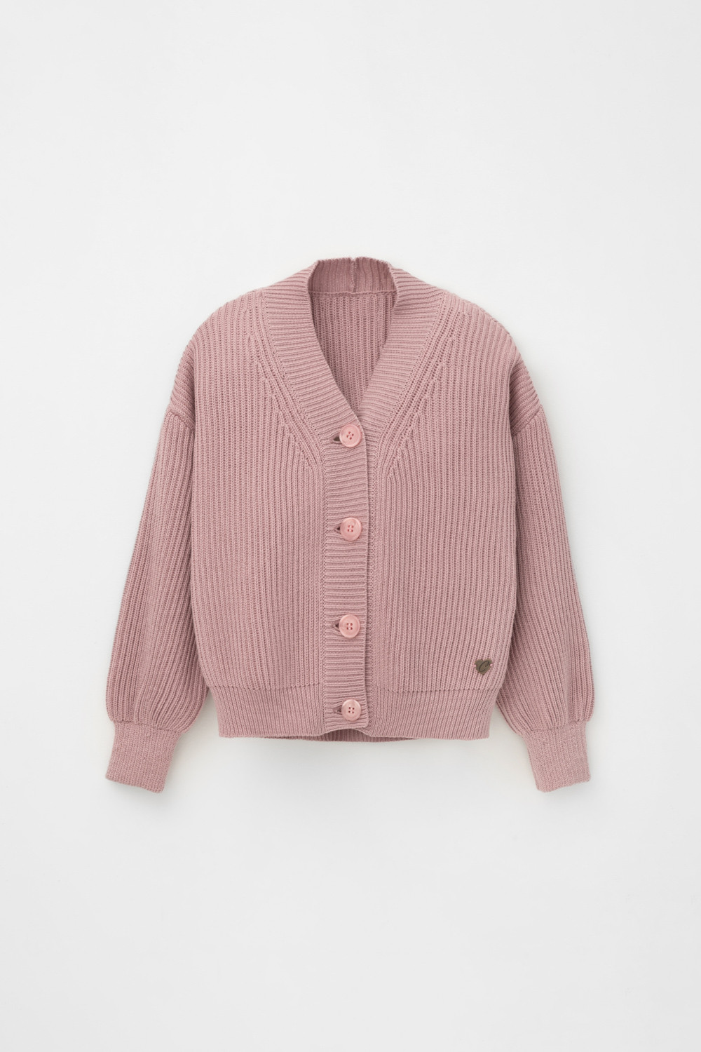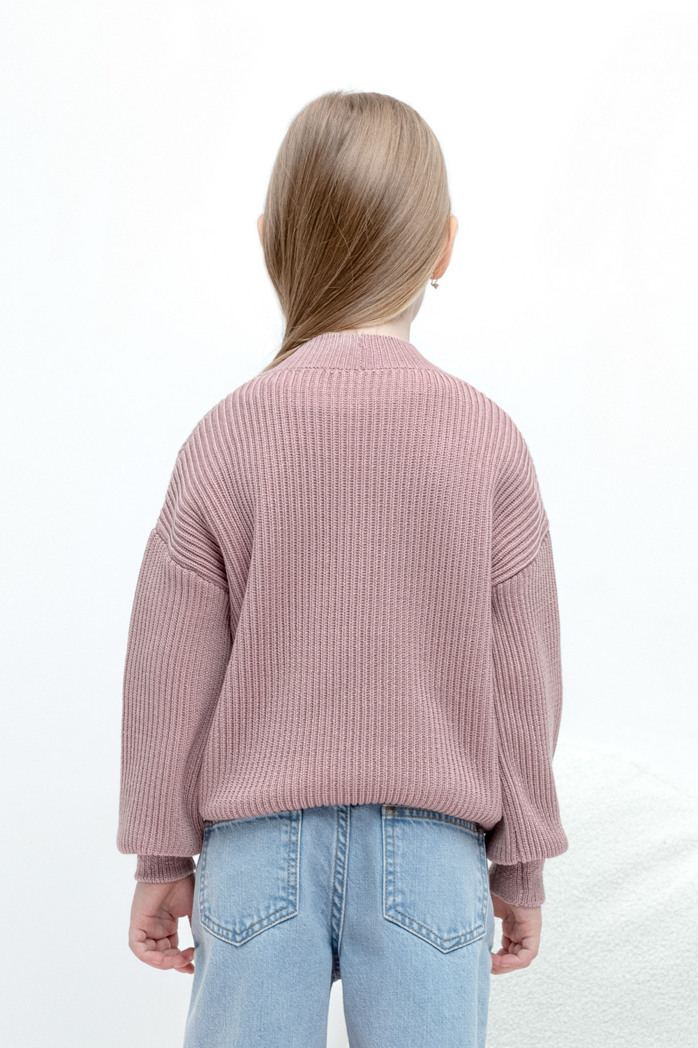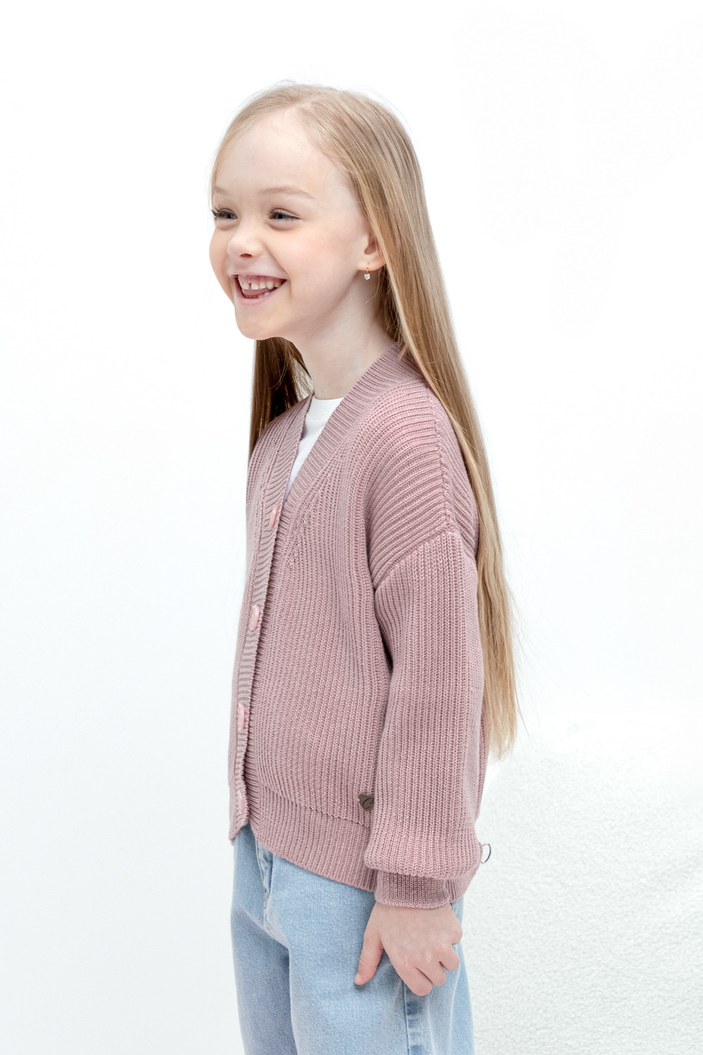 Вязаный кардиган для девочки со спущенными рукавами. Связан из хлопковой пряжи. На рукавах эластичные манжеты. Внизу мягкий пояс. Застёгивается на пуговицы.