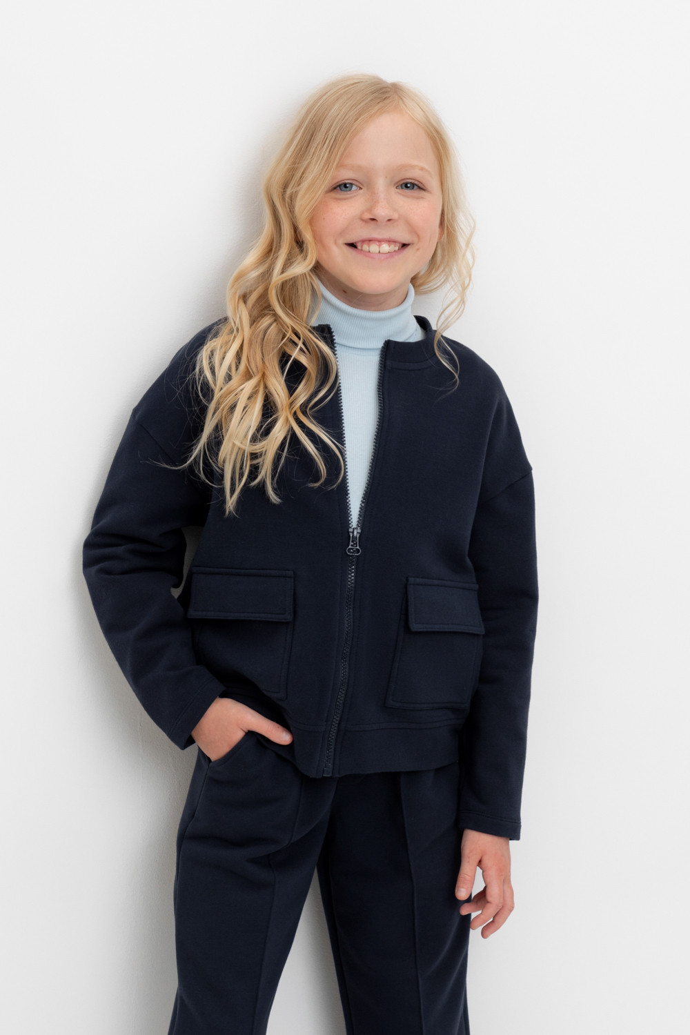 Трикотажный школьный жакет для девочки на молнии с накладными карманами. Произведен из мягкого трикотажного футера с добавлением эластана .