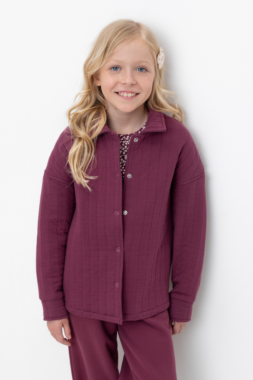 Свободная трикотажная рубашка для девочки из мягкого капитония на кнопках. Модель с закругленным низом и спущенным плечом.