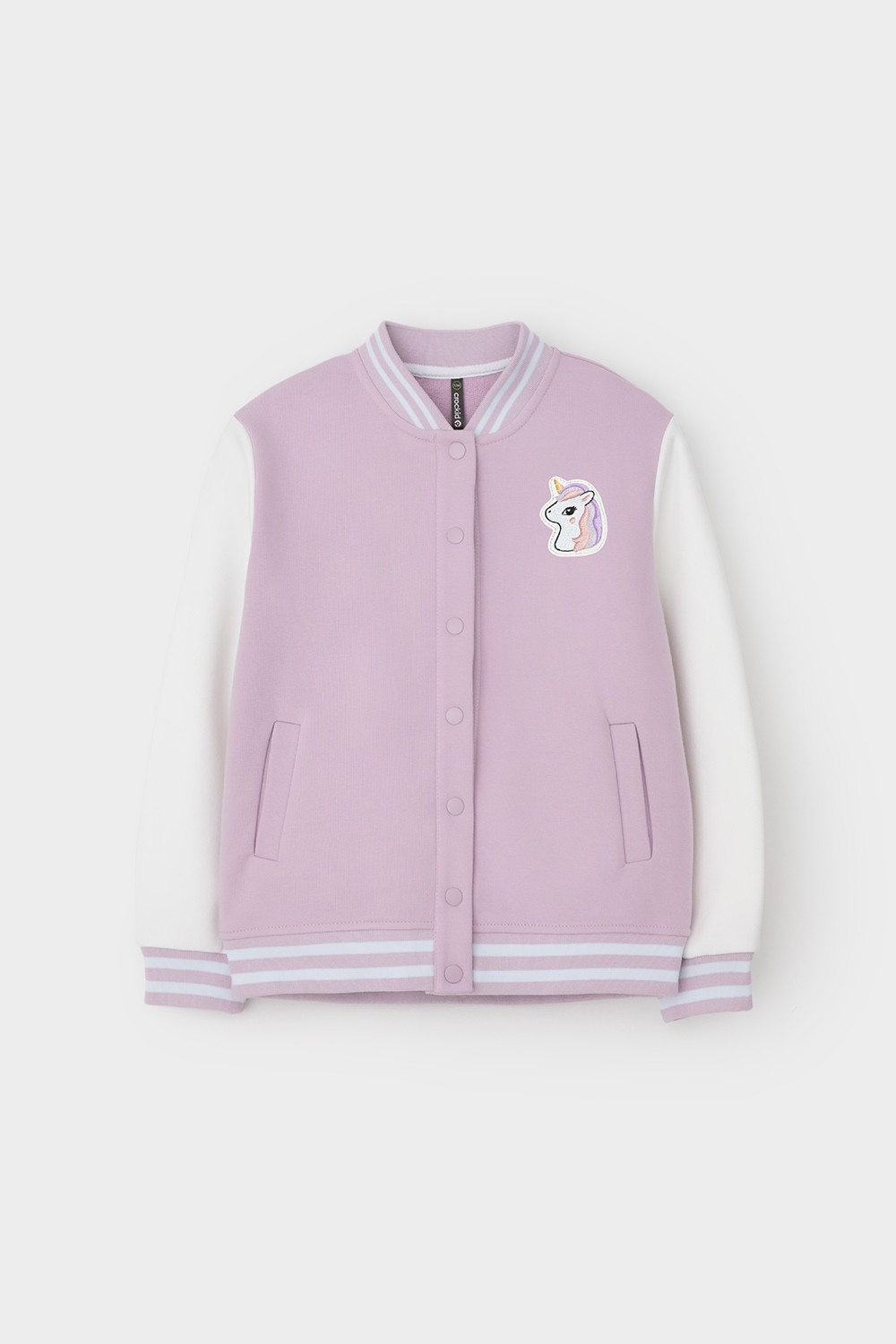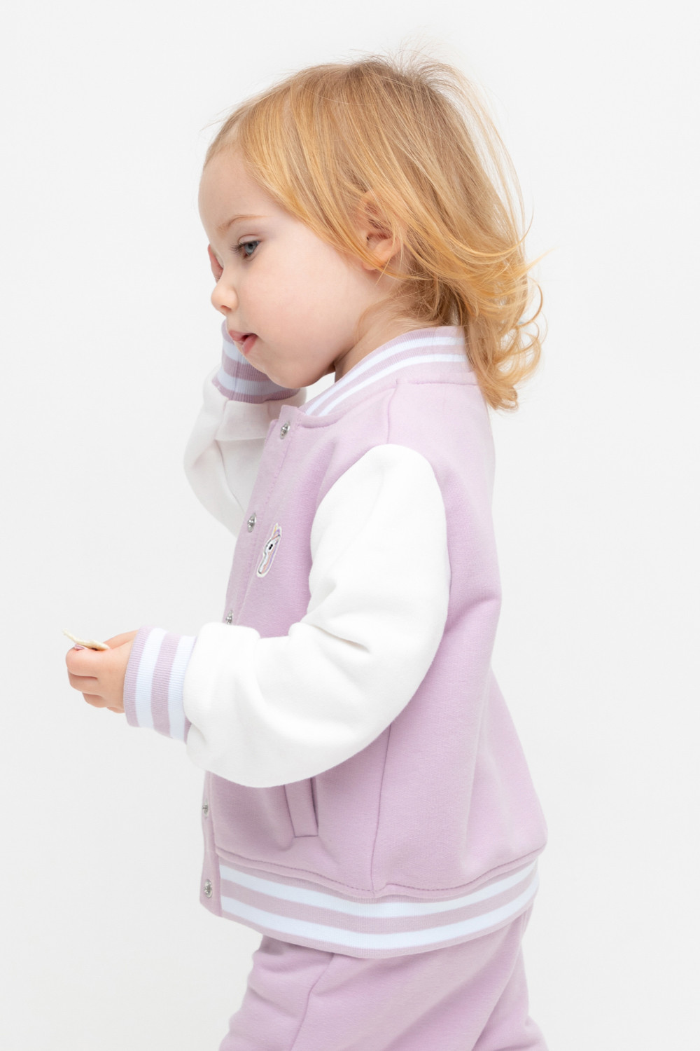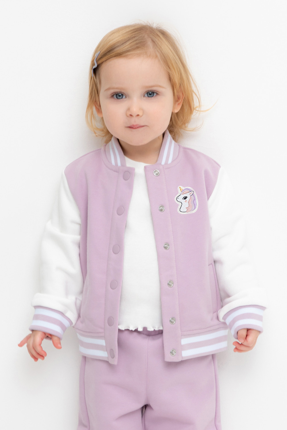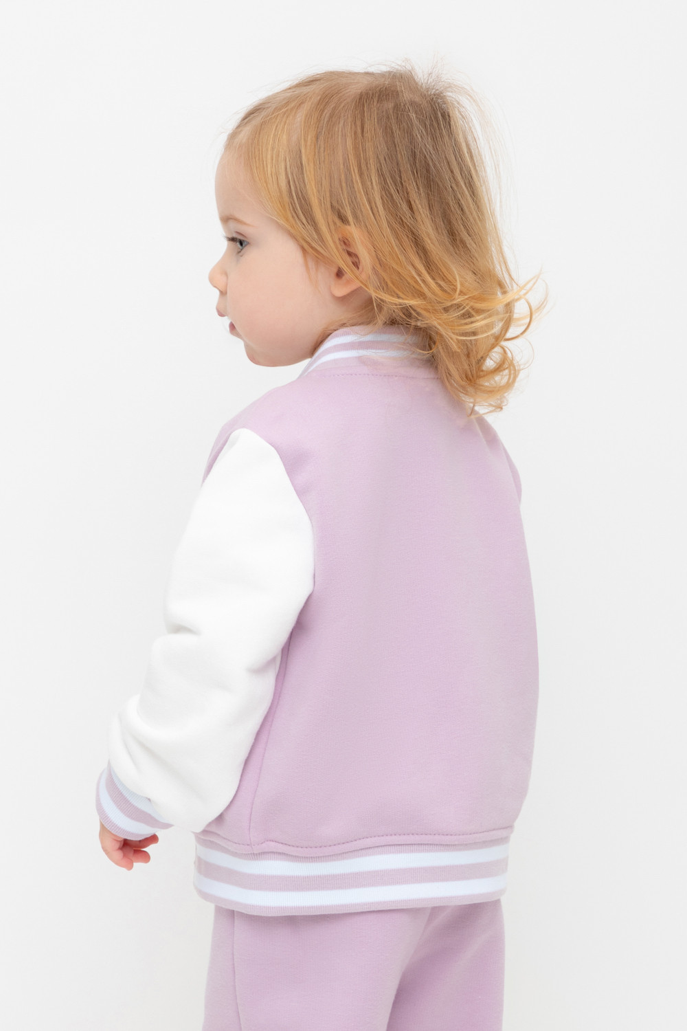 Бомбер для девочки с контрастными рукавами из мягкого трикотажа. Воротник, манжеты и пояс - вязаные. Спереди карманы с листочкой.