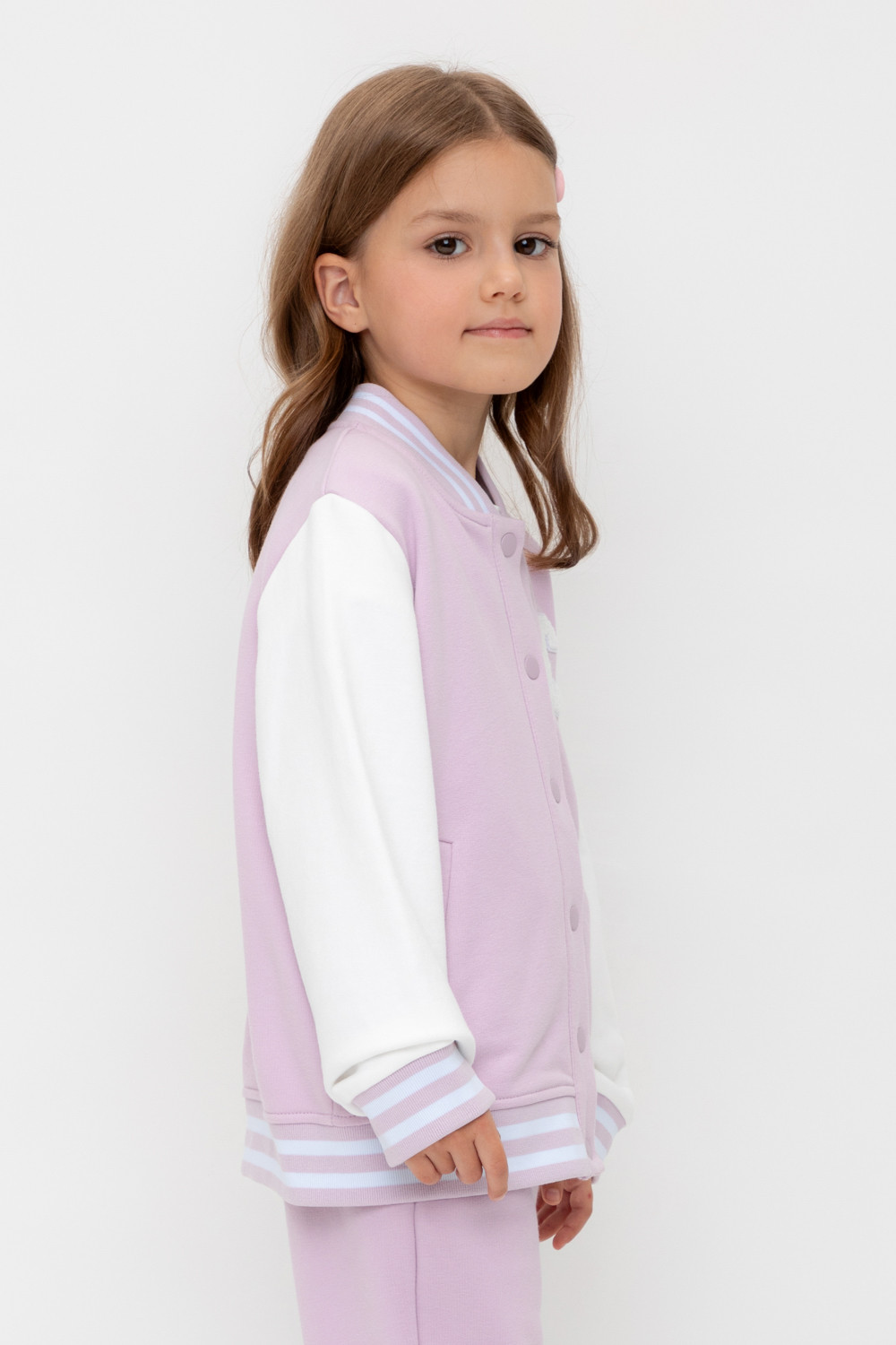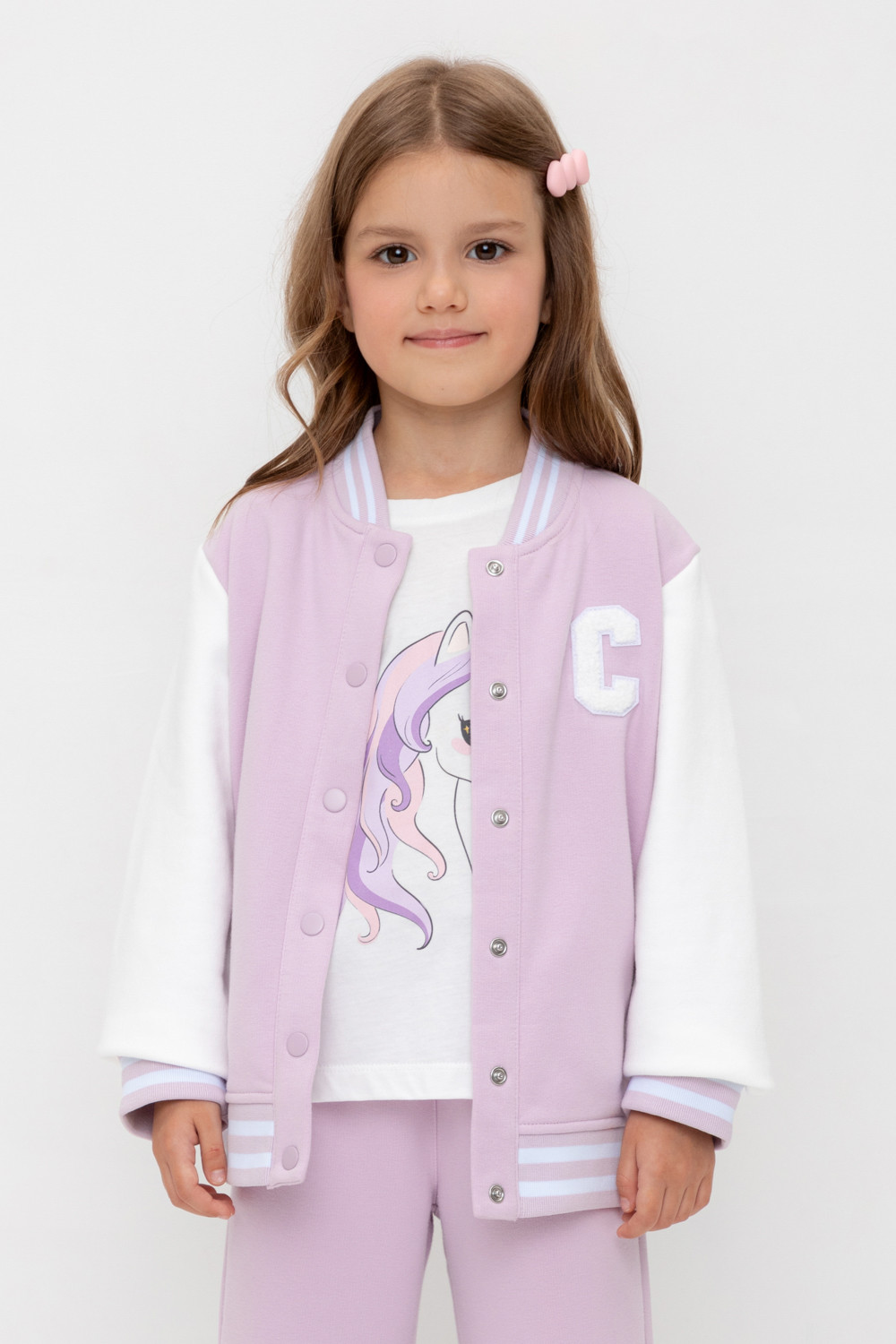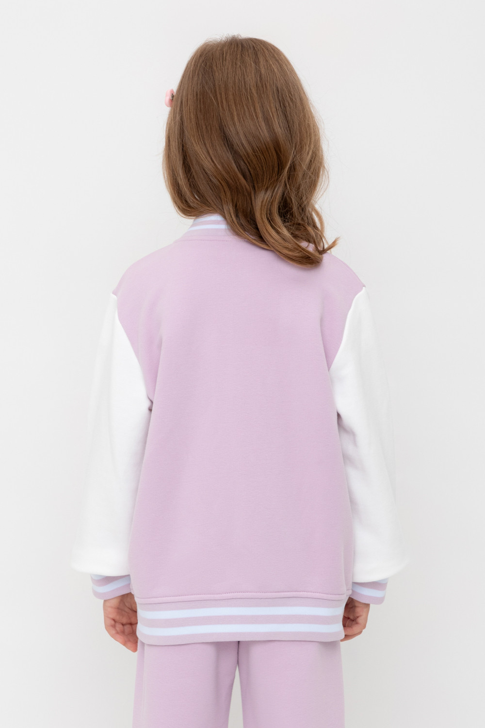 Бомбер для девочки с контрастными рукавами из мягкого трикотажа. Воротник, манжеты и пояс - вязаные. Спереди карманы с листочкой.