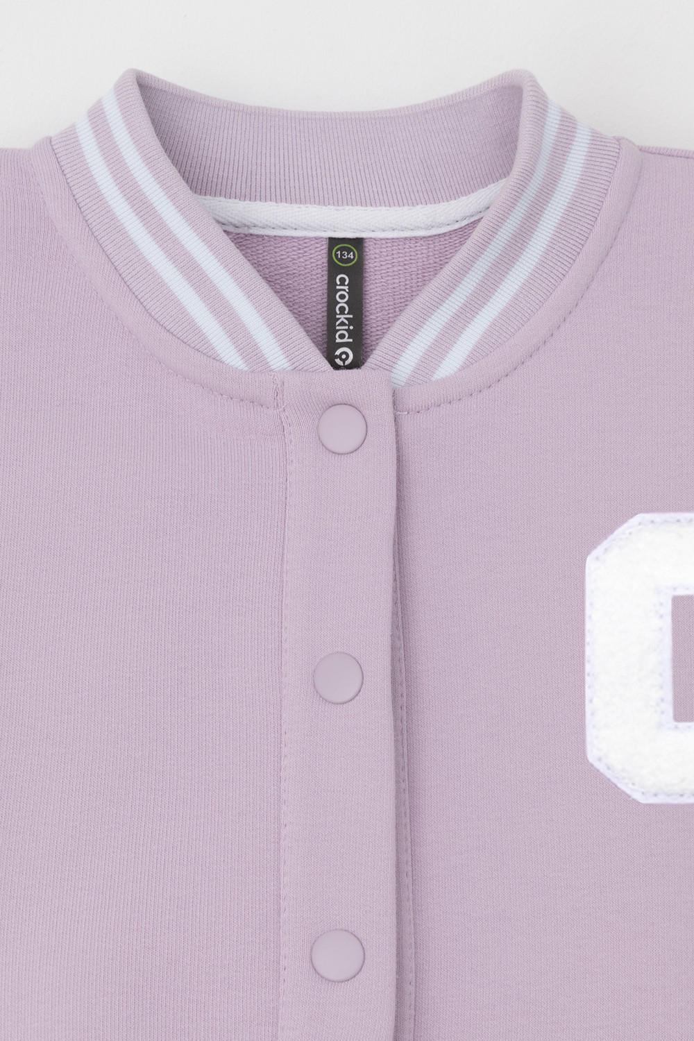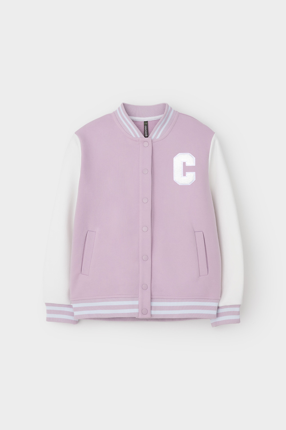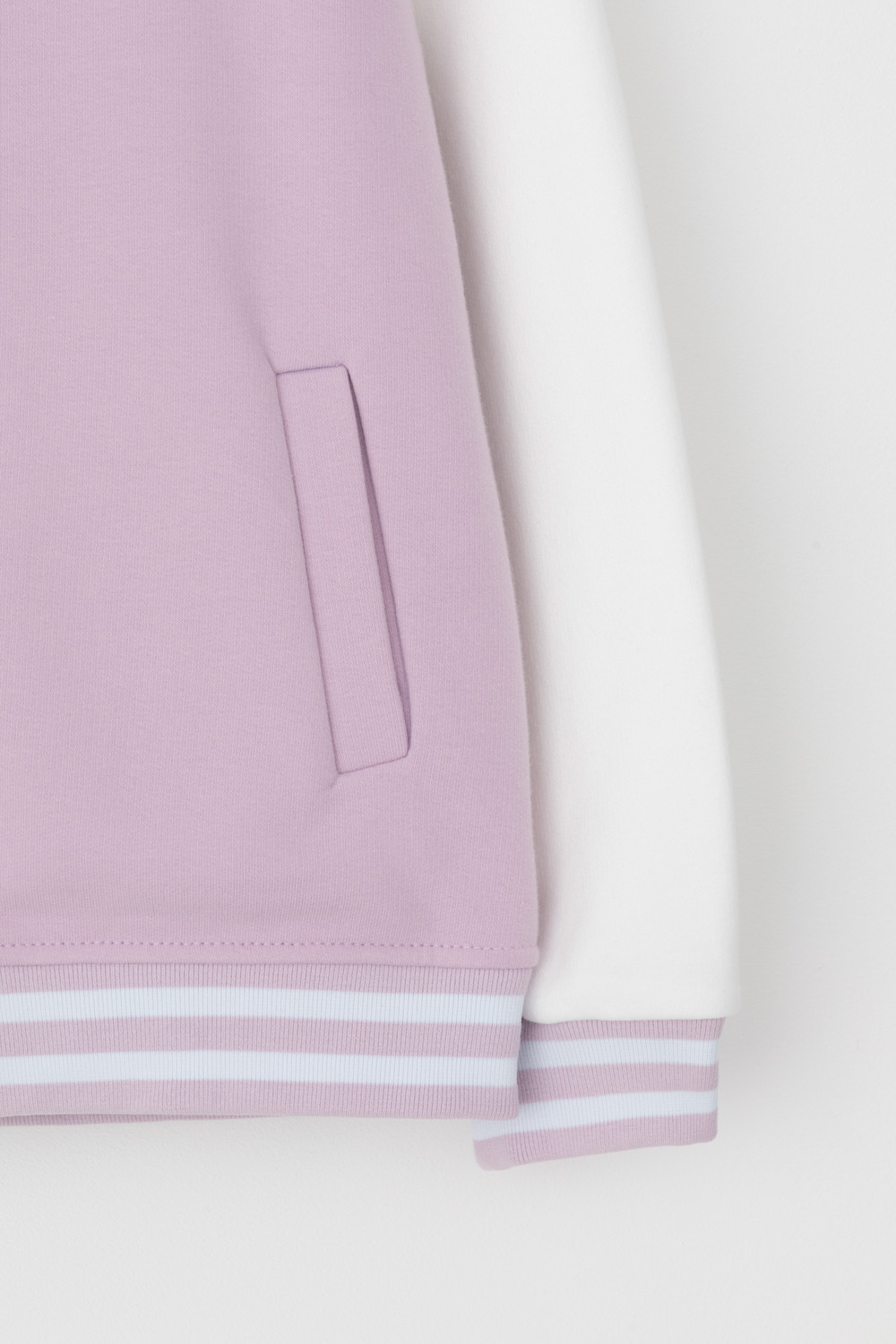 Бомбер для девочки с контрастными рукавами из мягкого трикотажа. Воротник, манжеты и пояс - вязаные. Спереди карманы с листочкой.