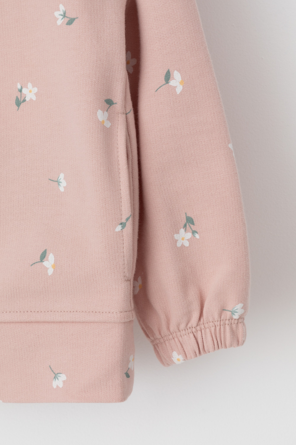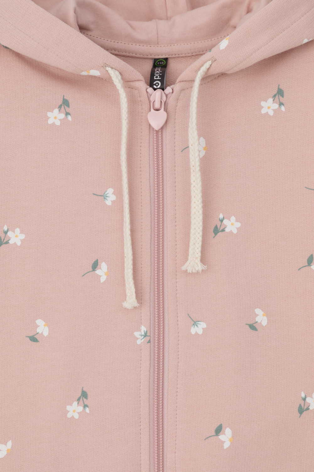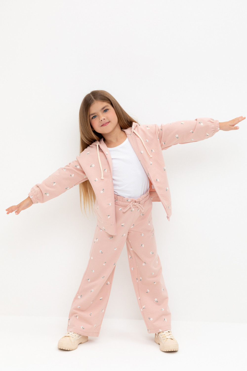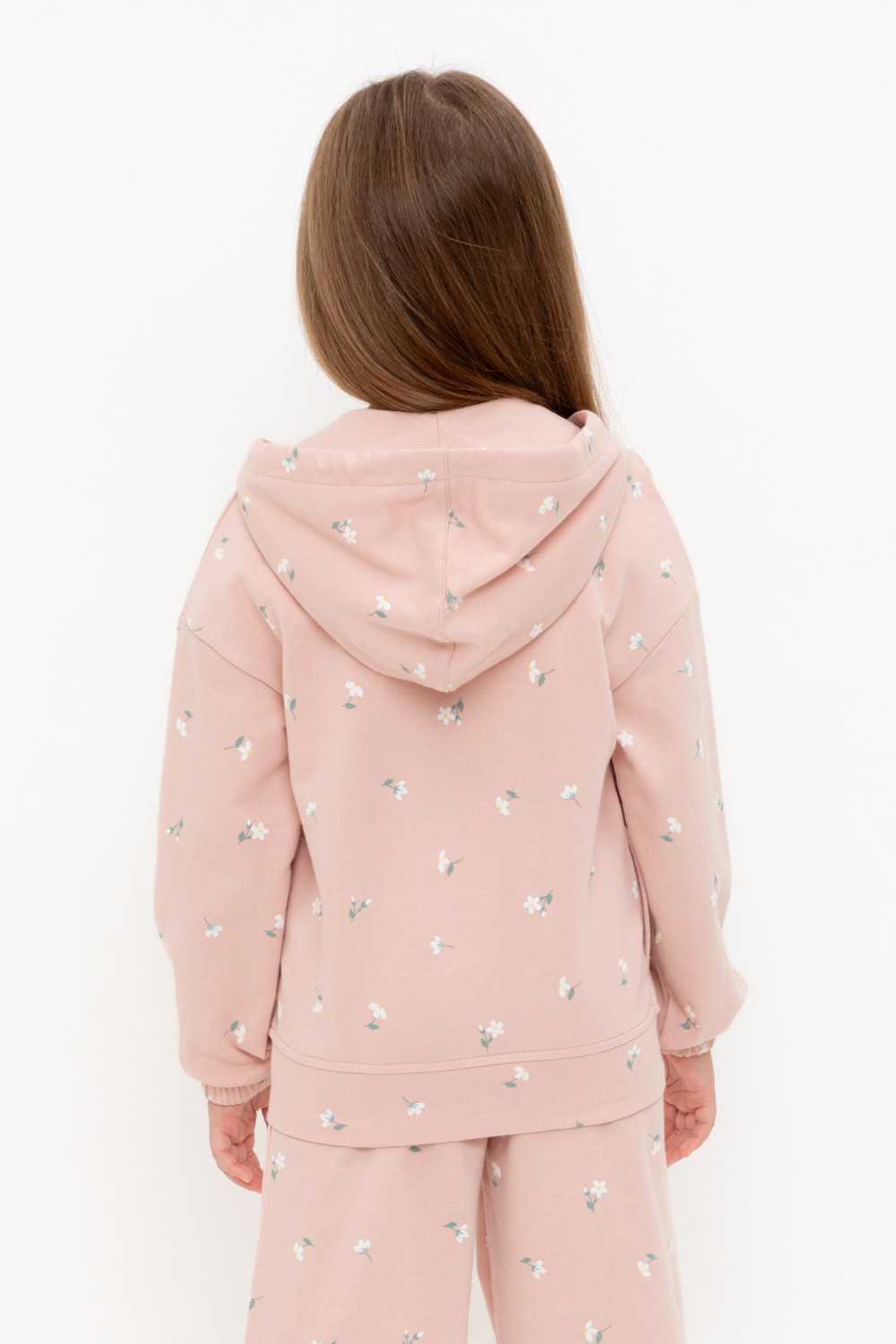 Трикотажная толстовка на молнии с капюшоном для девочки из мягкого набивного футера петли. Модель с боковыми карманами и манжетами на резинке.