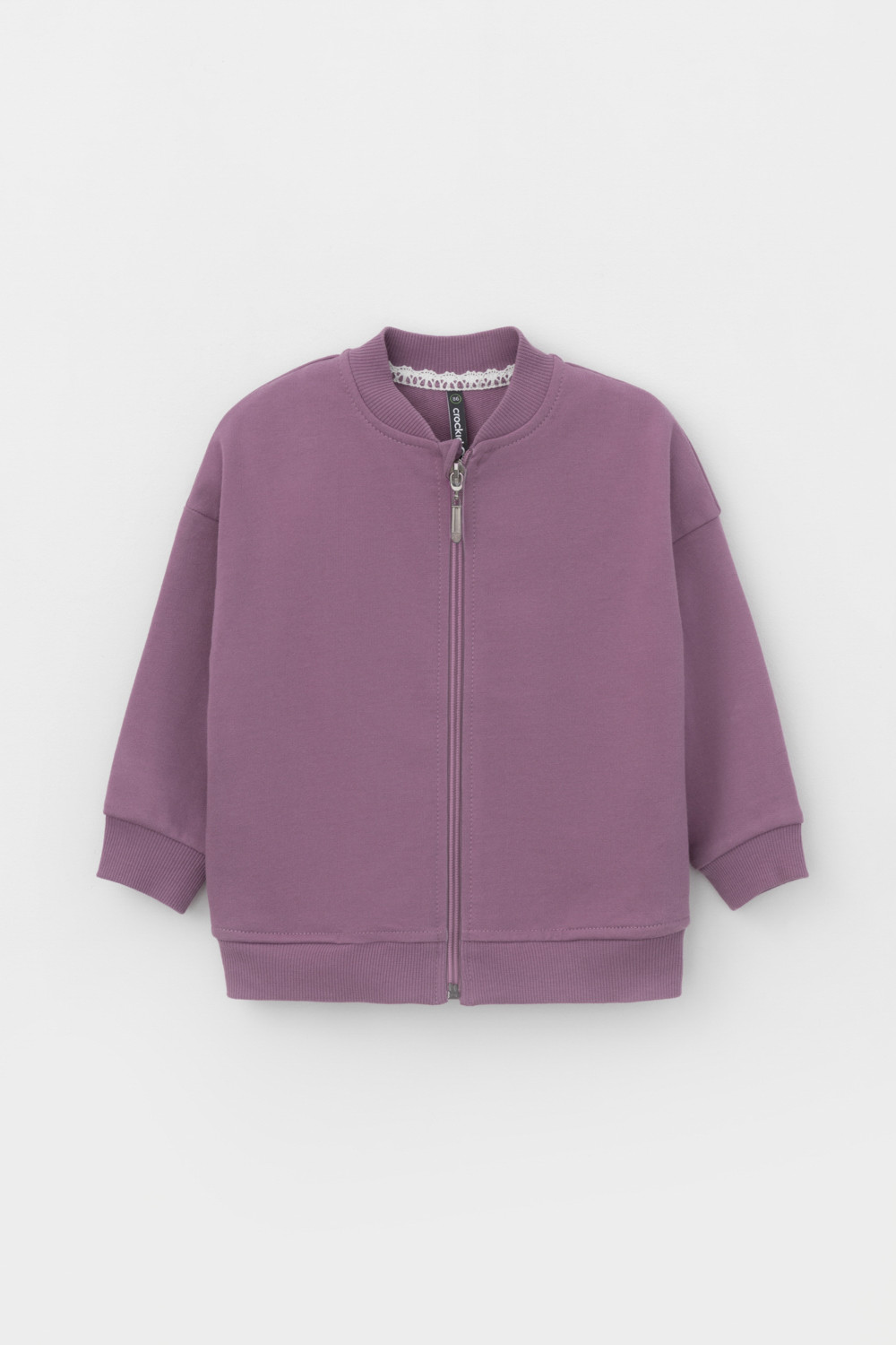 Трикотажный бомбер для девочки из петельчатого футера. По бокам выполнены карманы, манжеты и пояс из эластичного трикотажа в рубчик.
