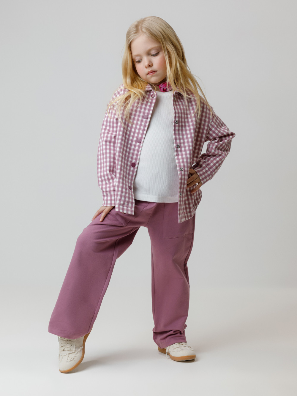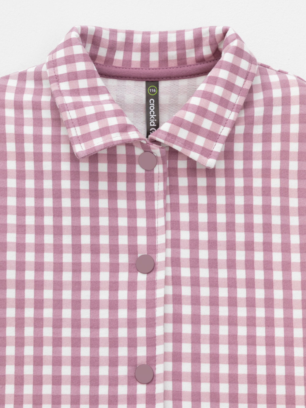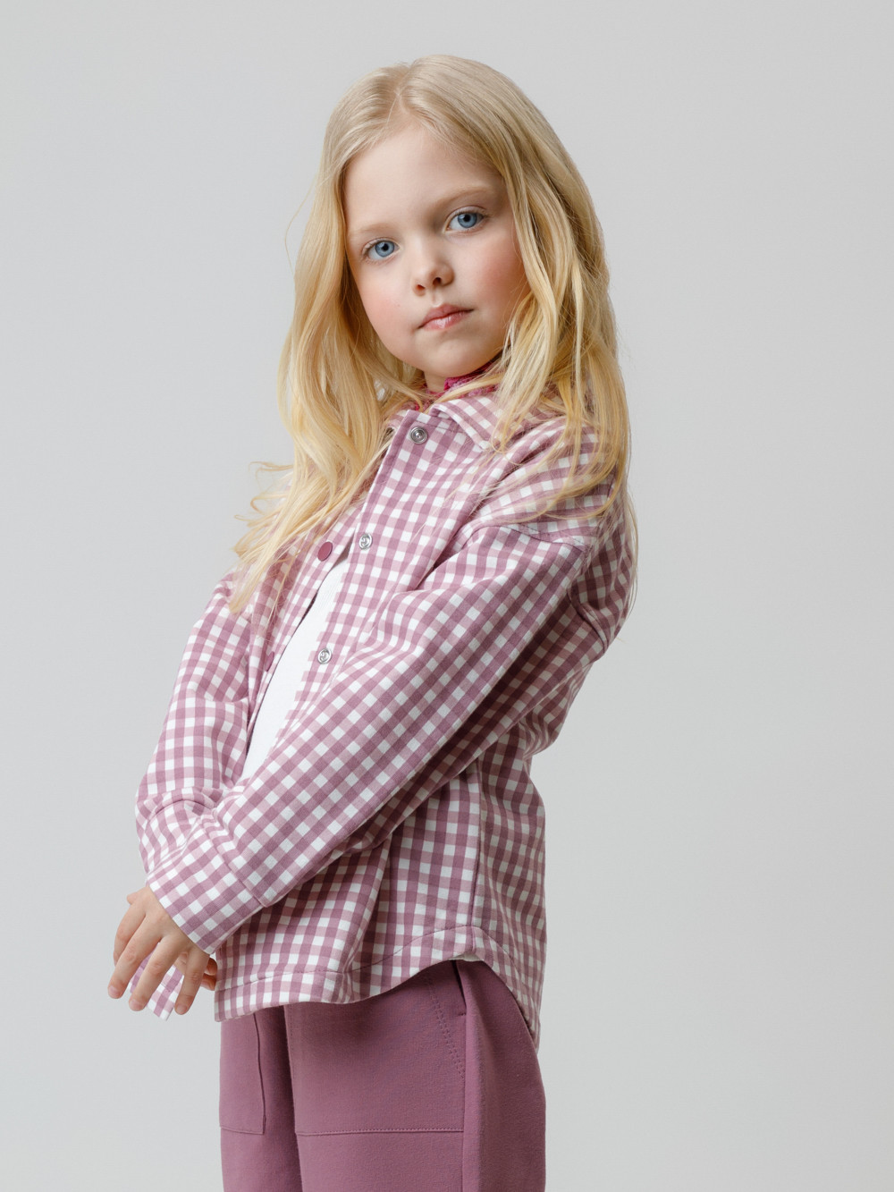 Свободная трикотажная рубашка для девочки из мягкого петельчатого футера. Застёгивается на кнопки. Модель с закругленным низом и спущенным плечом. Рисунок в клетку выполнен из стойких текстильных гипоаллергенных красителей. Изделие сохраняет цвет и форму после многократных стирок. Все трикотажные полотна производятся в соответствии с нормами швейцарского сертификата ЭкоТекс.