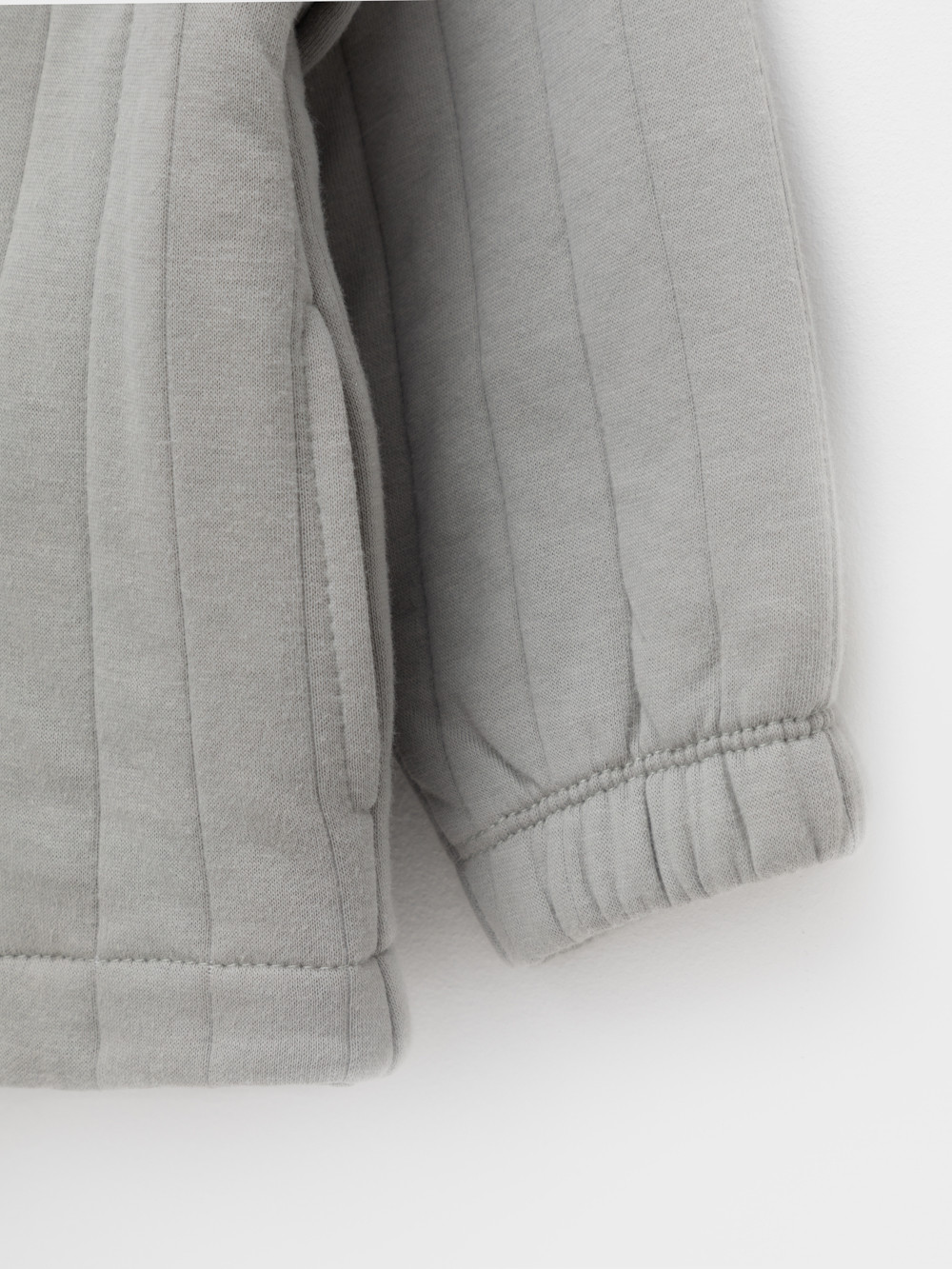 Тёплый бомбер для девочки из мягкого капитония. Капитоний – это стёганое трикотажное полотно с утеплителем из полиэстеровой нити. Модель со спущенным плечом застёгивается на кнопки. По бокам два кармана. Все трикотажные полотна производятся в соответствии с нормами швейцарского сертификата ЭкоТекс.