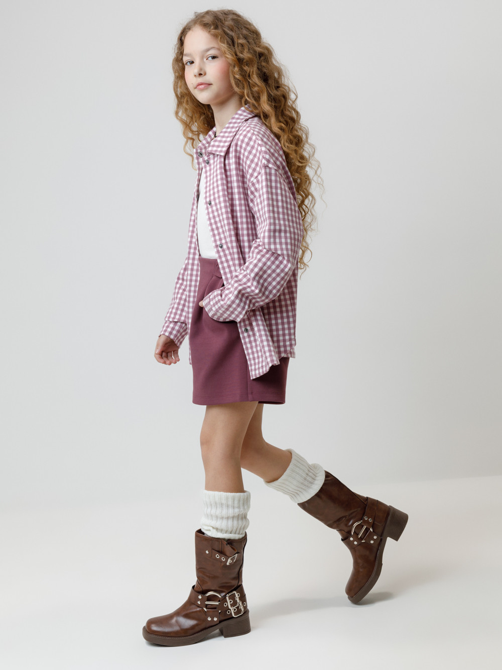 Свободная трикотажная рубашка для девочки из мягкого петельчатого футера. Застёгивается на кнопки. Модель с закругленным низом и спущенным плечом. Рисунок в клетку выполнен из стойких текстильных гипоаллергенных красителей. Изделие сохраняет цвет и форму после многократных стирок. Все трикотажные полотна производятся в соответствии с нормами швейцарского сертификата ЭкоТекс.