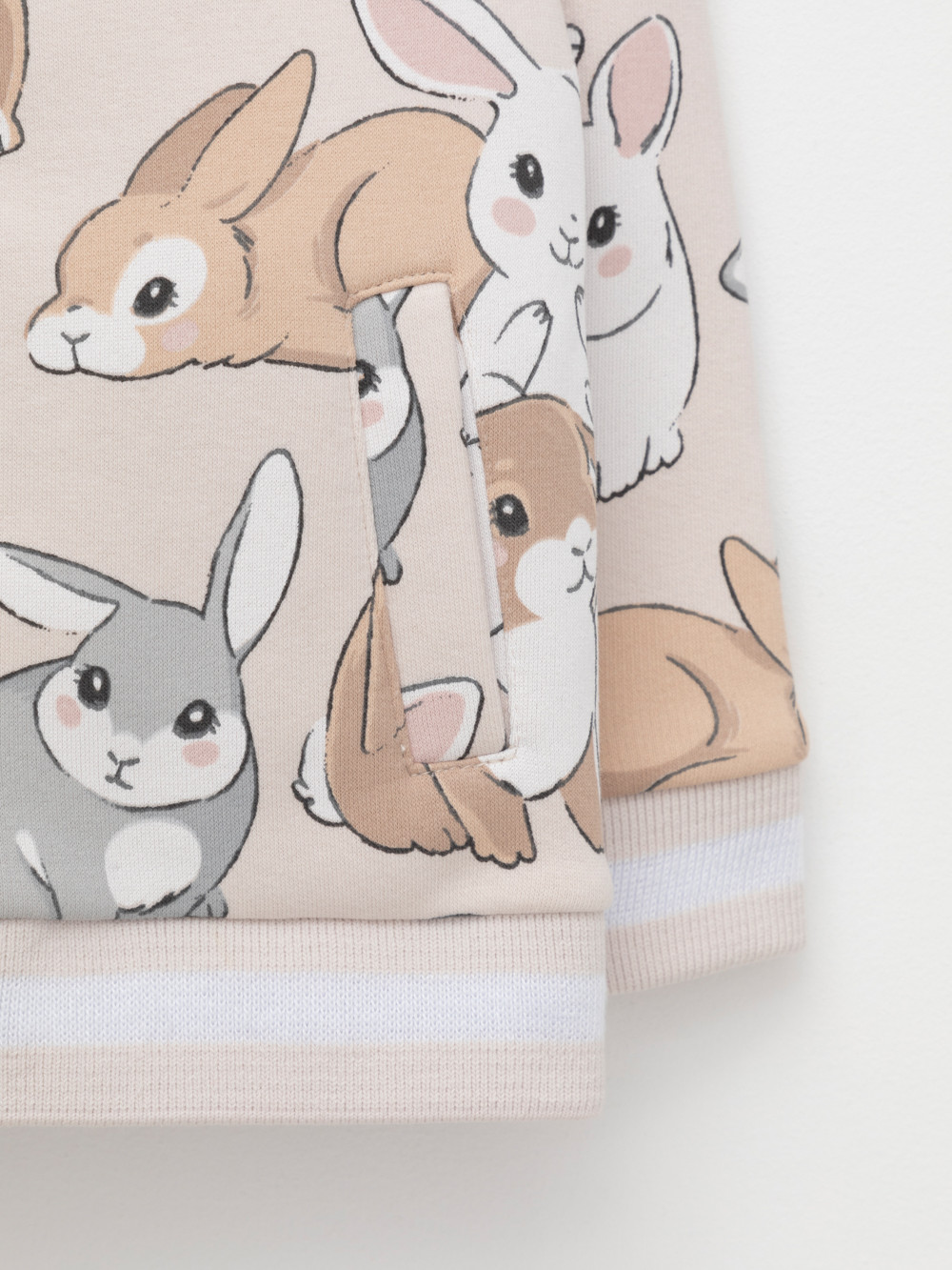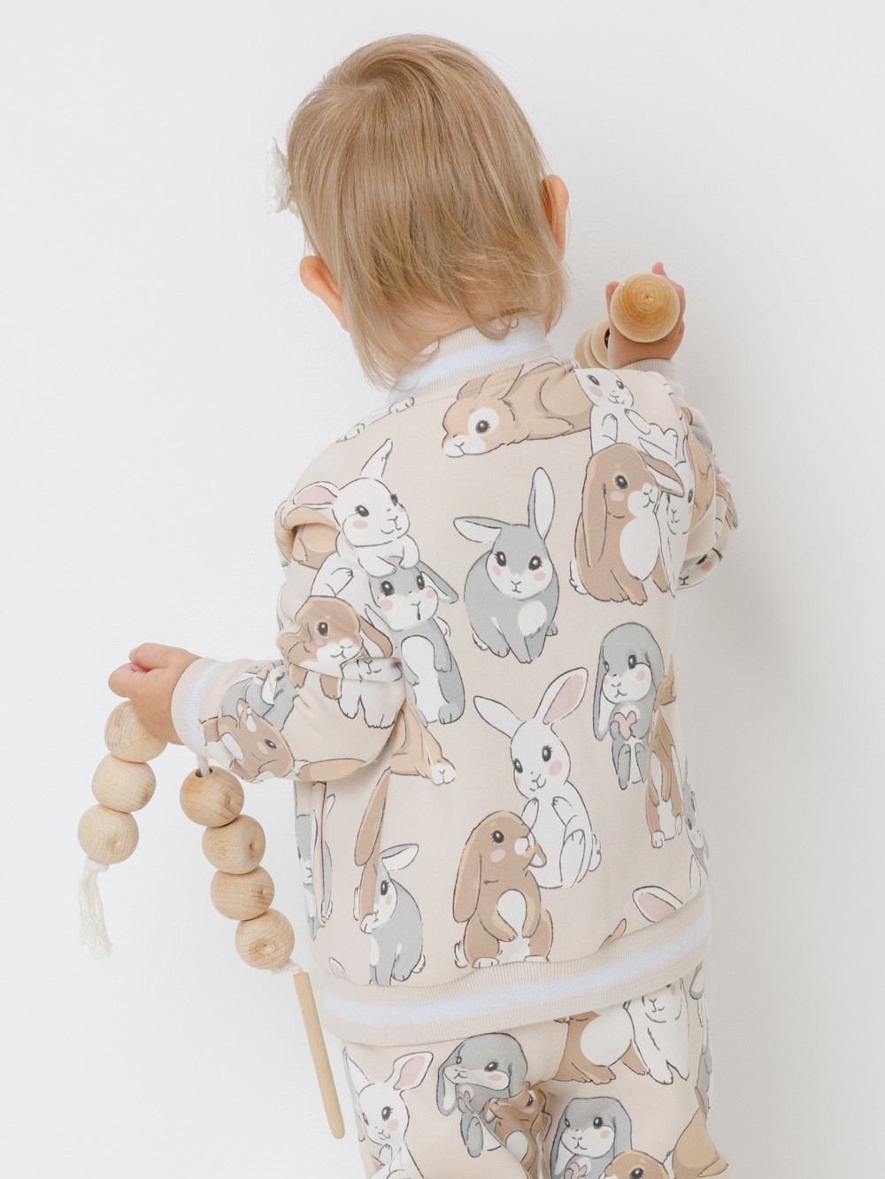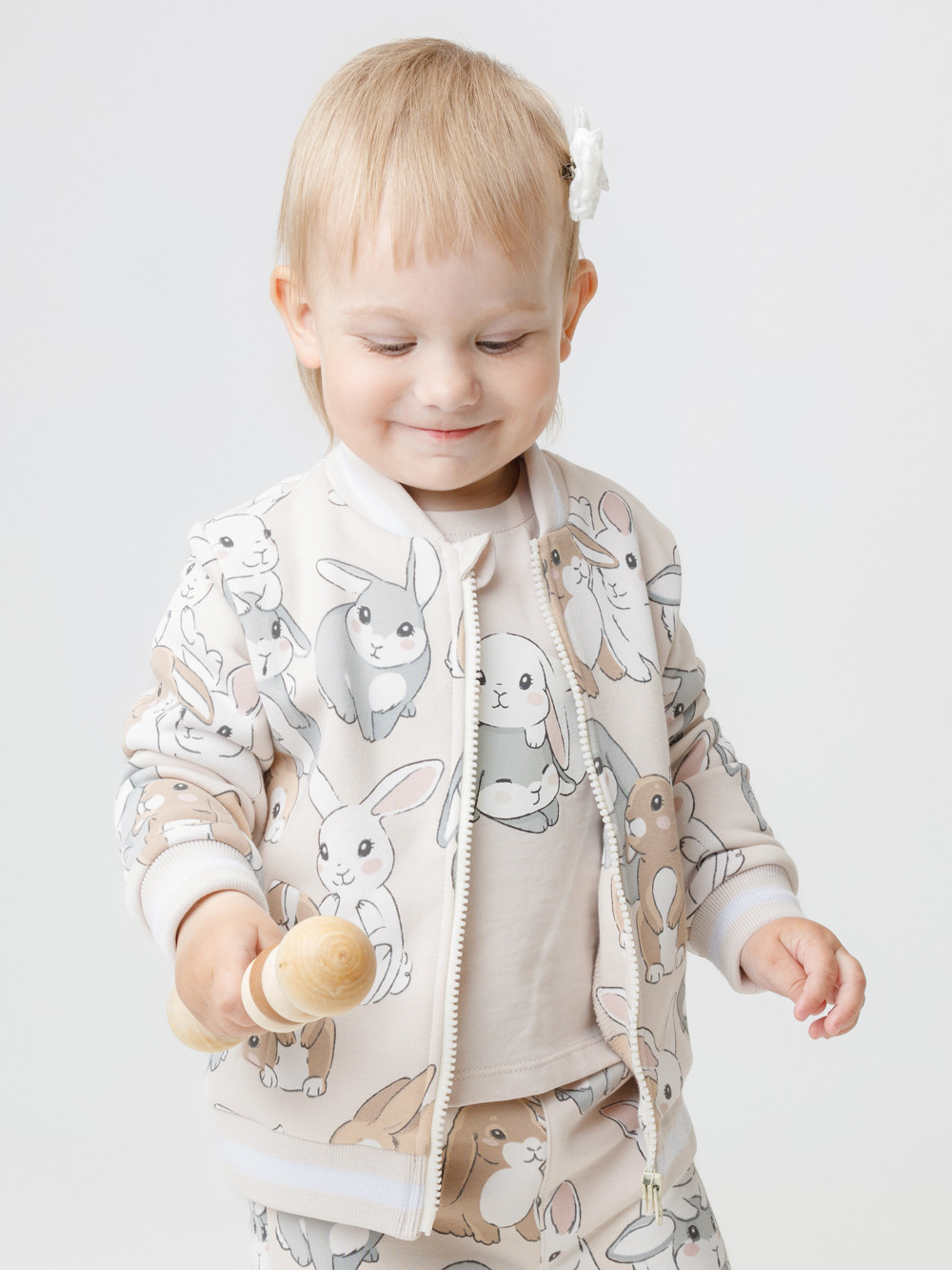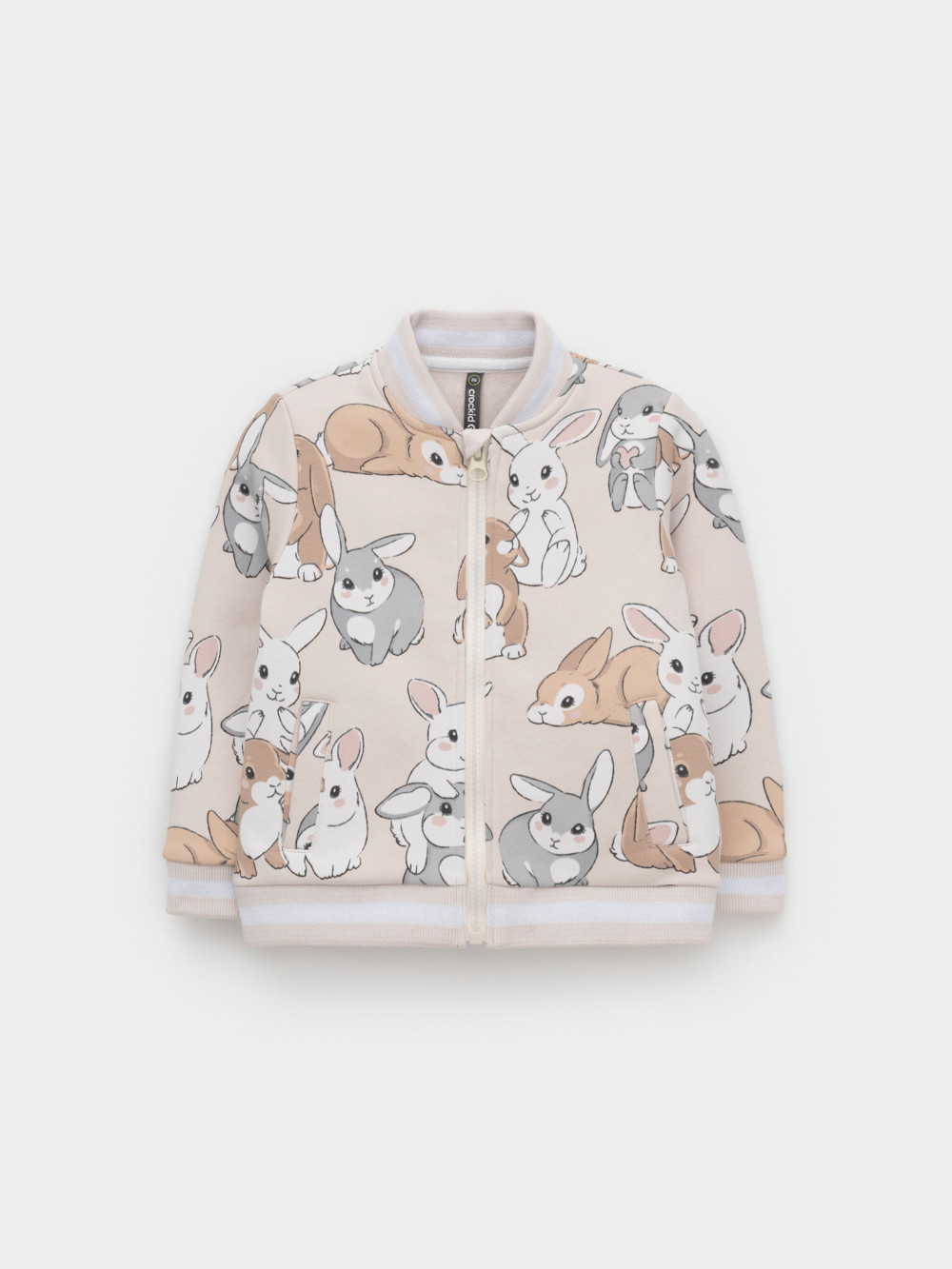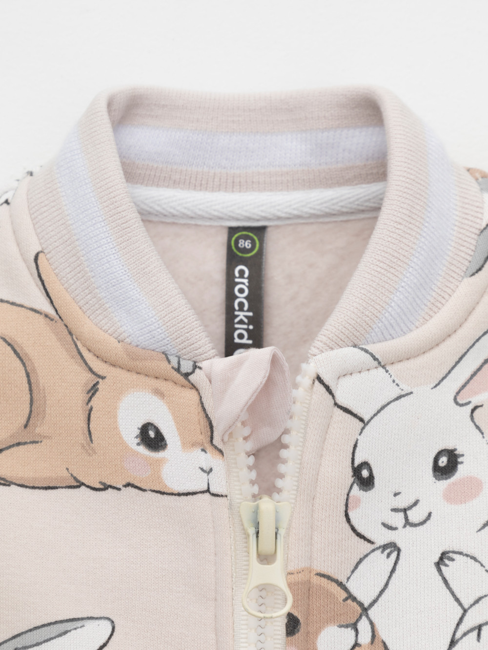 Мягкий бомбер на молнии для девочки. Изготовлен из высококачественного футера с начёсом. Воротник, манжеты и пояс вязаные. Оригинальный рисунок выполнен из стойких текстильных красителей. Бомбер сохраняет форму и стойкий цвет после многочисленных стирок. Все трикотажные полотна производятся в соответствии с нормами швейцарского сертификата ЭкоТекс.