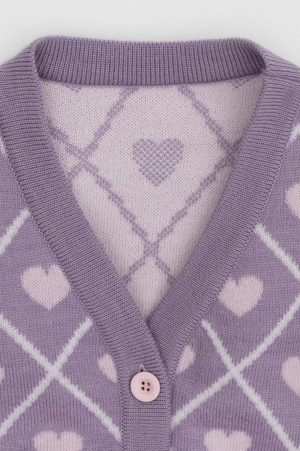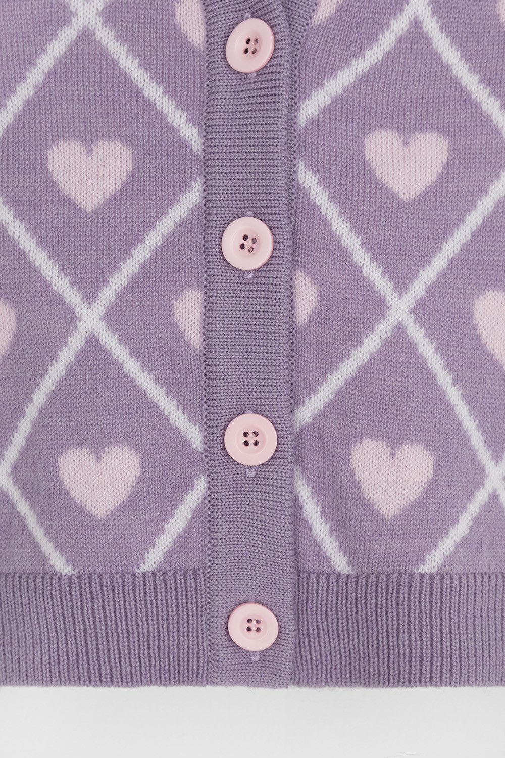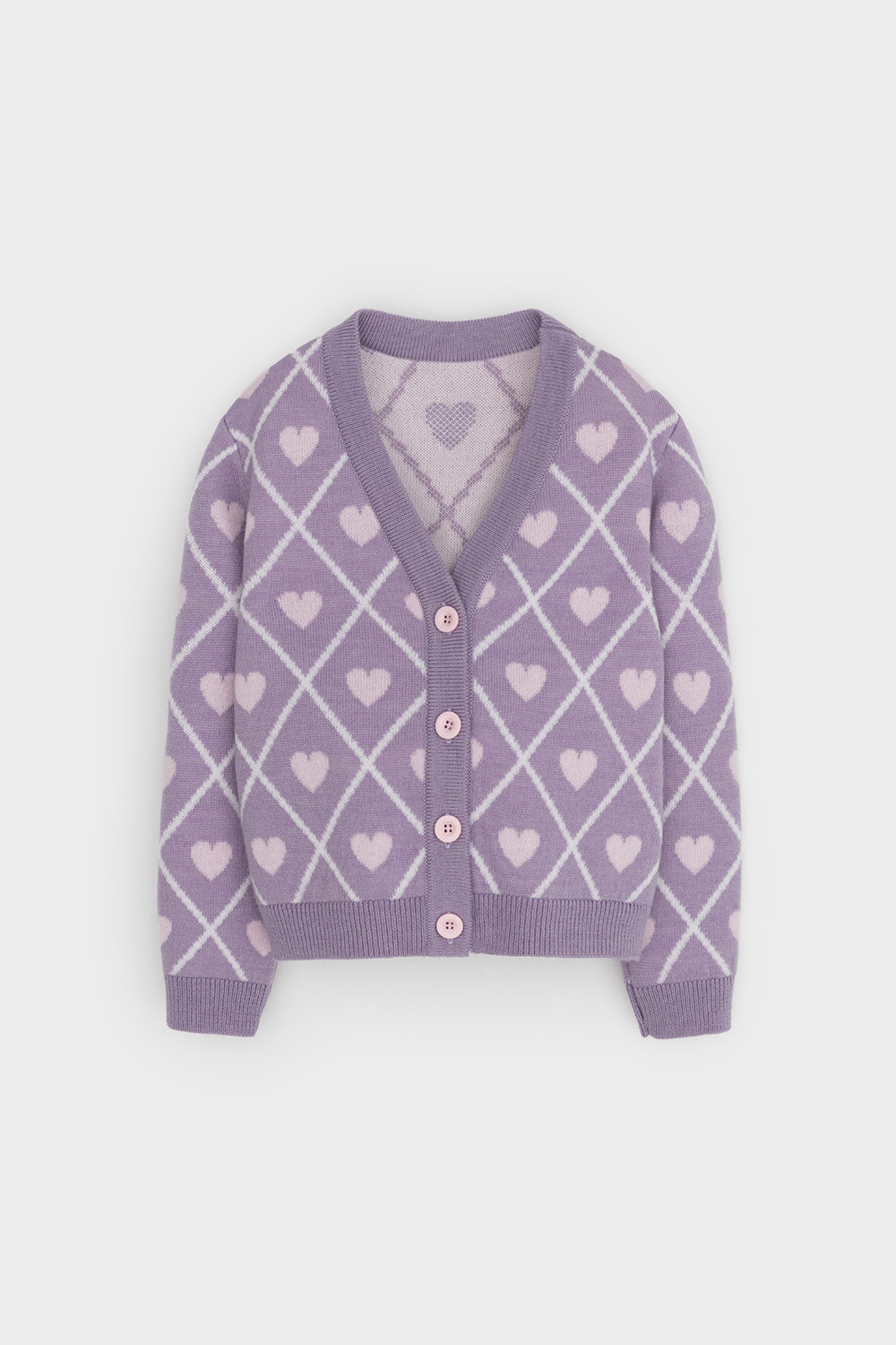 Вязаный кардиган с сердечками для девочки. Изготовлен из мягкой полушерстяной пряжи. Застёгивается на планку с пуговицами. Длинные рукава с манжетами. Внизу эластичный пояс. Изделие сохраняет форму и стойкий цвет после многочисленных стирок.