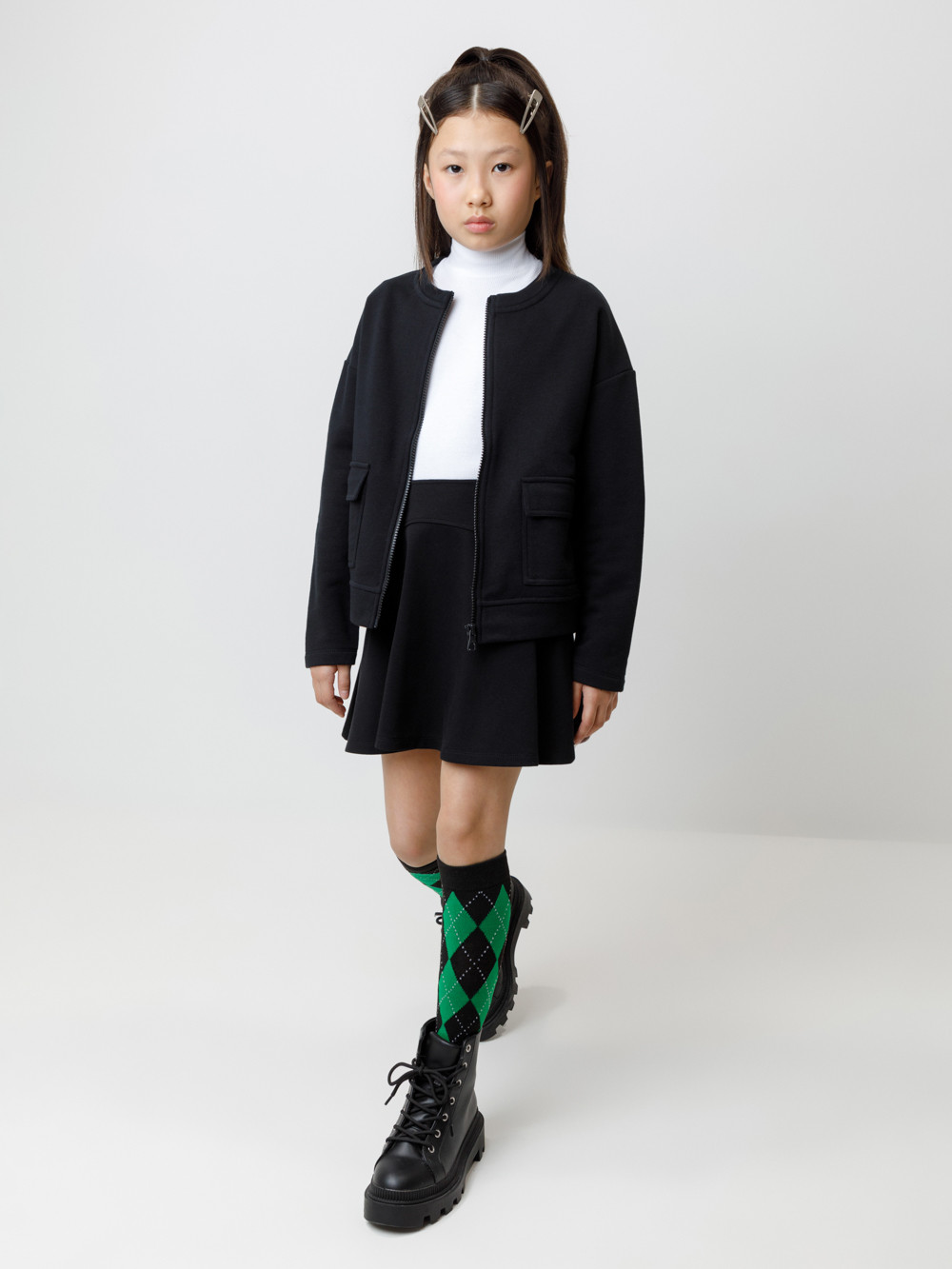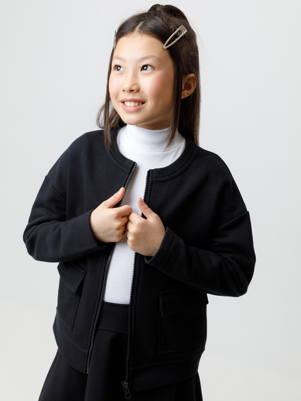 Бомбер школьный для девочки со спущенными плечами из высококачественного петельчатого футера. Застёгивается на молнию. По бокам два накладных кармана.
