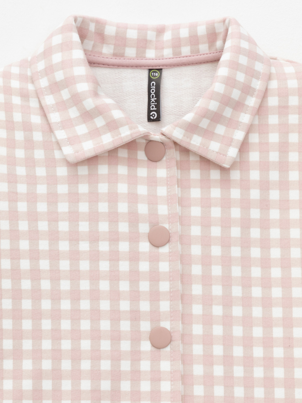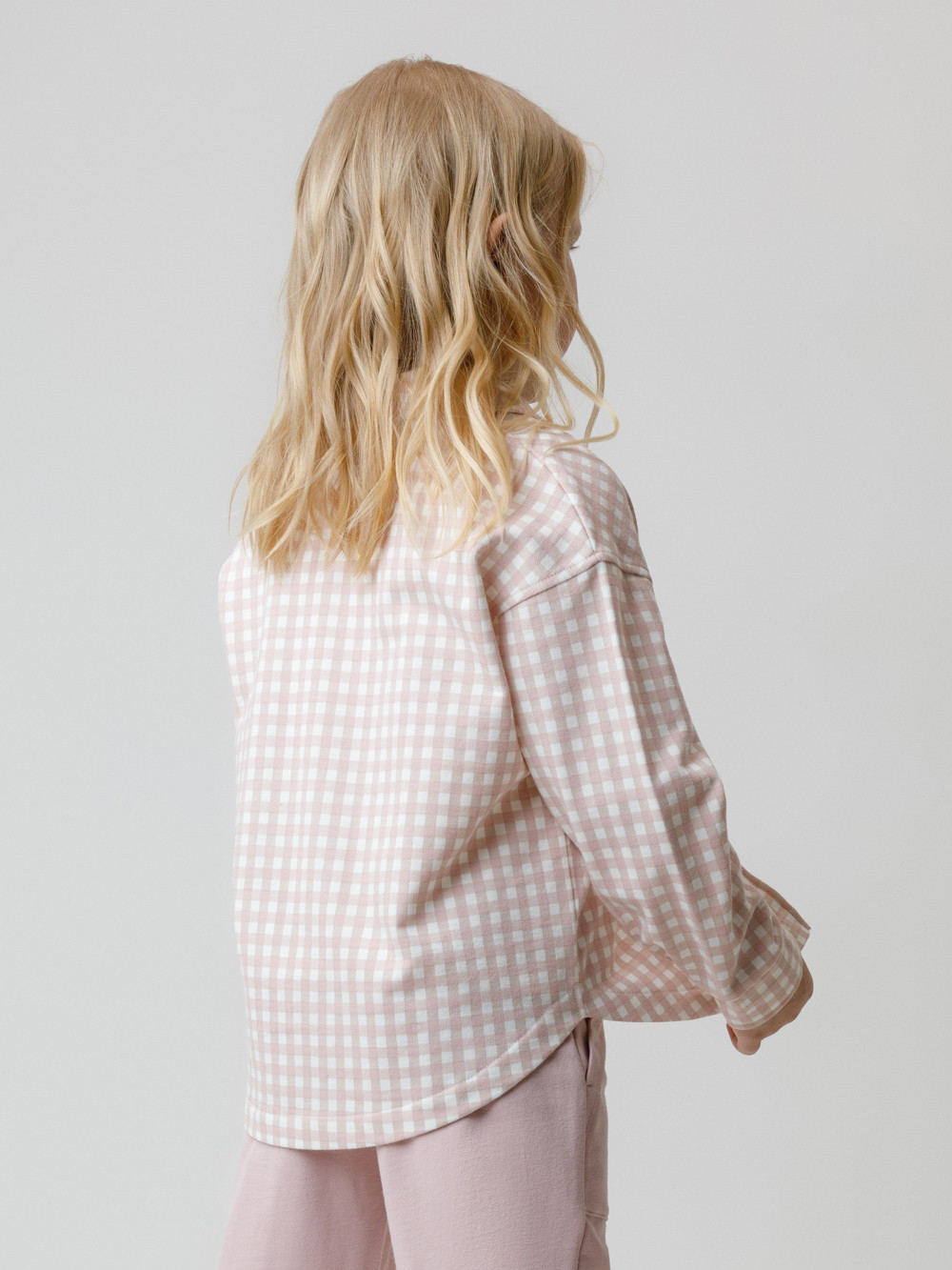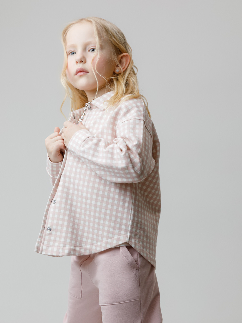 Свободная трикотажная рубашка для девочки из мягкого петельчатого футера. Застёгивается на кнопки. Модель с закругленным низом и спущенным плечом. Рисунок в клетку выполнен из стойких текстильных гипоаллергенных красителей. Изделие сохраняет цвет и форму после многократных стирок. Все трикотажные полотна производятся в соответствии с нормами швейцарского сертификата ЭкоТекс.