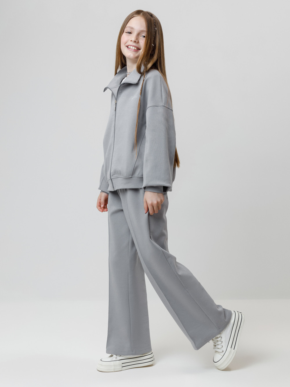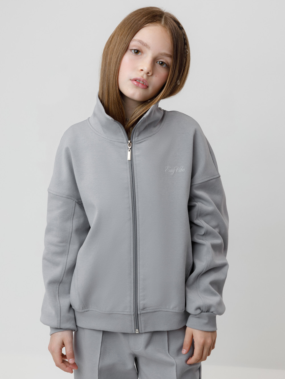 Бомбер для девочки со спущенными плечами и воротником-стойкой. Изготовлен из премиального трикотажного полотна DOUBLE FACE. Застёгивается на молнию. Манжеты и пояс выполнены из эластичного полотна. Изделие сохраняет цвет и форму после многократных стирок. Все трикотажные полотна производятся в соответствии с нормами швейцарского сертификата ЭкоТекс.
