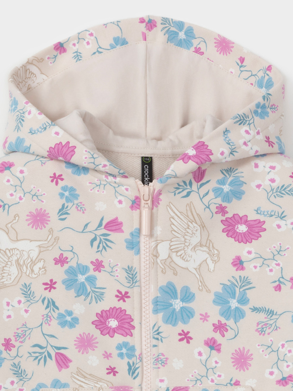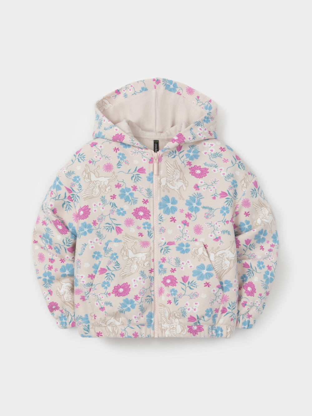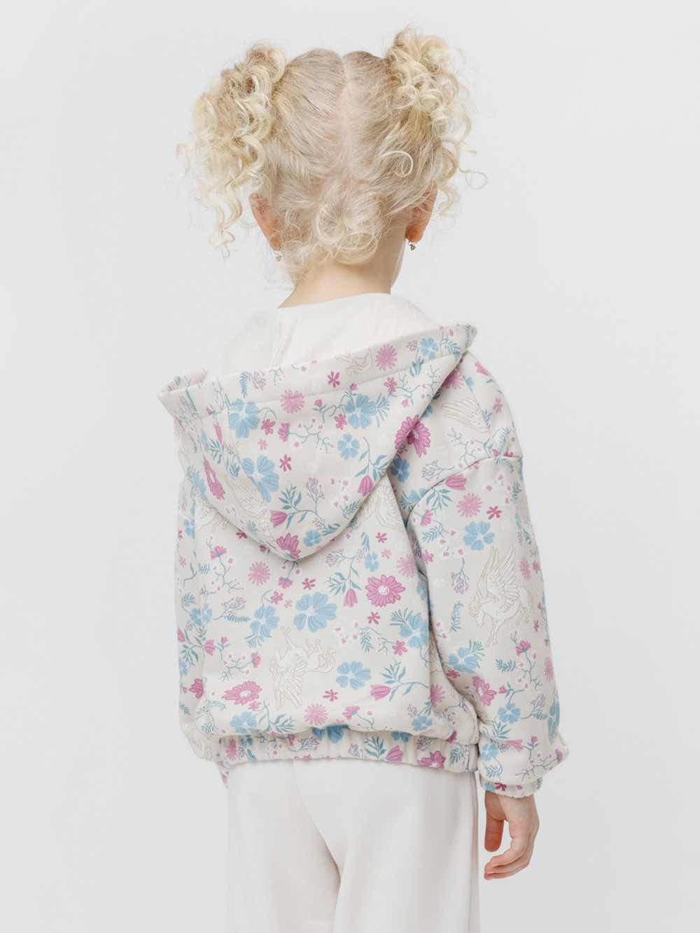 Трикотажная толстовка с капюшоном для девочки. Изготовлена из мягкого футера с оригинальным рисунком. В составе 80% натурального хлопка и 20% полиэстера, при этом полиэстер ввязан внутрь по особой технологии и не соприкасается с кожей. Застёгивается на молнию. Манжеты и пояс на резинке. Изделие сохраняет цвет и форму после многократных стирок. Все трикотажные полотна производятся в соответствии с нормами швейцарского сертификата ЭкоТекс.