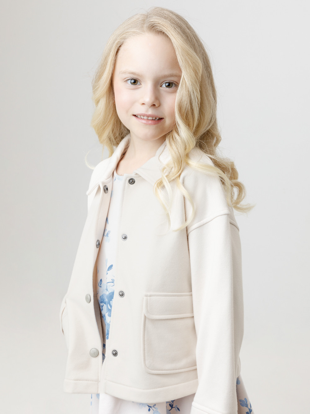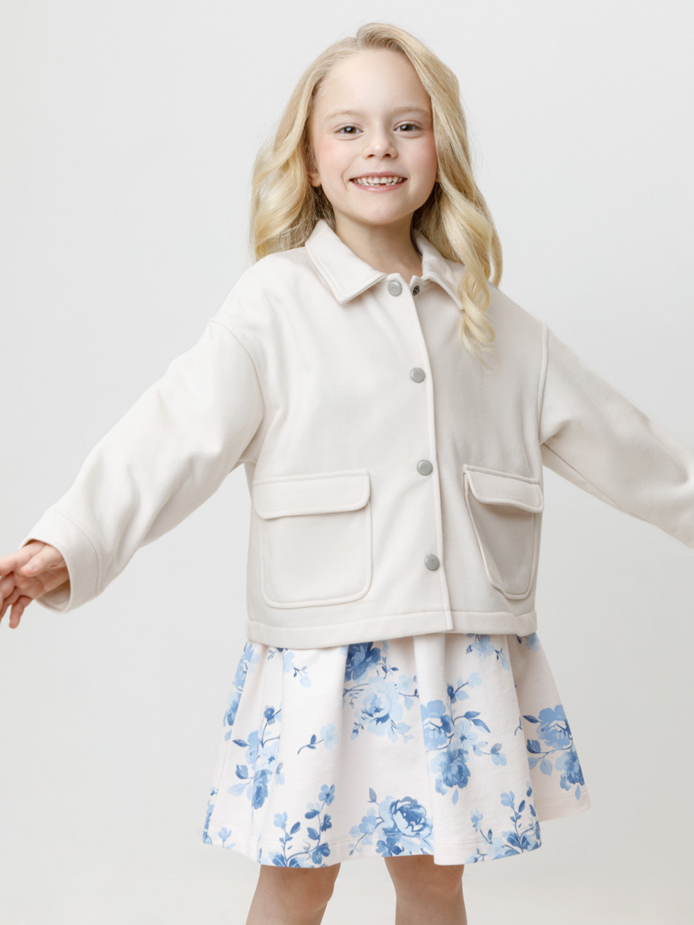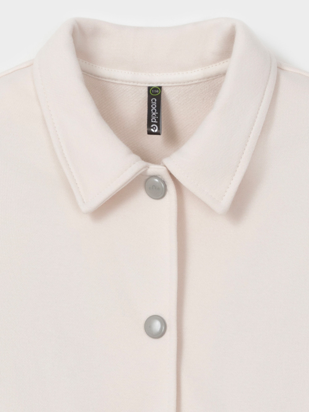 Трикотажная рубашка для девочки из мягкого футера. Застёгивается на кнопки-пуговицы. Модель со спущенным плечом. Спереди карманы. Изделие сохраняет цвет и форму после многократных стирок. Все трикотажные полотна производятся в соответствии с нормами швейцарского сертификата ЭкоТекс.