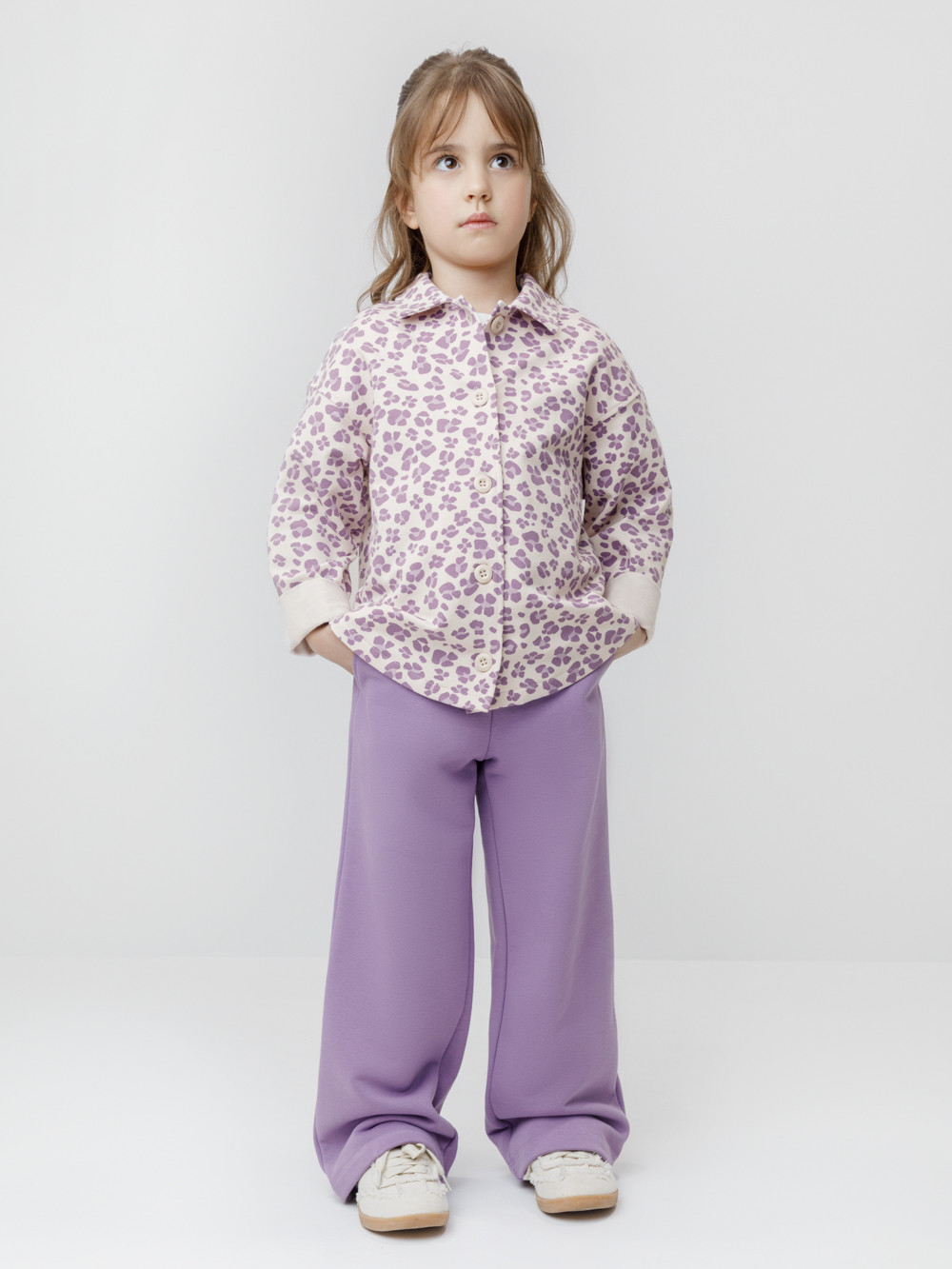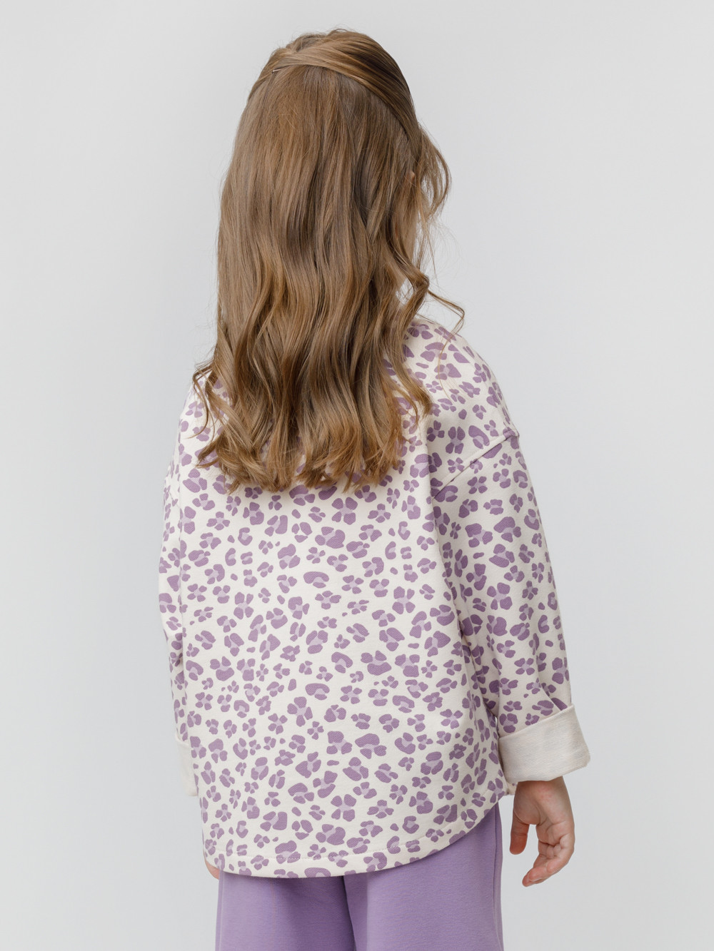 Свободная трикотажная рубашка для девочки из мягкого петельчатого футера. Застёгивается на пуговицы. Модель с закруглённым низом и спущенным плечом. Изделие сохраняет цвет и форму после многократных стирок. Все трикотажные полотна производятся в соответствии с нормами швейцарского сертификата ЭкоТекс.