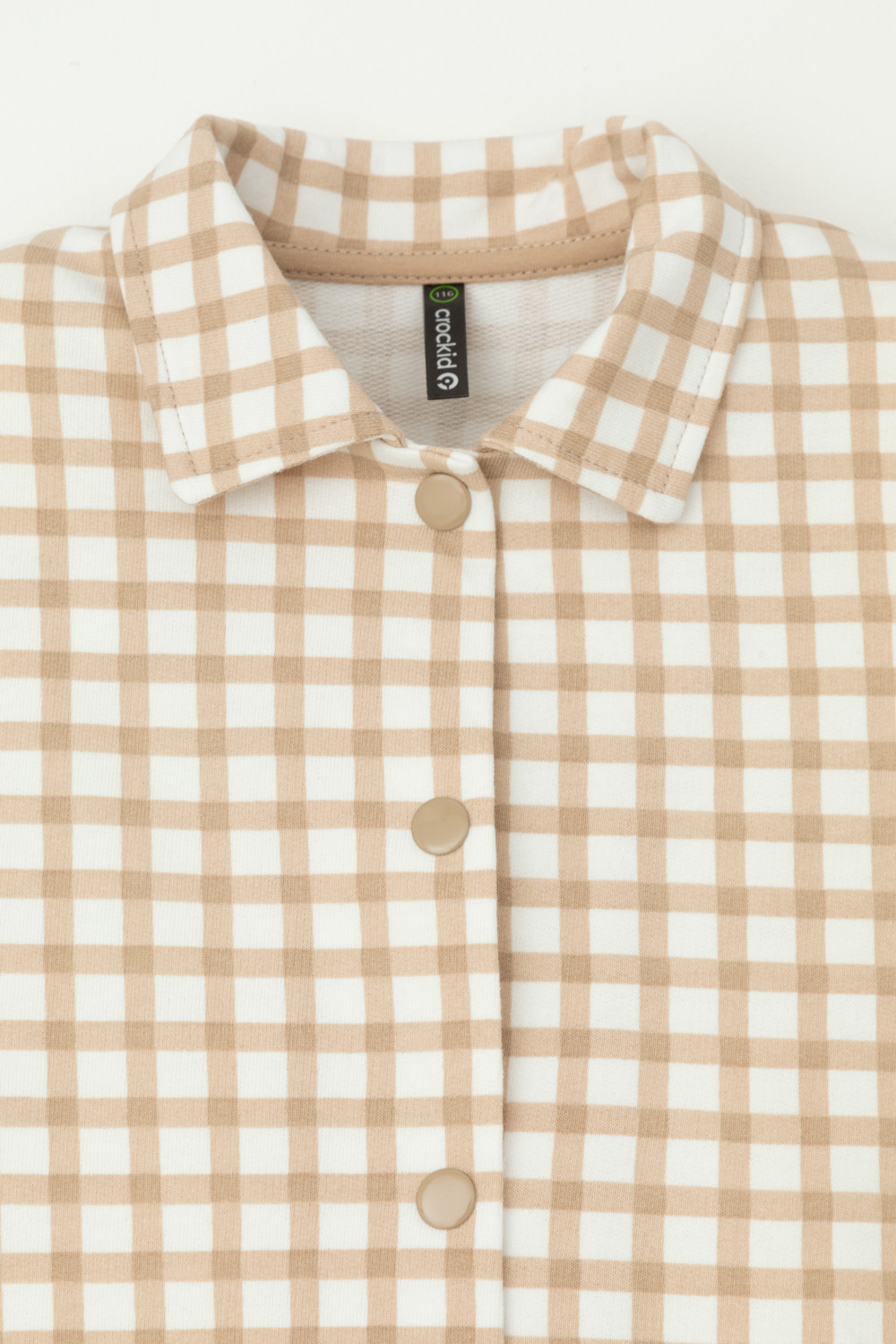 Свободная трикотажная рубашка для девочки из мягкого петельчатого футера. Застёгивается на кнопки. Модель с закругленным низом и спущенным плечом. Рисунок в клетку выполнен из стойких текстильных гипоаллергенных красителей.