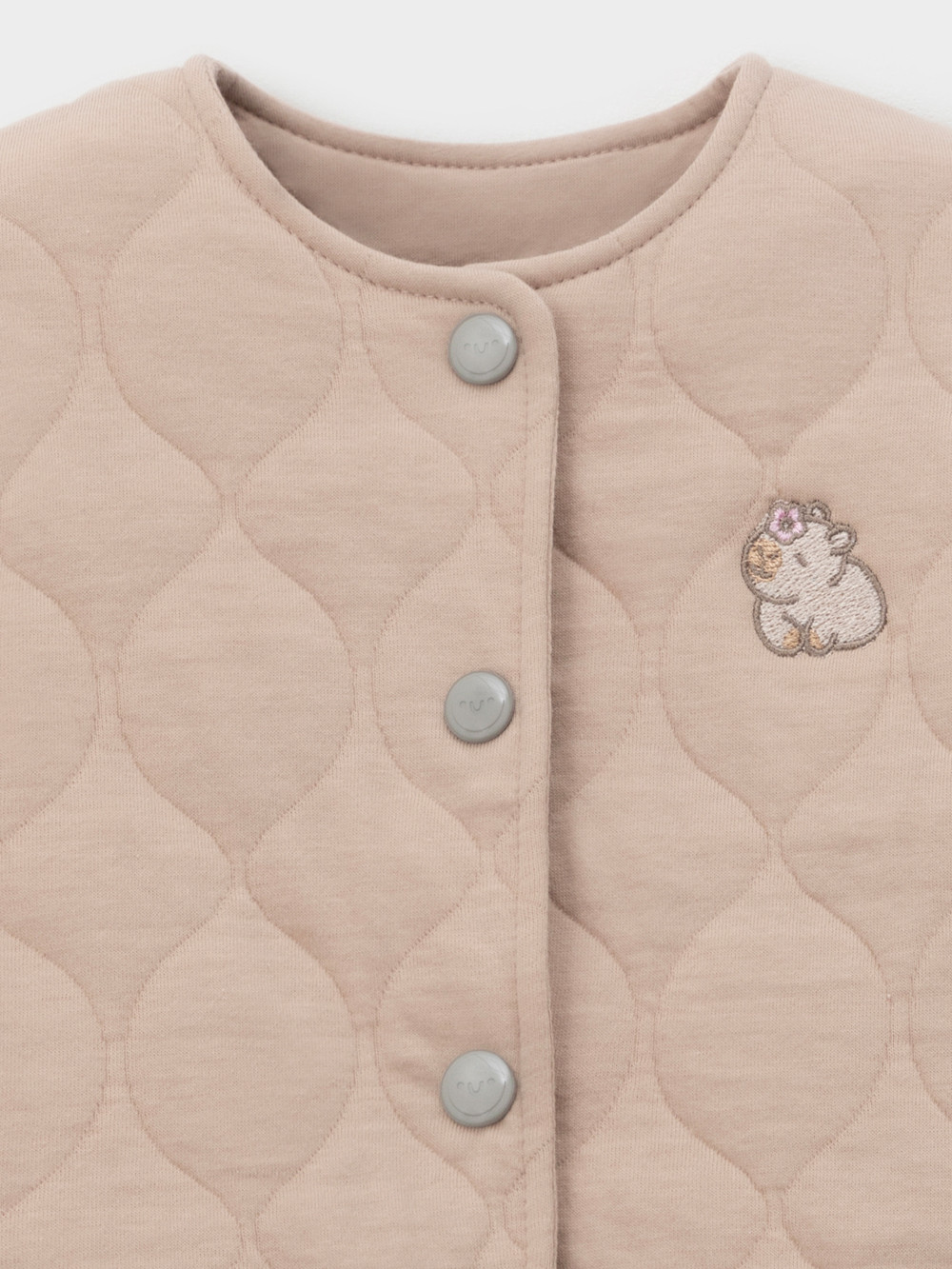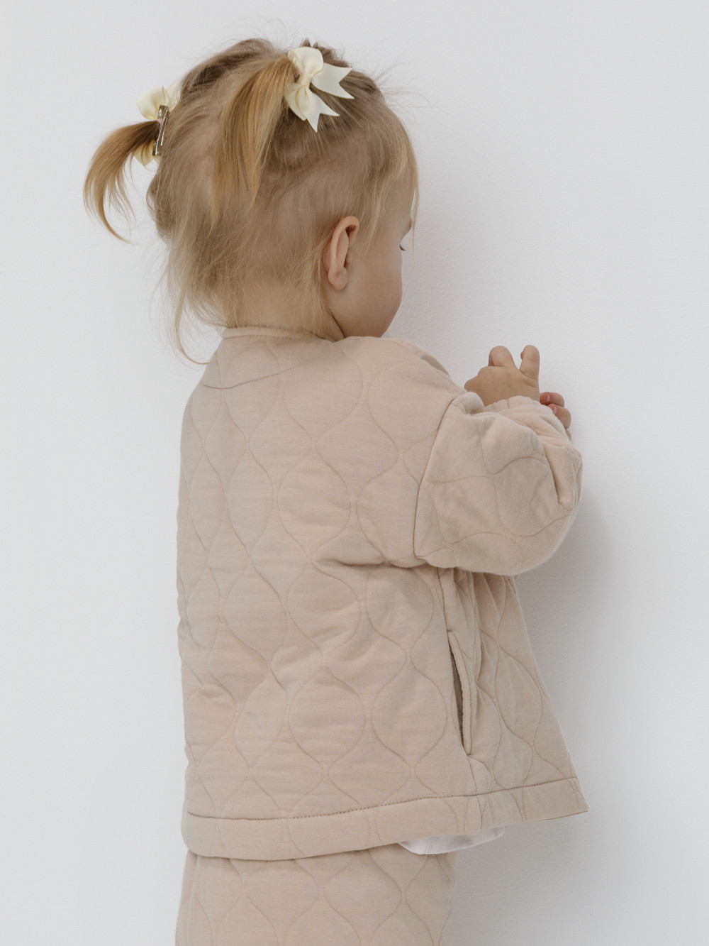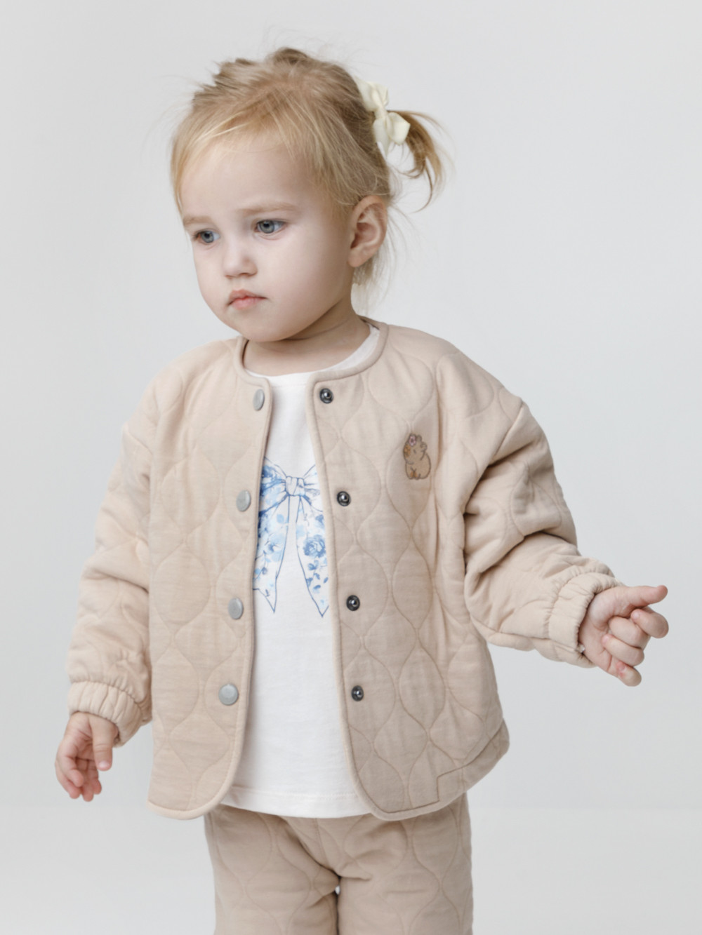 Тёплый бомбер из капитония для девочки.  Капитоний — это стёганое трикотажное полотно с утеплителем из полиэстеровой нити. Модель застёгивается на кнопки. На рукавах эластичные манжеты на резинке. Изделие сохраняет цвет и форму после многократных стирок. Все трикотажные полотна производятся в соответствии с нормами швейцарского сертификата ЭкоТекс.