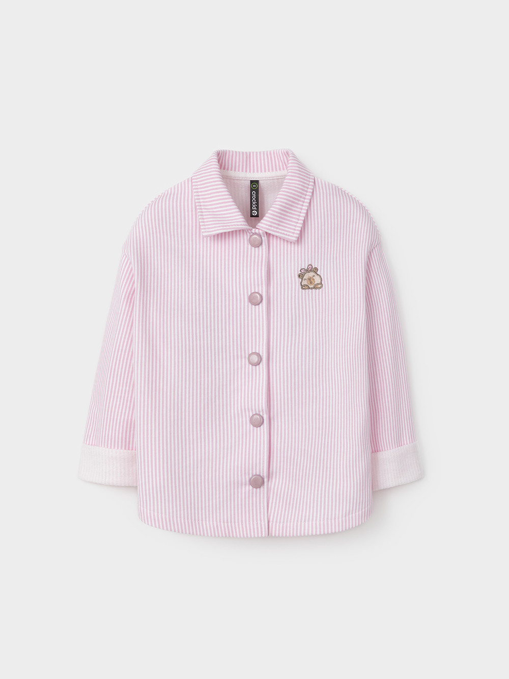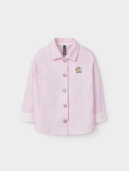 Свободная трикотажная рубашка для девочки из мягкого петельчатого футера. Застёгивается на кнопки. Модель с закруглённым низом и спущенным плечом. Рисунок в полоску выполнен из стойких текстильных гипоаллергенных красителей. Изделие сохраняет цвет и форму после многократных стирок. Все трикотажные полотна производятся в соответствии с нормами швейцарского сертификата ЭкоТекс.