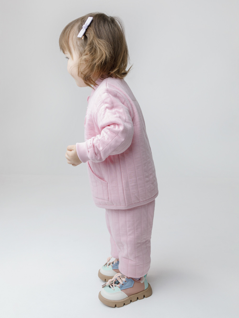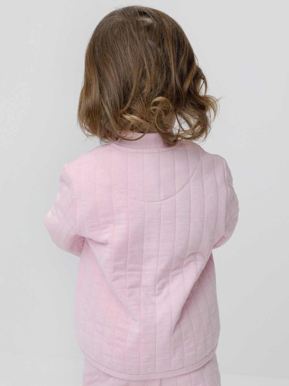 Тёплая куртка из капитония для девочки. Капитоний — это стёганое трикотажное полотно с утеплителем из полиэстеровой нити. Изделие застёгивается на молнию с мягкой защитой шеи и подбородка.  Эластичные манжеты на рукавах. Спереди два кармана. Все трикотажные полотна производятся в соответствии с нормами швейцарского сертификата ЭкоТекс.