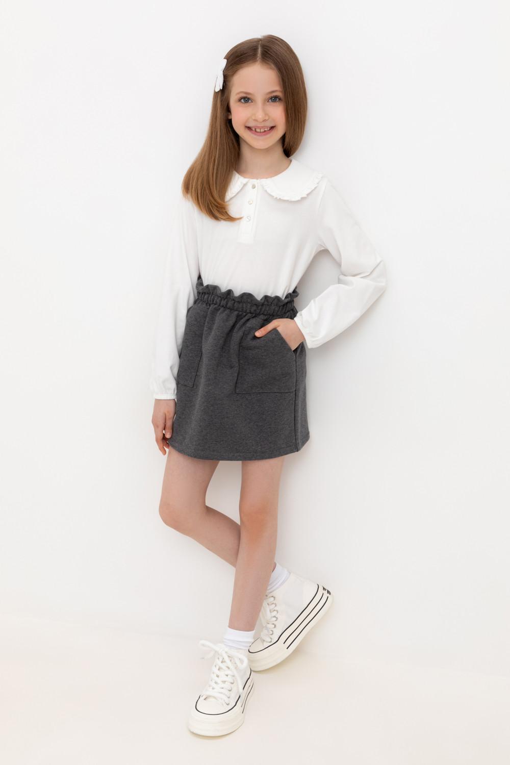 Юбка для девочки на резинке с накладными карманами из петельчатого футера.