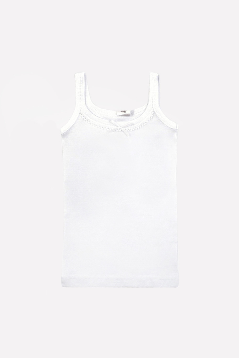 Майка на бретелях из однотонного ластика бесшовная, проймы и горловина обработаны  бейкой, мережка по горловине, атласный бантик на полочке.