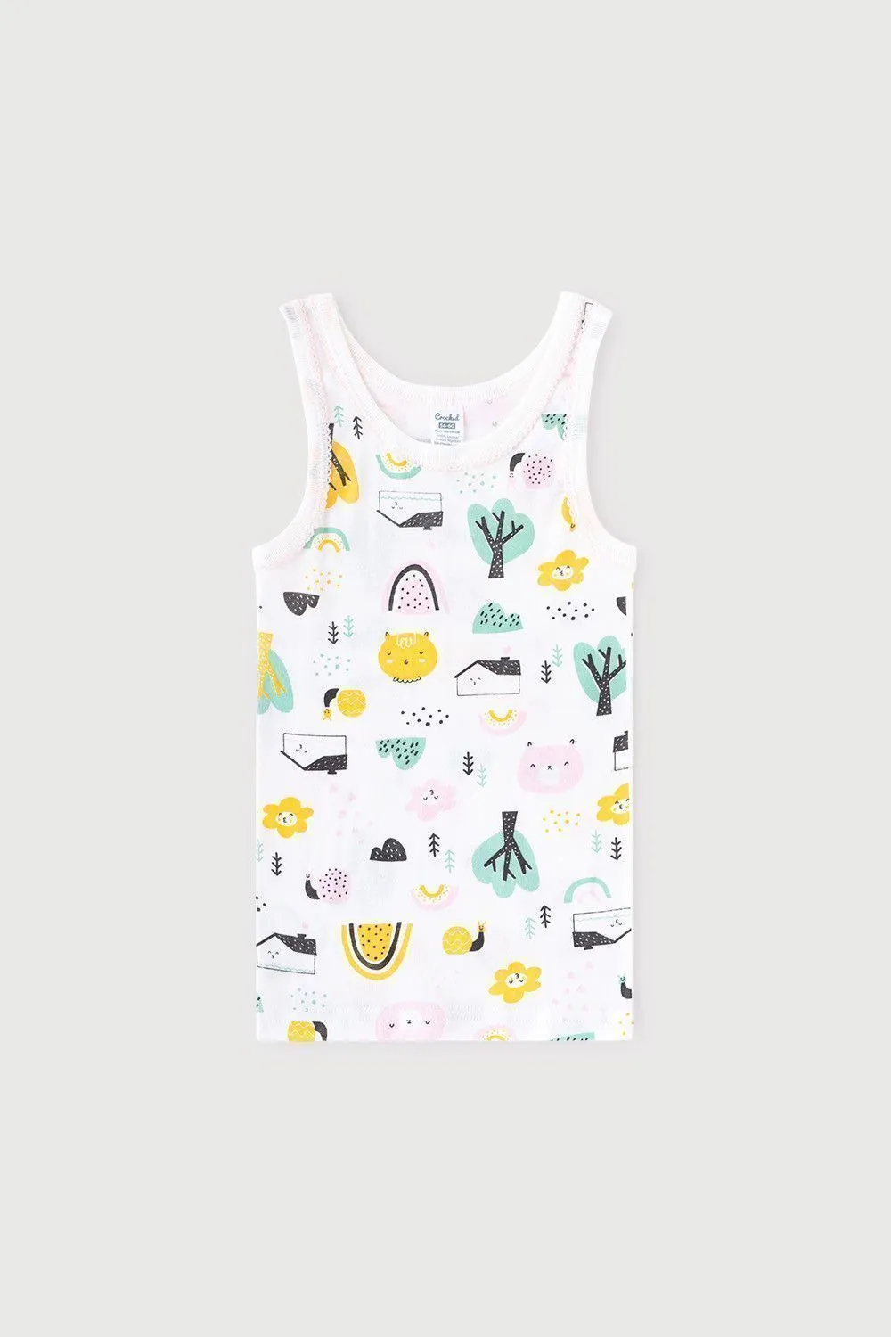 Майка на лямках из натурального хлопка. Сшита из эластичного материала рибана пенье. Украшена набивным рисунком.