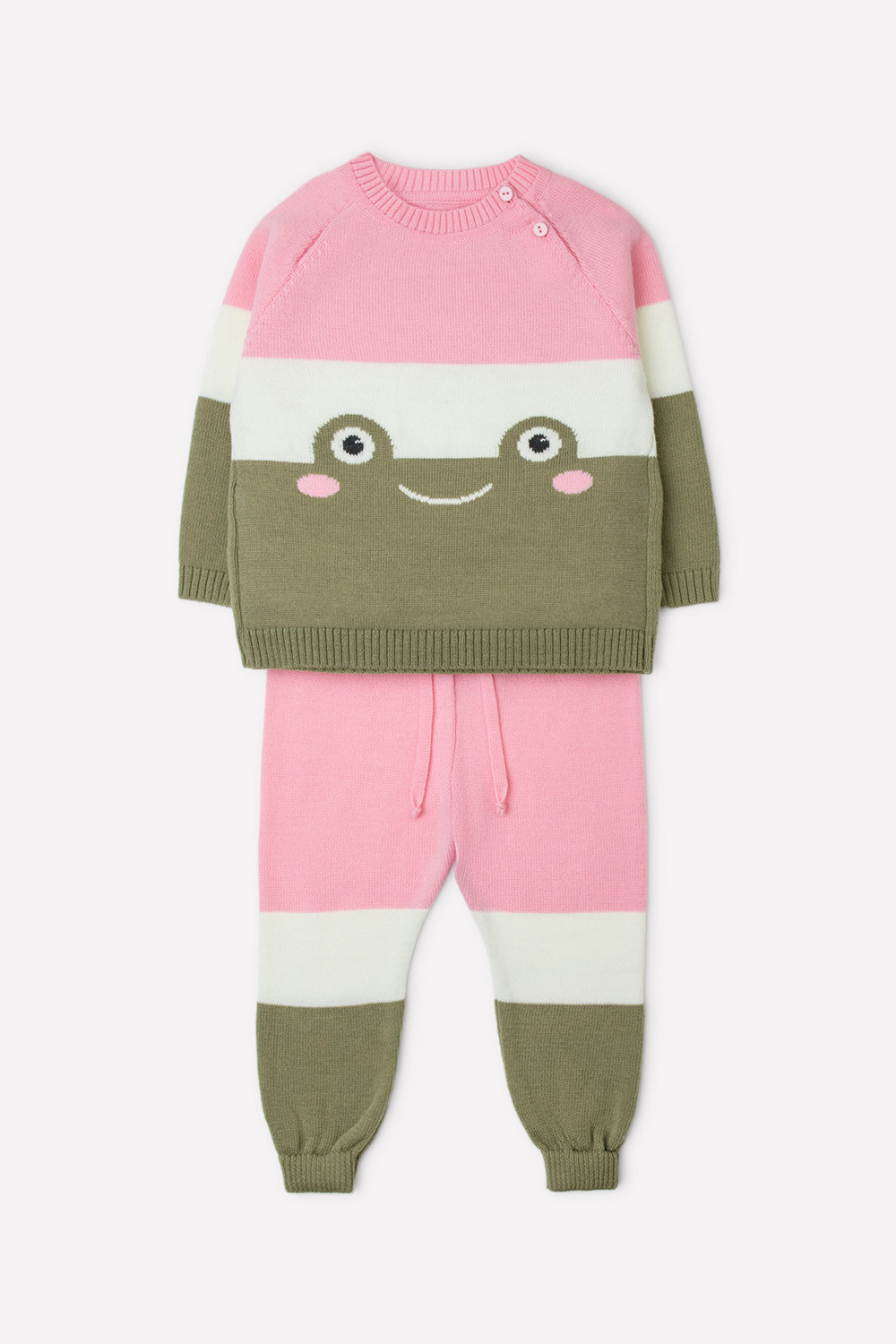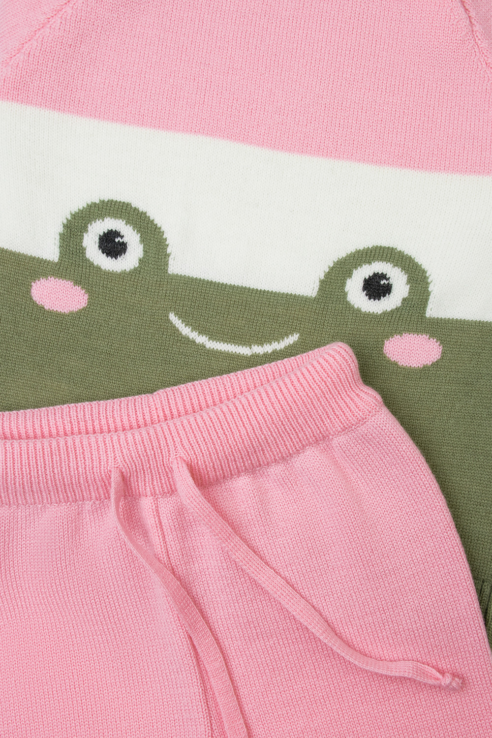 Вязаный комплект из полушерсти: джемпер с круглой горловиной и брюки. Украшен вывязанным узором с изображением мордочки лягушонка и широкими полосами. Джемпер застёгивается на пуговицы спереди на плече. Горловина, манжеты и пояс связаны ластиком. Ширина брюк регулируется с помощью вязаной ленточки.
