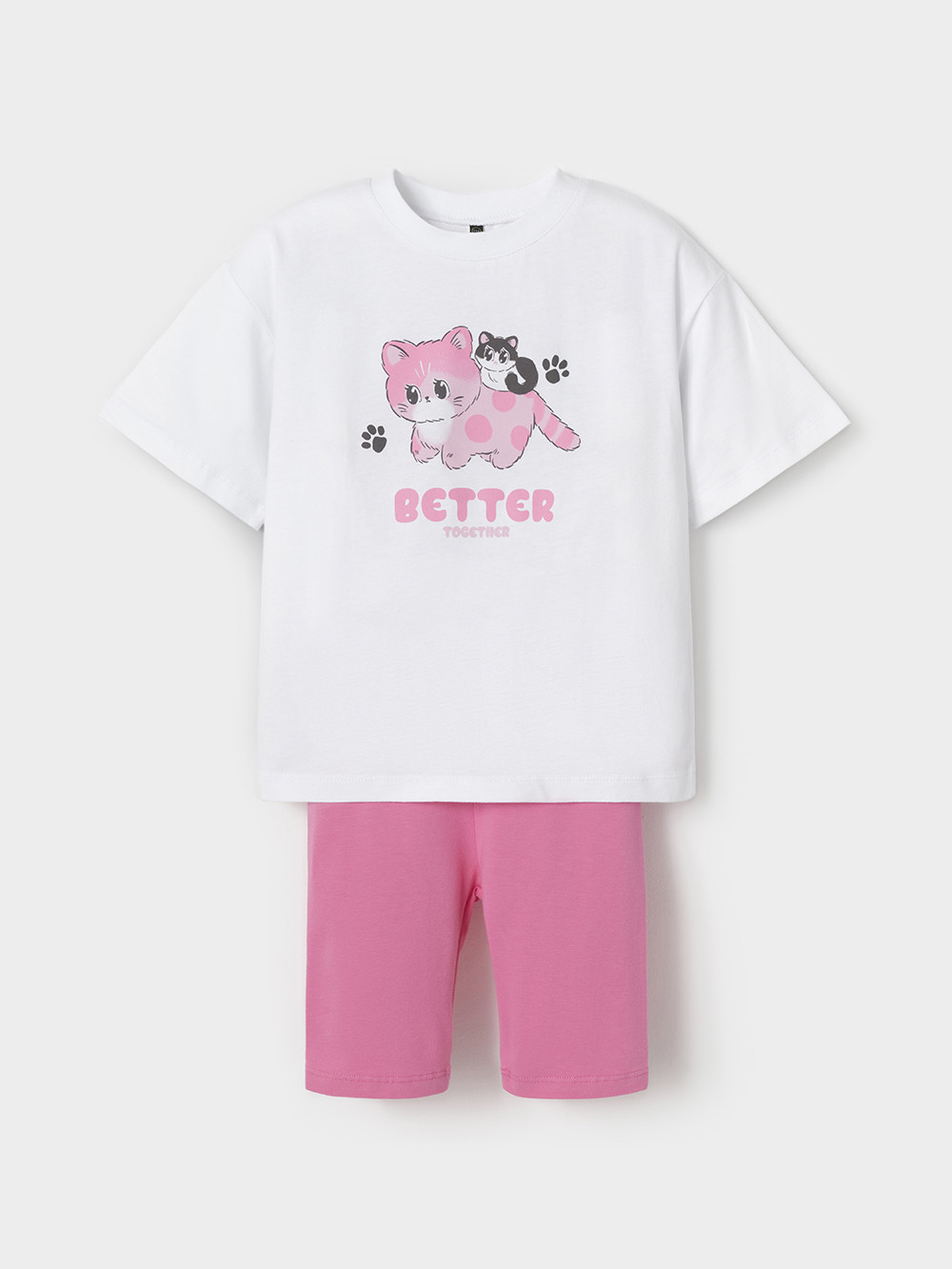 Набор трикотажный для девочки: футболка с короткими спущенными рукавами и велосипедки. Футболка изготовлена из гладкого трикотажа супрем, который произведён из 100% натурального хлопка высокого качества. Велосипедки выполнены из хлопкового трикотажа с небольшим добавлением эластана. Изделия отлично дышат и хорошо тянутся, поэтому не стесняют движения и комфортны для игр и занятий спортом. Оригинальный принт выполнен из стойких текстильных гипоаллергенных красителей. Комплект сохраняет цвет и форму после многократных стирок. Все трикотажные полотна производятся в соответствии с нормами швейцарского сертификата ЭкоТекс.