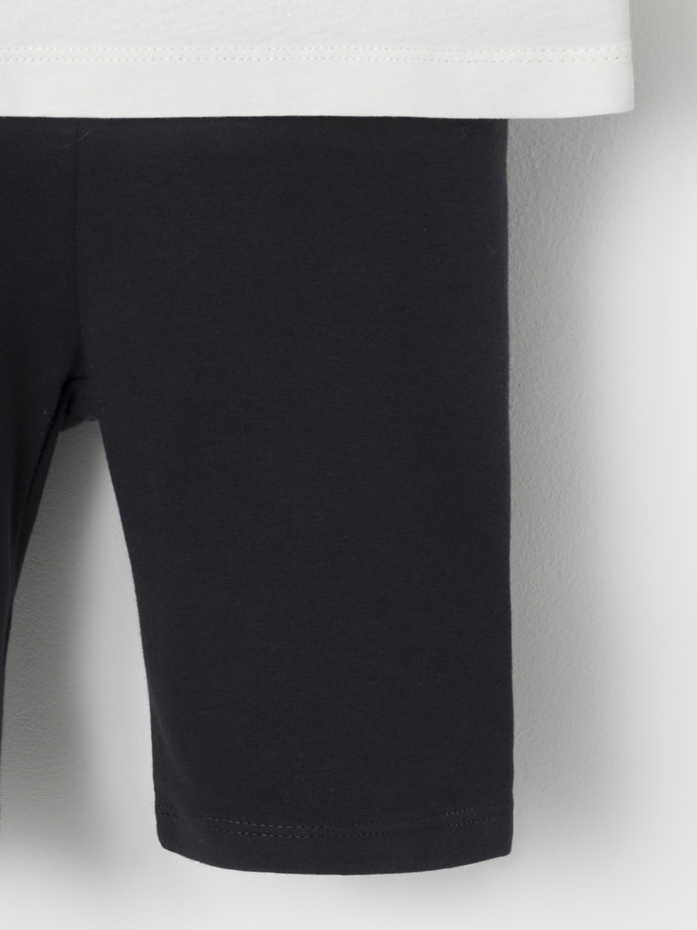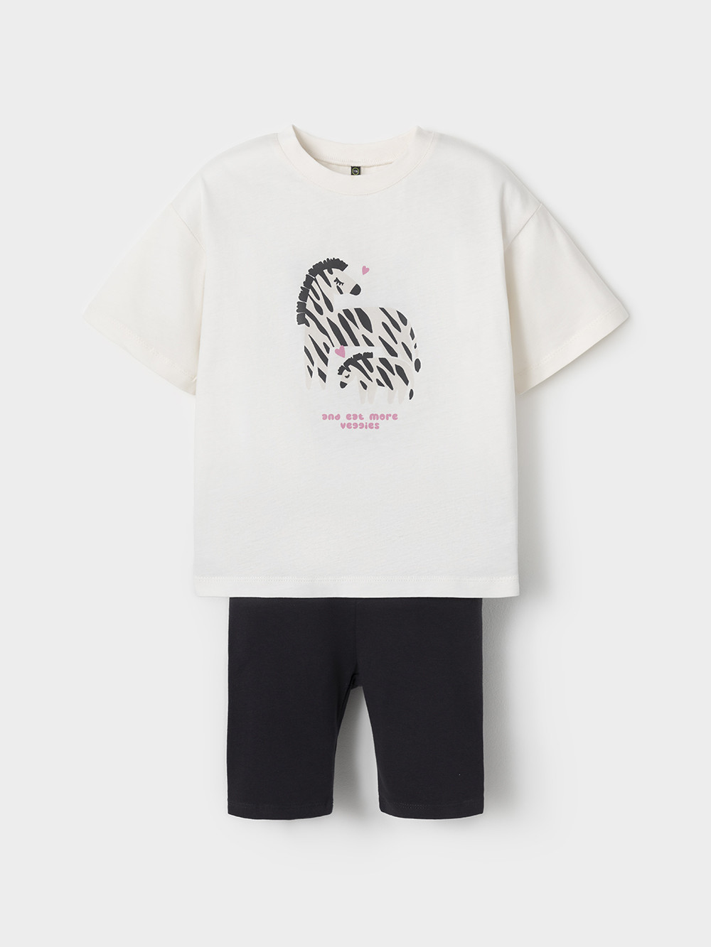 Набор трикотажный для девочки: футболка с короткими спущенными рукавами и велосипедки. Футболка изготовлена из гладкого трикотажа супрем, который произведён из 100% натурального хлопка высокого качества. Велосипедки выполнены из хлопкового трикотажа с небольшим добавлением эластана. Изделия отлично дышат и хорошо тянутся, поэтому не стесняют движения и комфортны для игр и занятий спортом. Оригинальный принт выполнен из стойких текстильных гипоаллергенных красителей. Комплект сохраняет цвет и форму после многократных стирок. Все трикотажные полотна производятся в соответствии с нормами швейцарского сертификата ЭкоТекс.