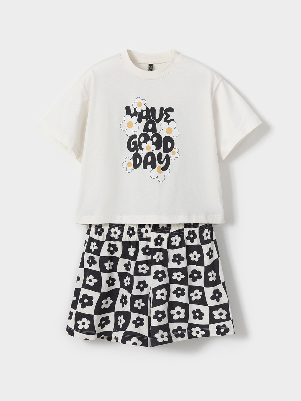 Набор трикотажный для девочки: футболка с короткими спущенными рукавами и свободные шорты. Комплект изготовлен из гладкого трикотажа супрем, который произведён из 100% натурального хлопка высокого качества. Изделия отлично дышат, а свободный крой не стесняет движения, поэтому футболка и шорты комфортны для активных игр, отдыха и занятий спортом. Оригинальный принт и набивка выполнены из стойких текстильных гипоаллергенных красителей. Комплект сохраняет цвет и форму после многократных стирок. Все трикотажные полотна производятся в соответствии с нормами швейцарского сертификата ЭкоТекс.