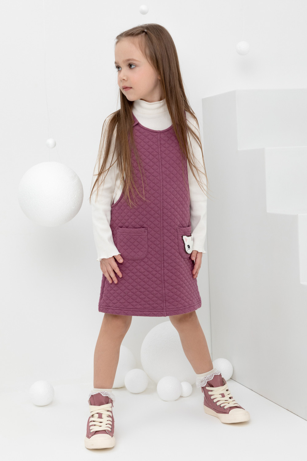 Однотонный сарафан для девочки из капитония, произведённого из натурального хлопка. Изделие имеет два накладных кармана. Лямки застёгиваются спереди на пуговицы. Сарафан сохраняет цвет и форму после многократных стирок. Капитоний - это стёганное трикотажное полотно с утеплителем из полиэстеровой нити.